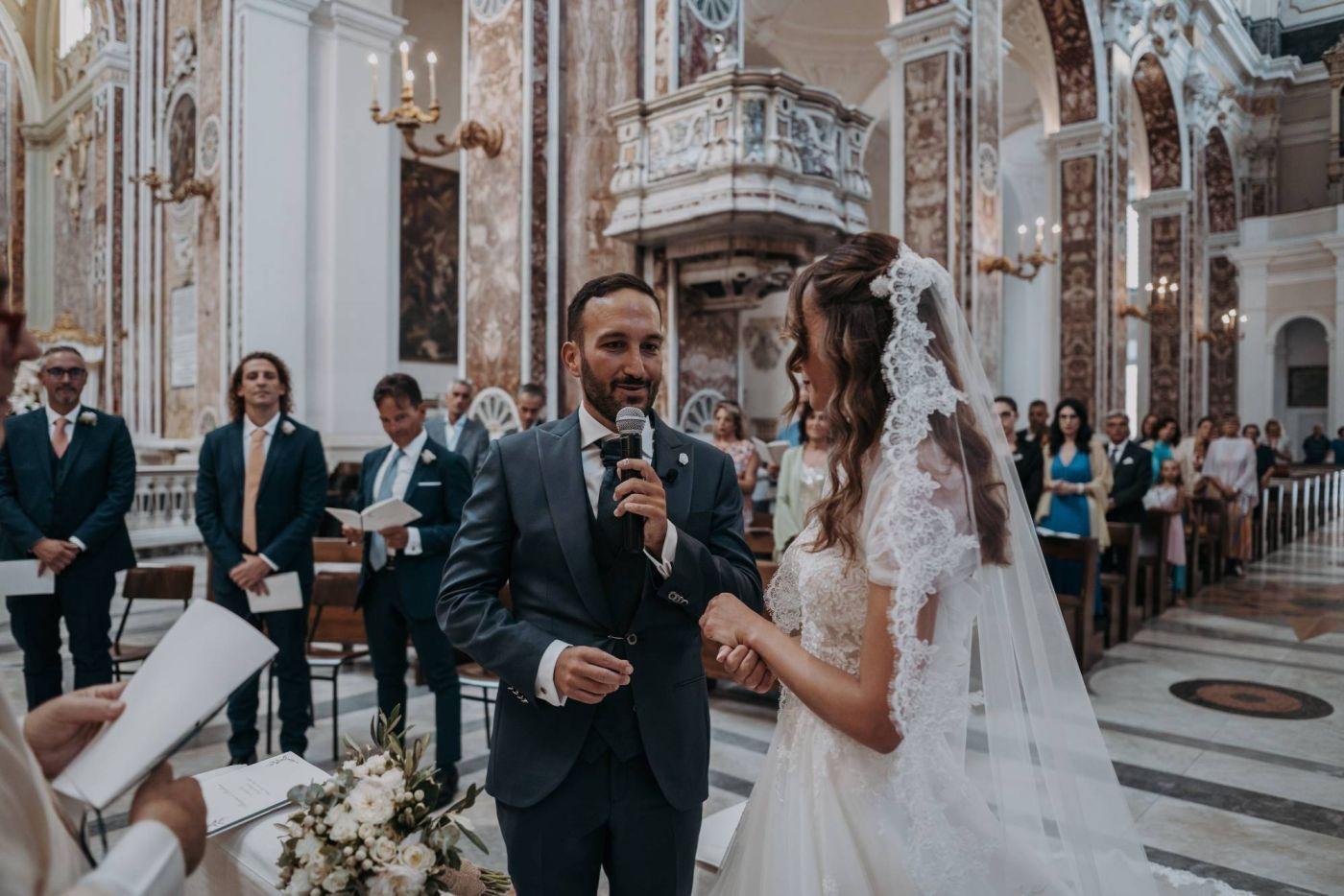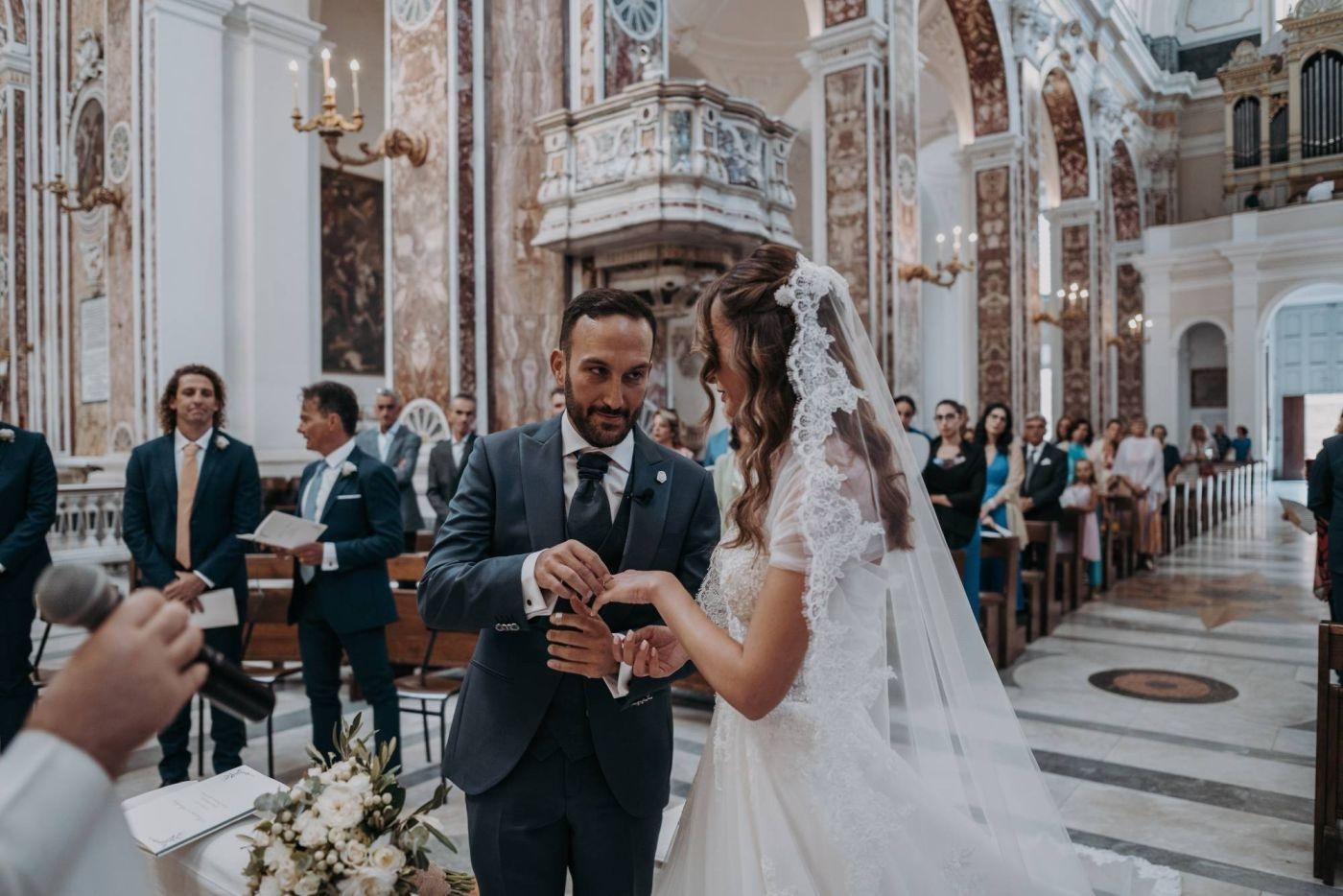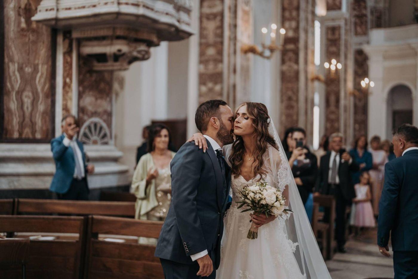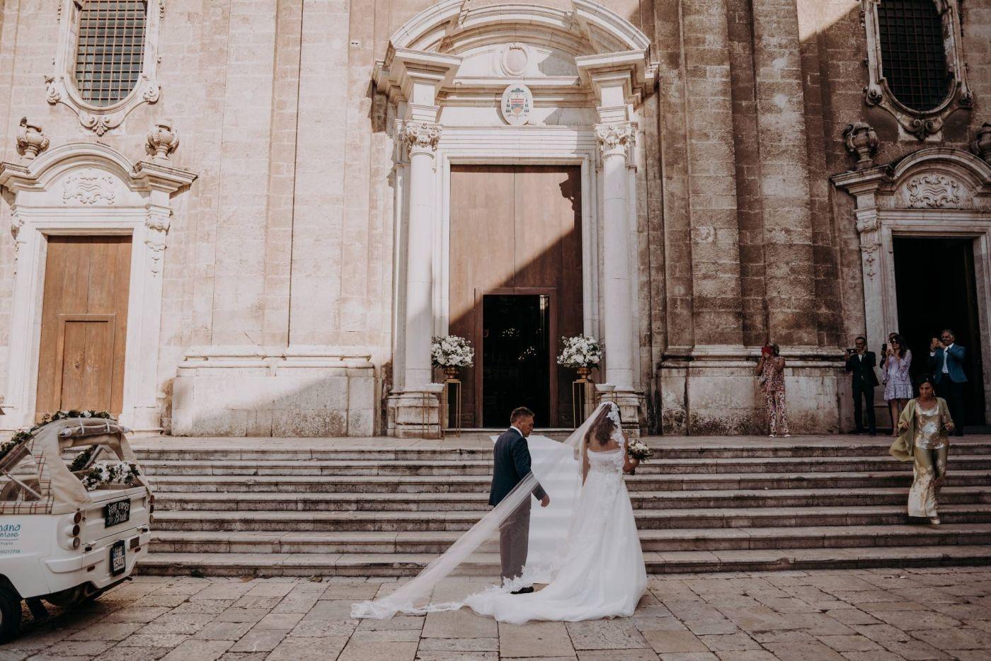 The wedding was one of the most important days in Martina and Massimo's life. After months of preparations, everything was finally ready for the celebration. Monopoli cathedral was a magnificent place, with its high vaults, frescoes and stained glass windows. Martina, dressed in white, was splendid: her lace dress fell softly on her hips, her hair was gathered in an elegant bun and her face illuminated by a radiant smile. Massimo, beside her, was excited but happy. He had been looking forward to this day and now that he had finally arrived, he knew he had made the right choice.