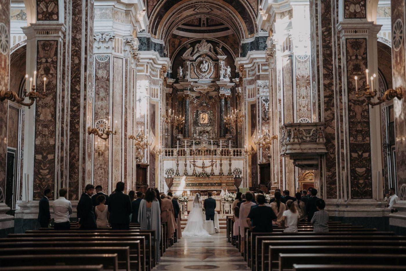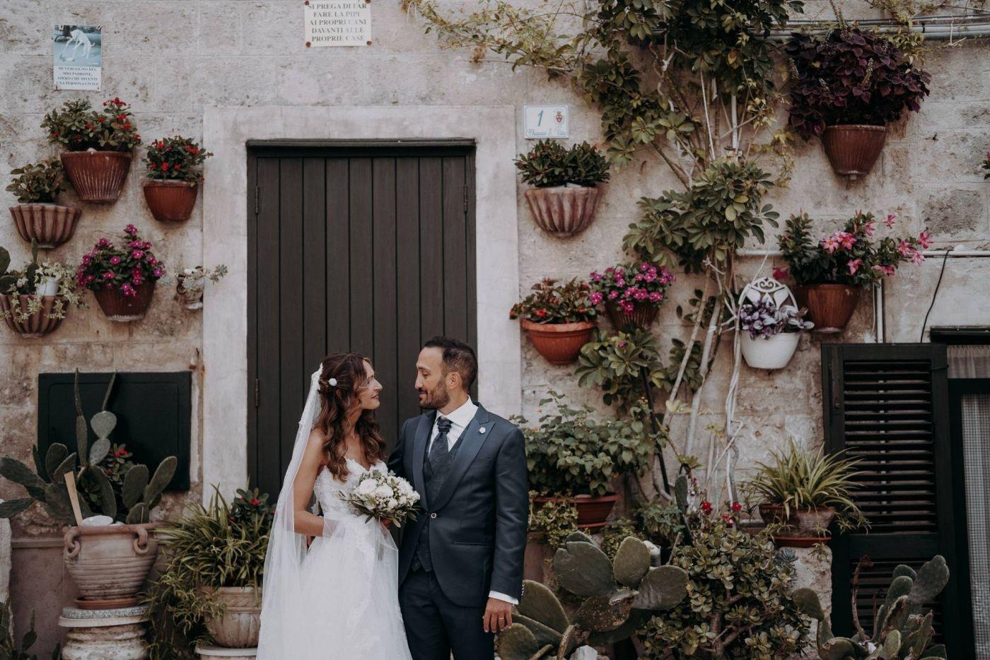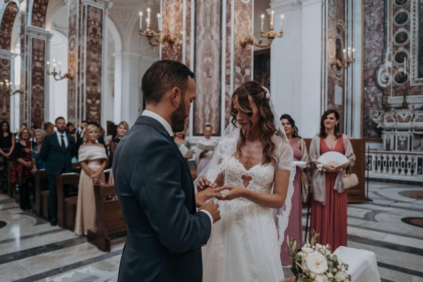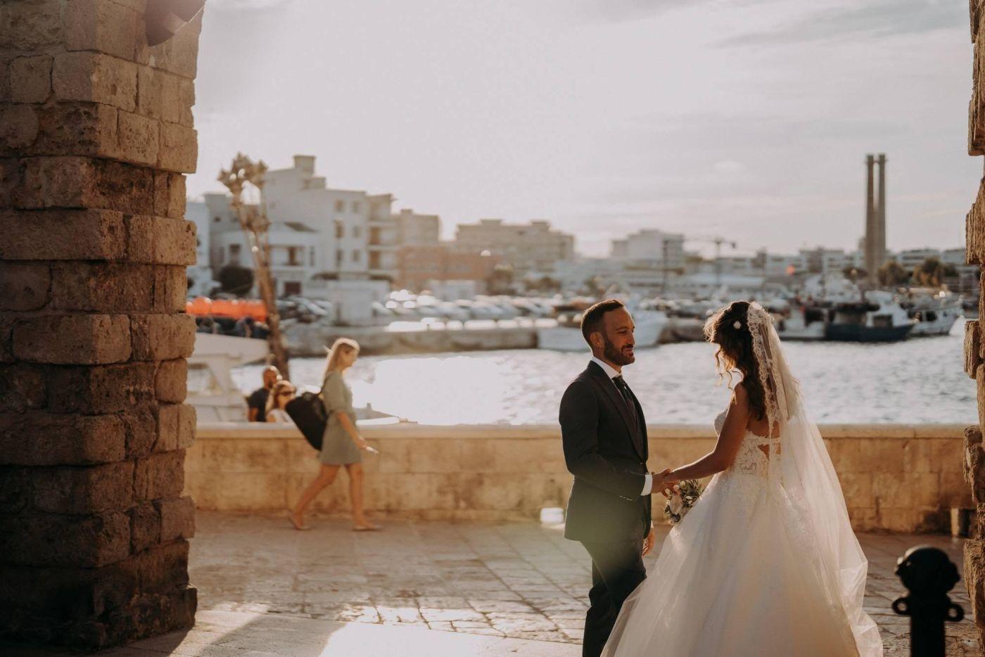 The wedding was one of the most important days in Martina and Massimo's life. After months of preparations, everything was finally ready for the celebration. Monopoli cathedral was a magnificent place, with its high vaults, frescoes and stained glass windows. Martina, dressed in white, was splendid: her lace dress fell softly on her hips, her hair was gathered in an elegant bun and her face illuminated by a radiant smile. Massimo, beside her, was excited but happy. He had been looking forward to this day and now that he had finally arrived, he knew he had made the right choice.