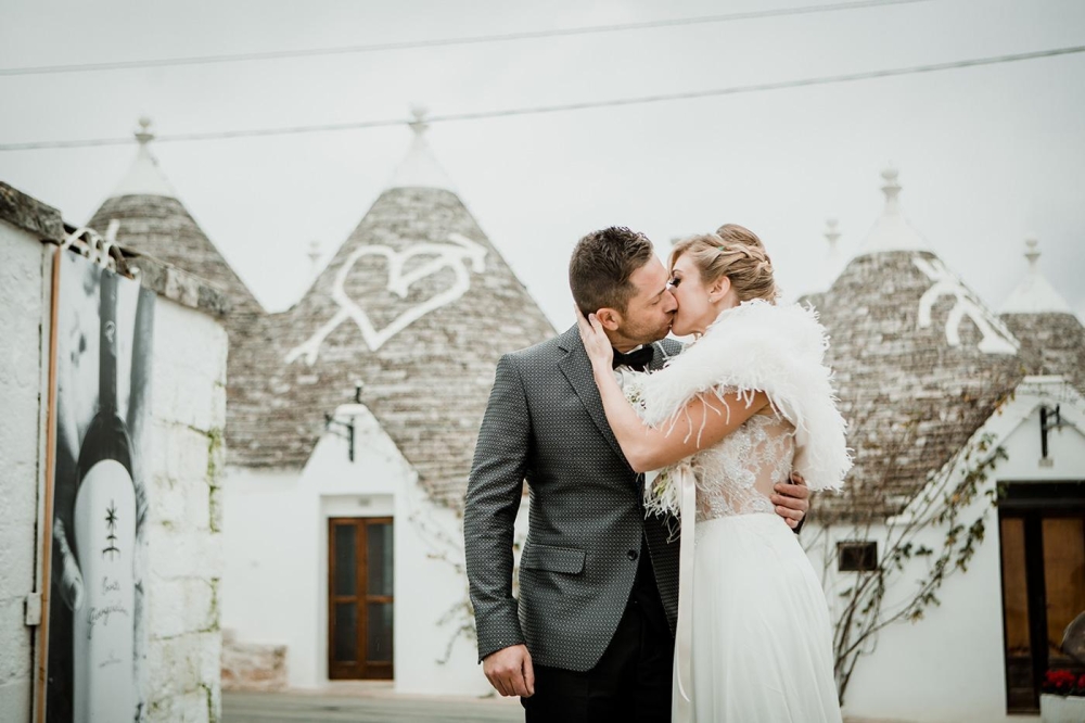 Once we had celebrated the ceremony and left the church, we decided to take the photo shoot in the open air, among the characteristic alleys of the historical centre of Ostuni, and then also in the heart of the small town of Alberobello, known all over the world for its very particular Trulli. And here, a little by chance and a little because we searched for it, a real magic happened. The soft colours of the pearl grey sky, just veiled by a light drizzle, combined perfectly with the white of the bride's dress, the white colour of the alleys of the old town centre of the Ostuni Città Bianca and the blue of the eyes in love of the couple. It was an idyll. A perfect combination of architecture, beauty and charm. And we were lucky enough to immortalise all this in the shots of the couple's wedding.