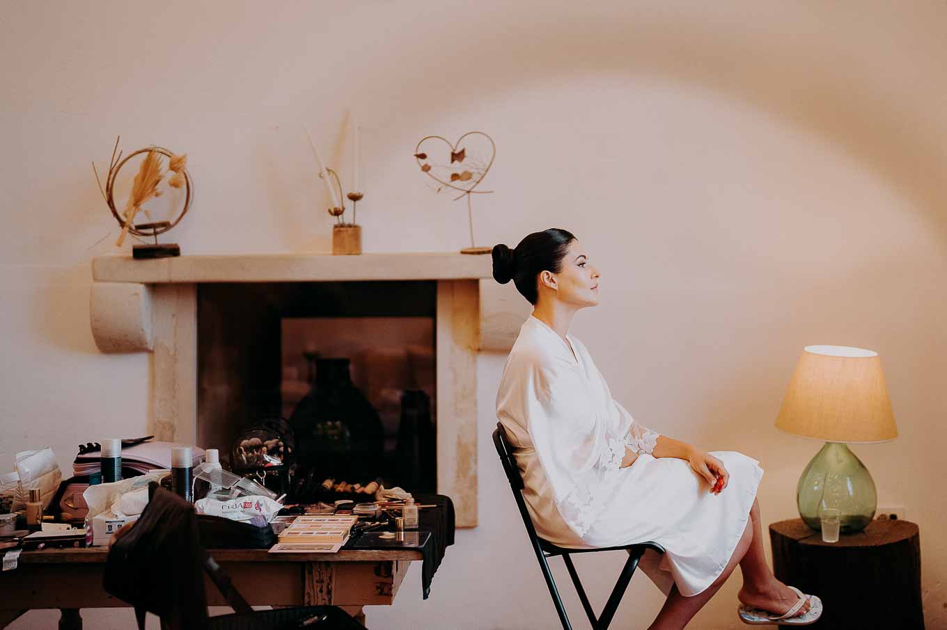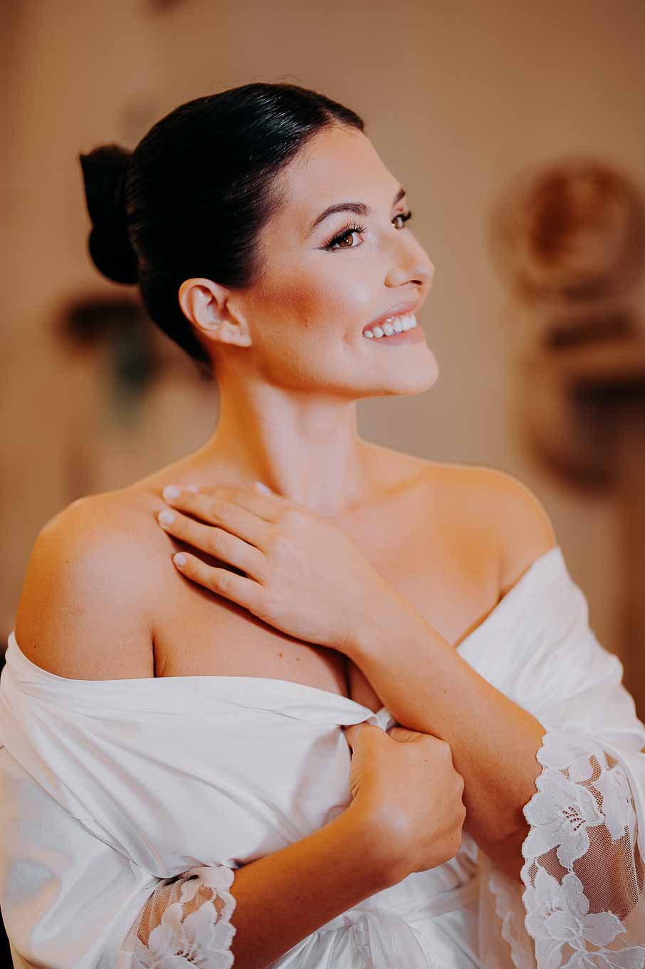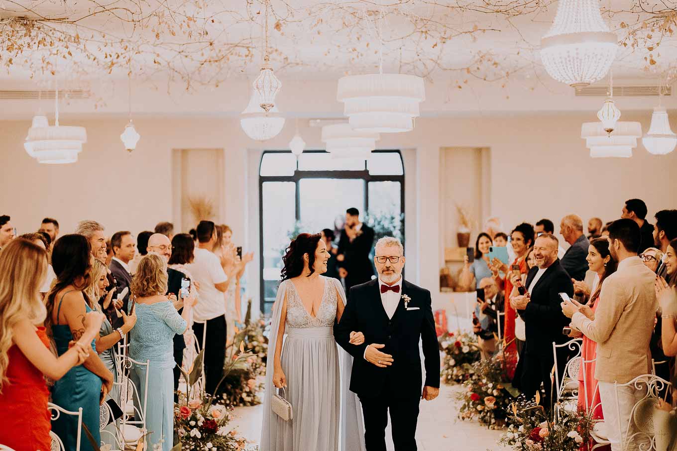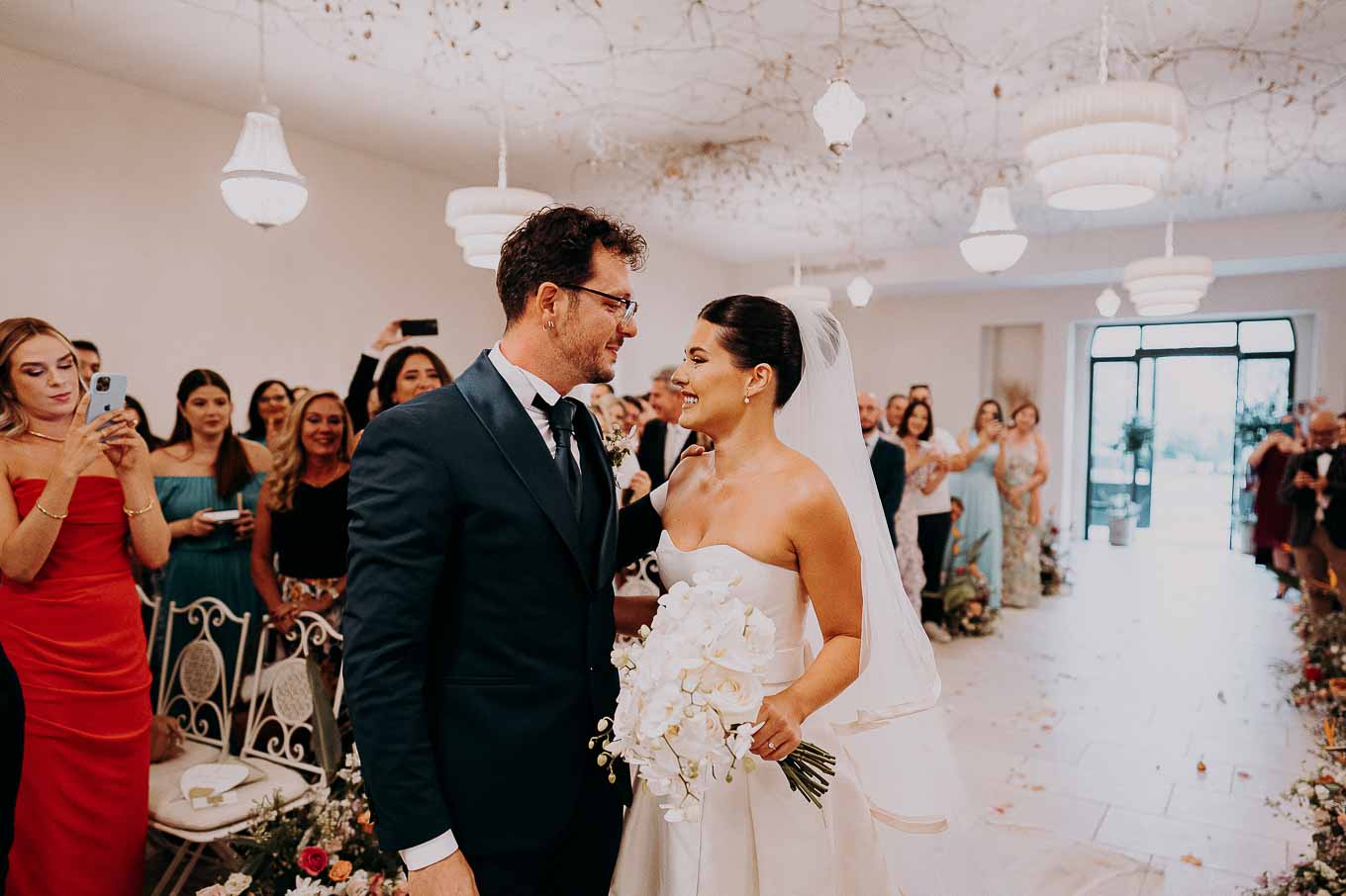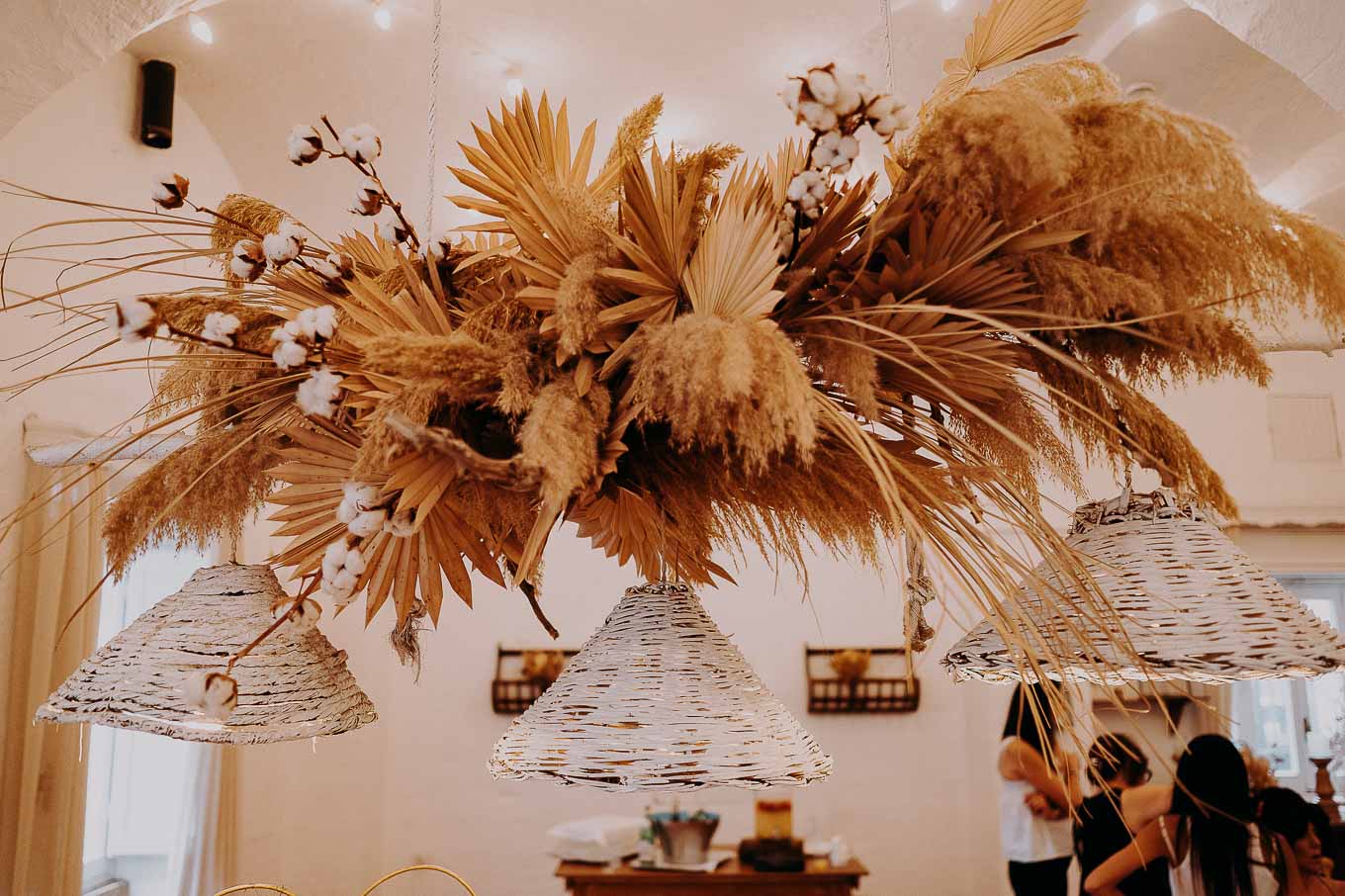 The wedding took place in September, a month where the light in Puglia softens into gold, and the air carries the last warmth of summer. Although rain visited the estate that day, it did nothing to dampen the spirit of celebration. The ceremony, originally planned outdoors, was elegantly moved to the estate’s indoor hall a rustic yet refined space where wooden beams, stone walls, and candlelight created an intimate and magical atmosphere.