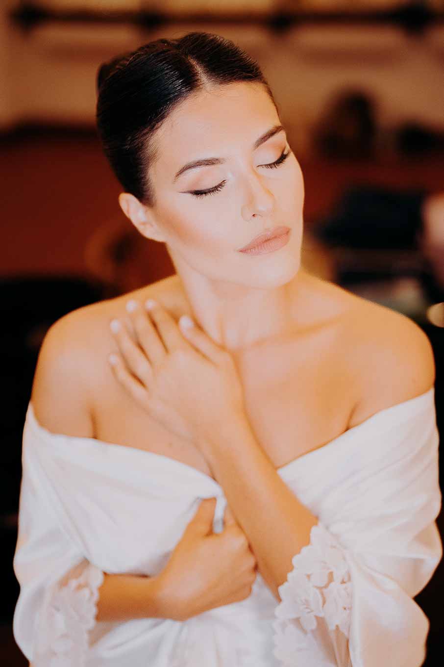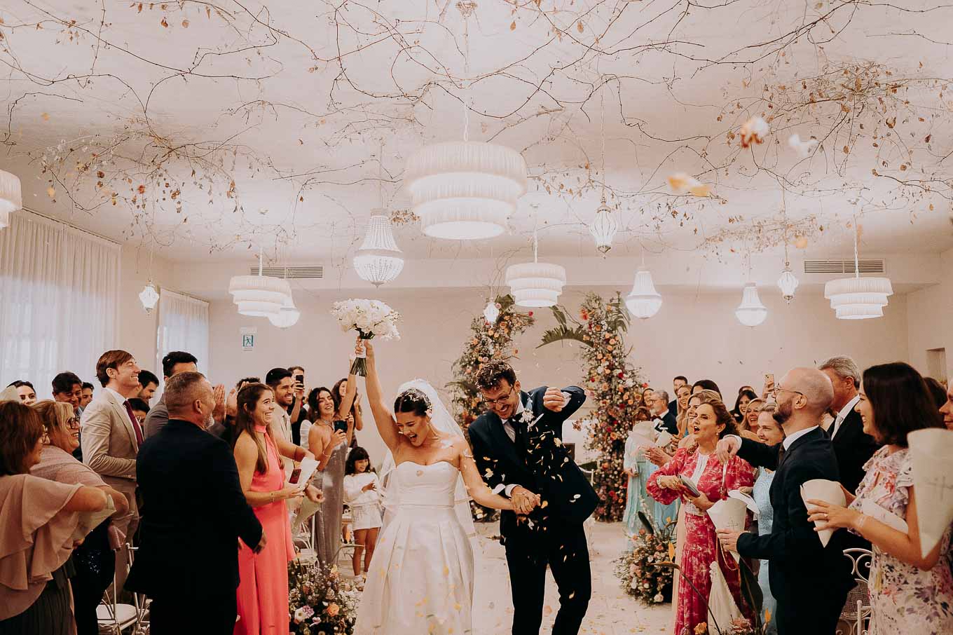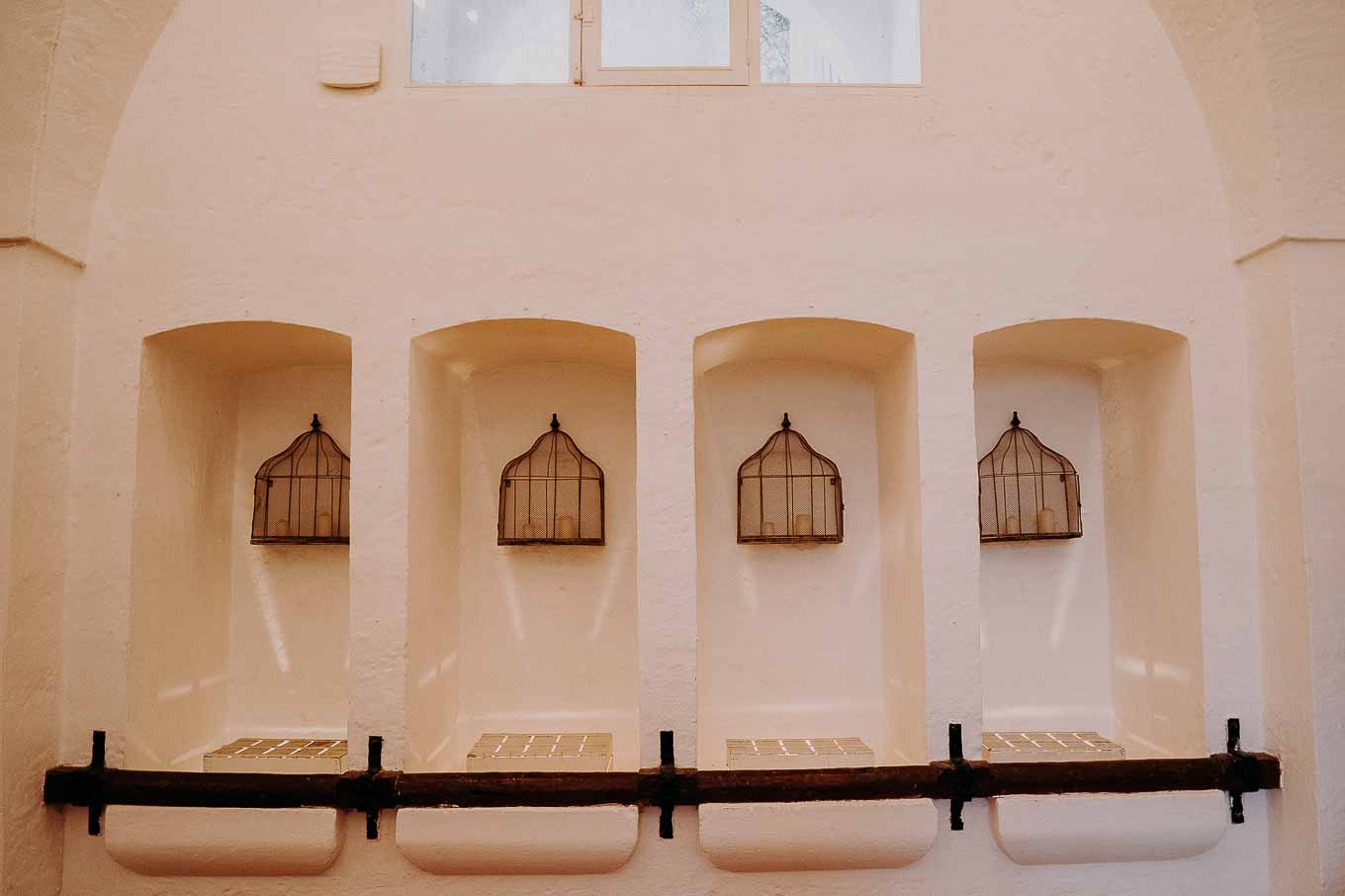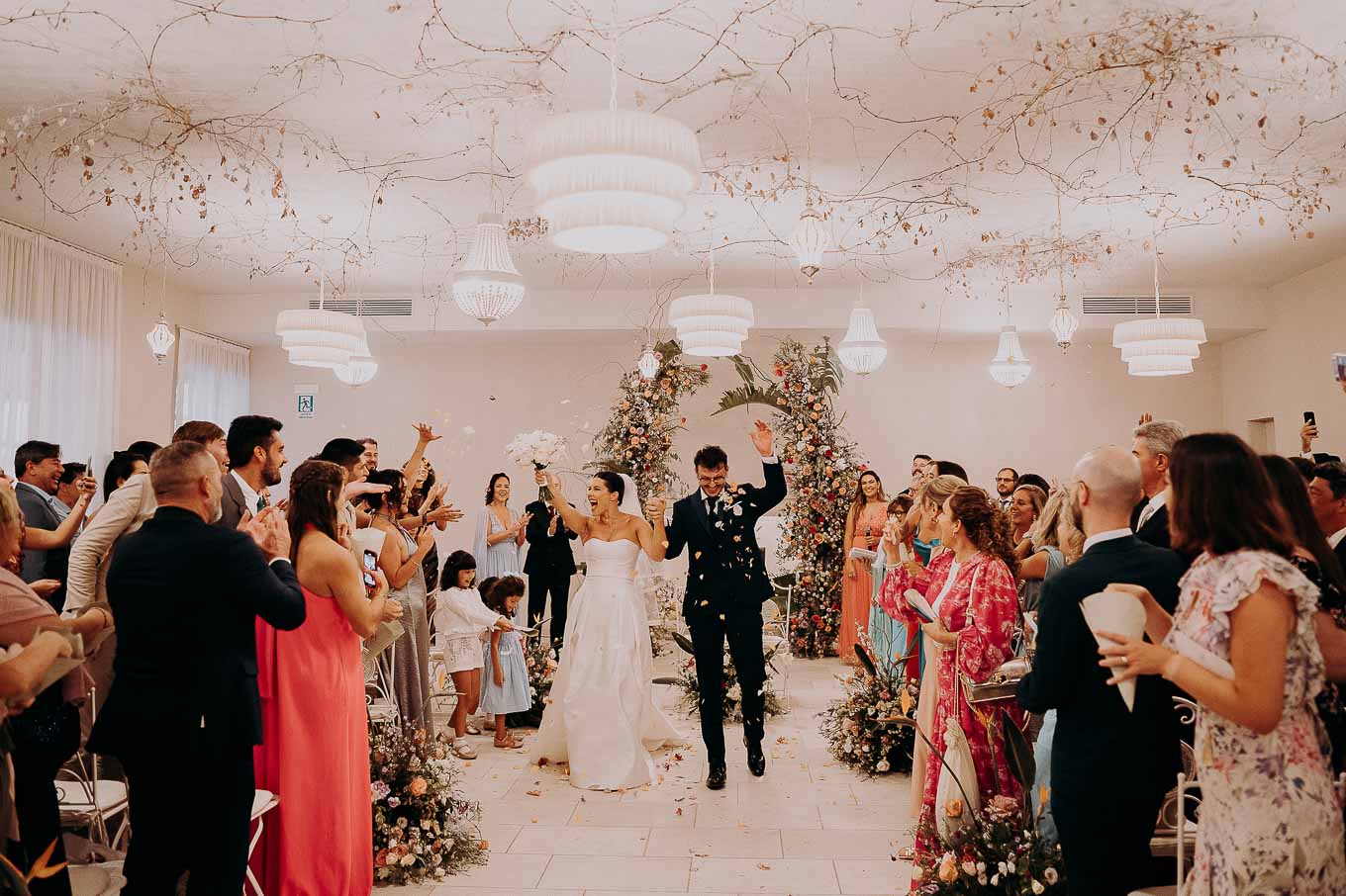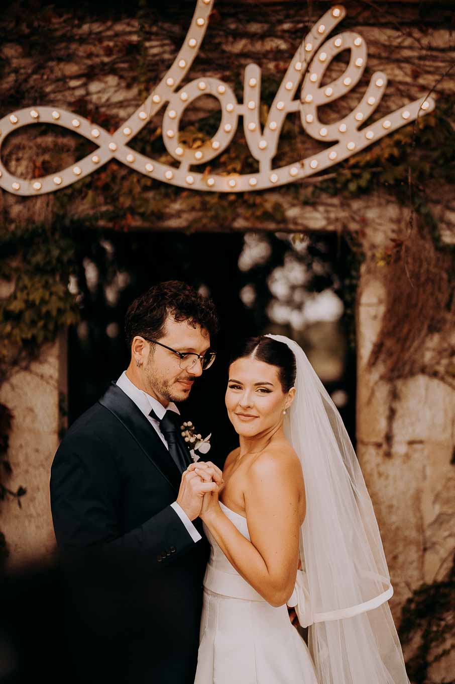 The wedding took place in September, a month where the light in Puglia softens into gold, and the air carries the last warmth of summer. Although rain visited the estate that day, it did nothing to dampen the spirit of celebration. The ceremony, originally planned outdoors, was elegantly moved to the estate’s indoor hall a rustic yet refined space where wooden beams, stone walls, and candlelight created an intimate and magical atmosphere.