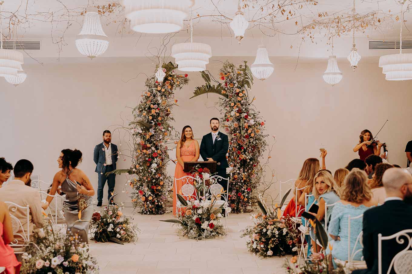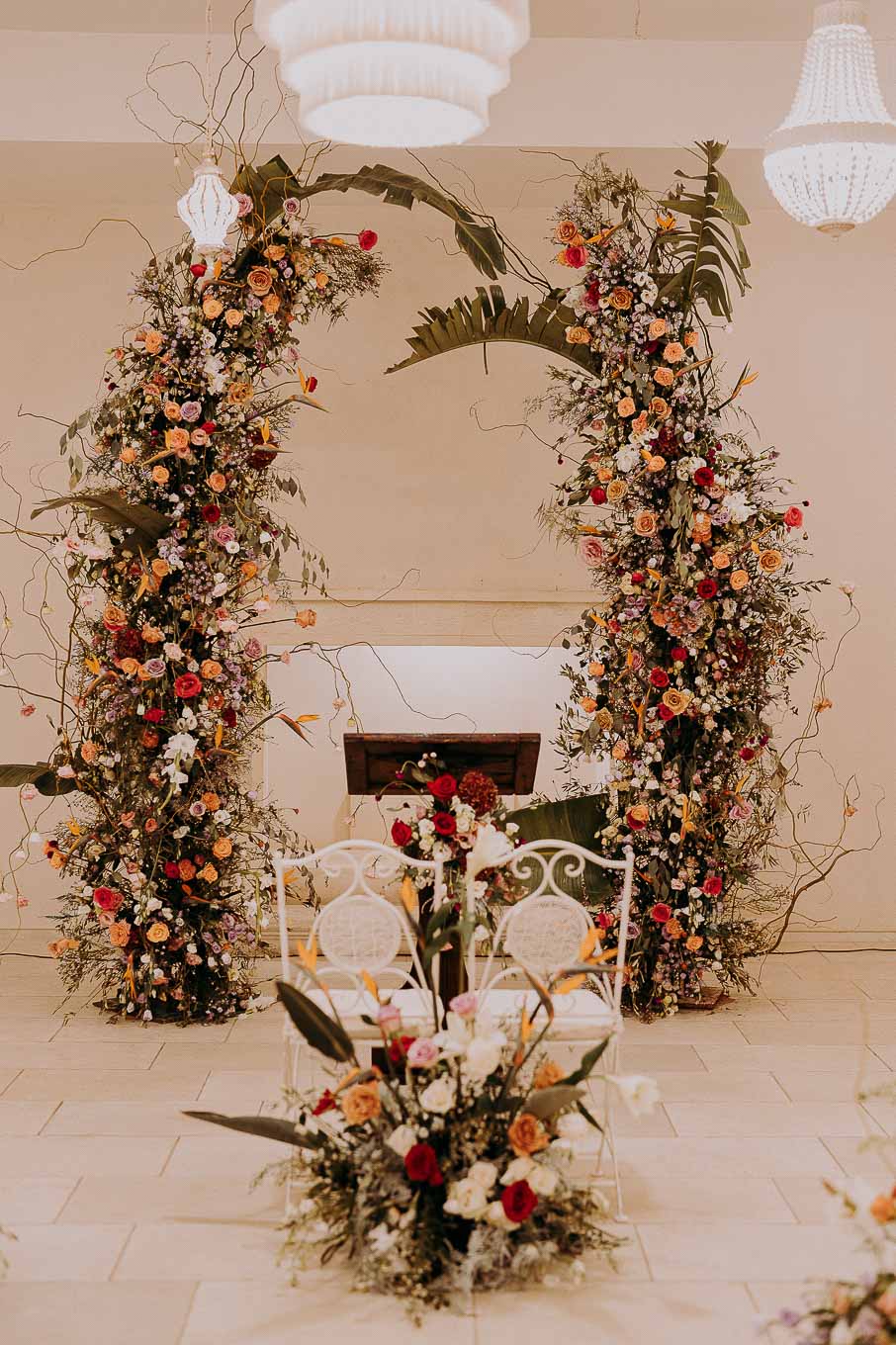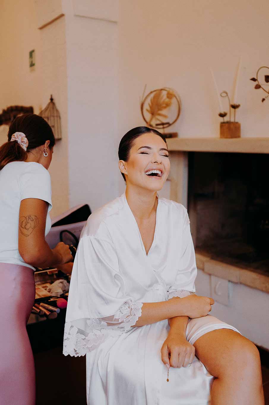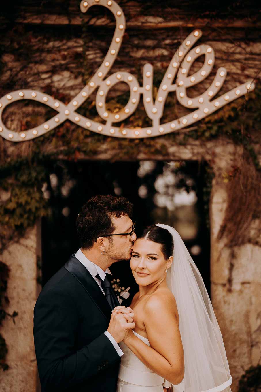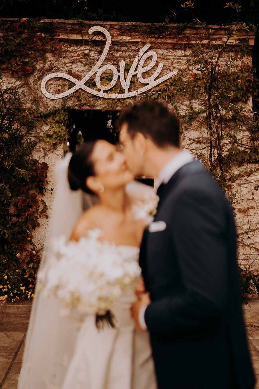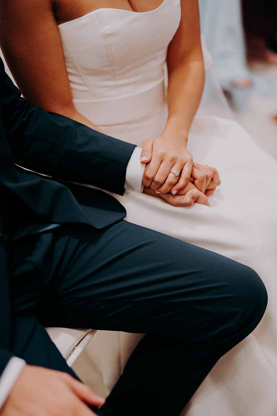 The wedding took place in September, a month where the light in Puglia softens into gold, and the air carries the last warmth of summer. Although rain visited the estate that day, it did nothing to dampen the spirit of celebration. The ceremony, originally planned outdoors, was elegantly moved to the estate’s indoor hall a rustic yet refined space where wooden beams, stone walls, and candlelight created an intimate and magical atmosphere.