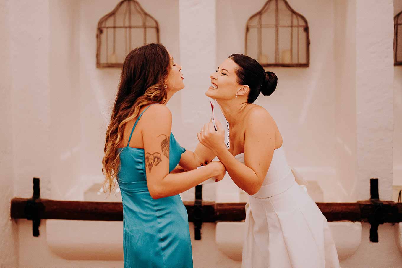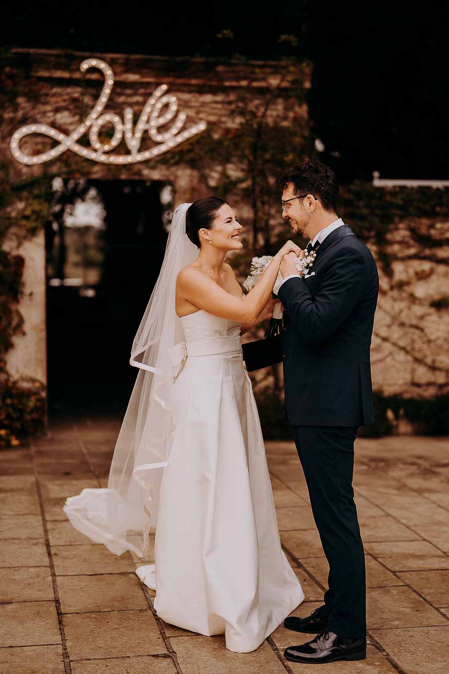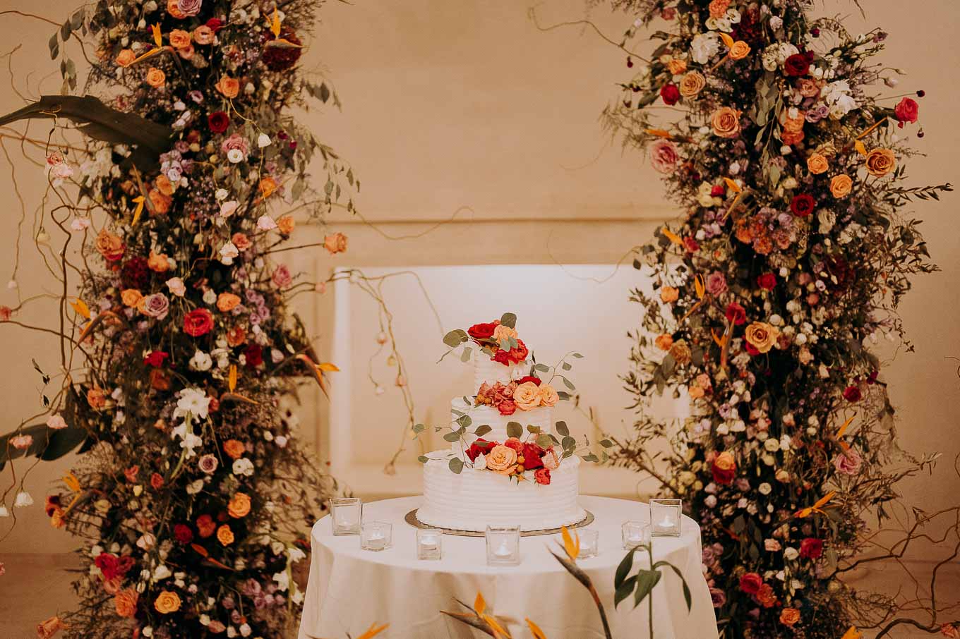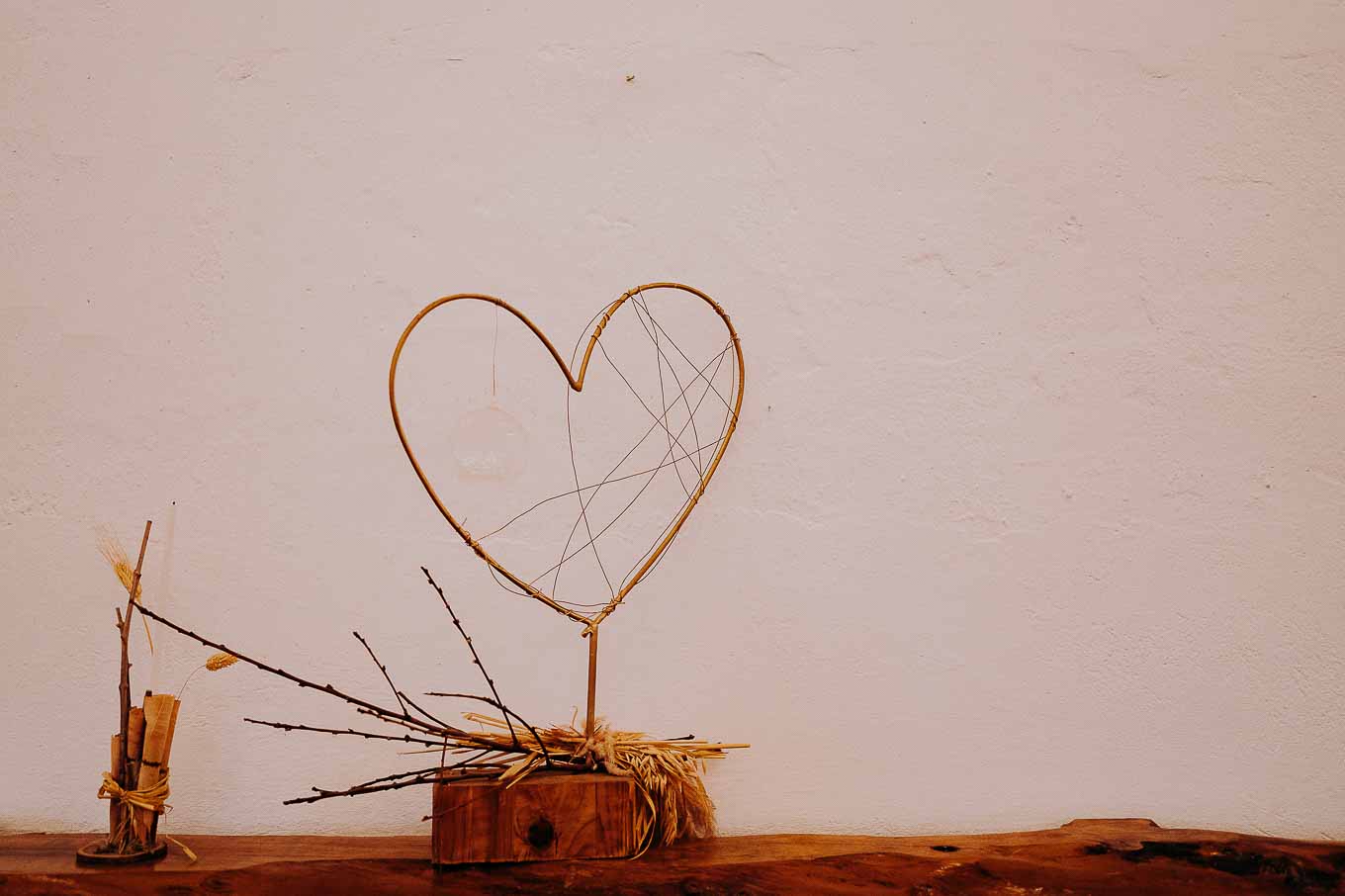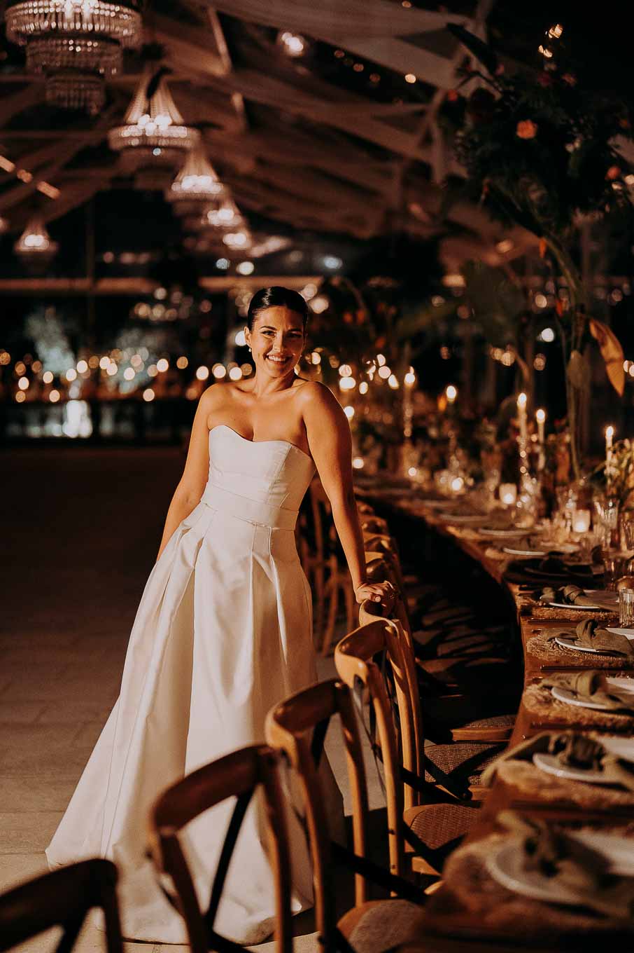 The wedding took place in September, a month where the light in Puglia softens into gold, and the air carries the last warmth of summer. Although rain visited the estate that day, it did nothing to dampen the spirit of celebration. The ceremony, originally planned outdoors, was elegantly moved to the estate’s indoor hall a rustic yet refined space where wooden beams, stone walls, and candlelight created an intimate and magical atmosphere.