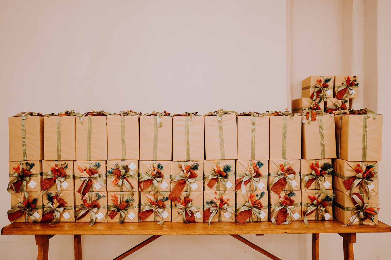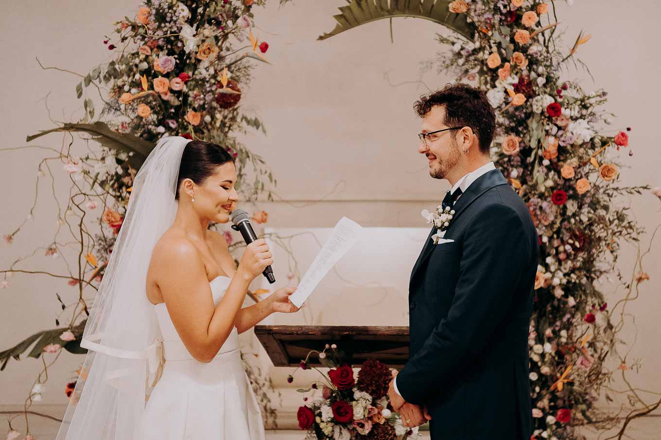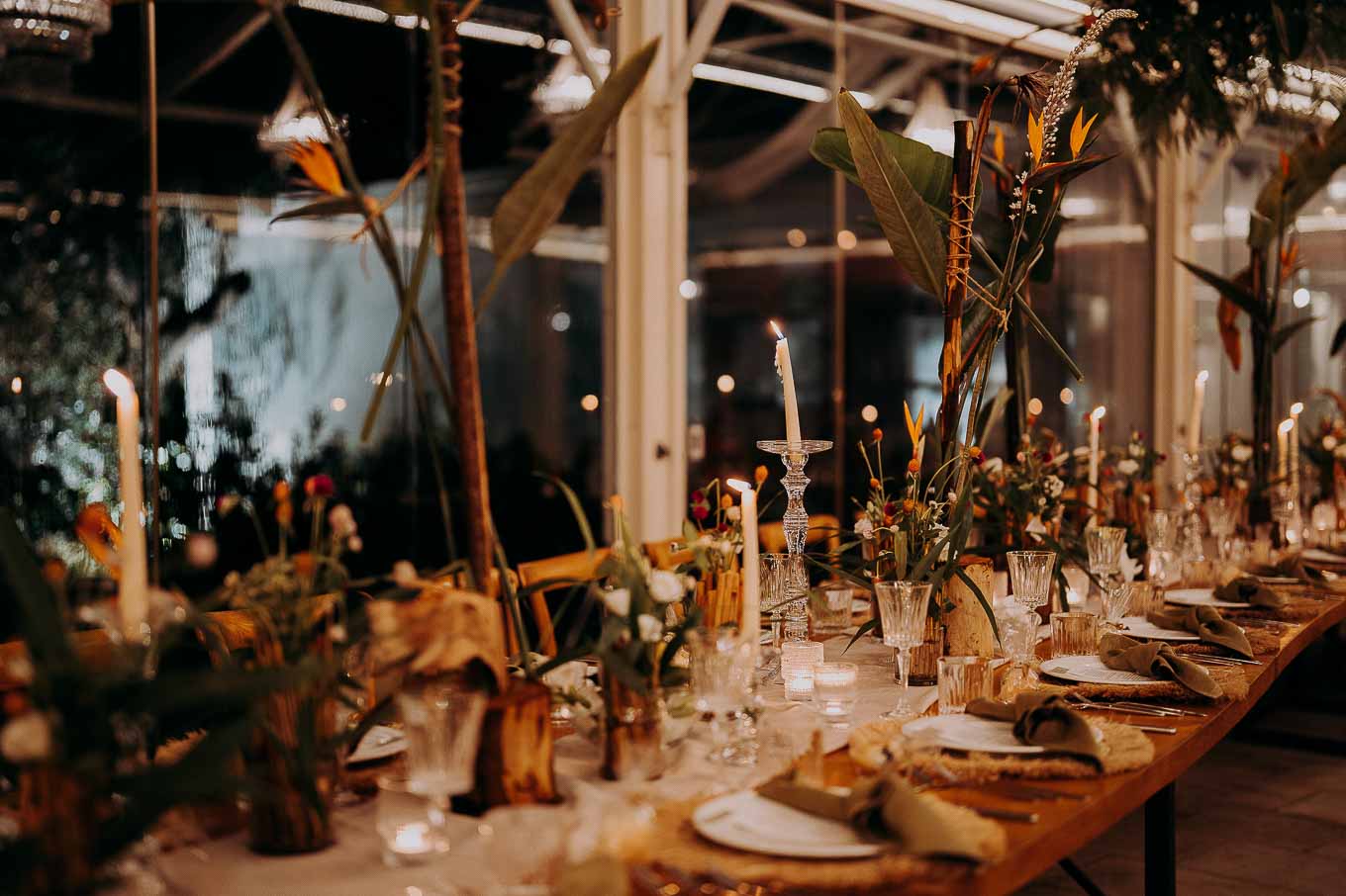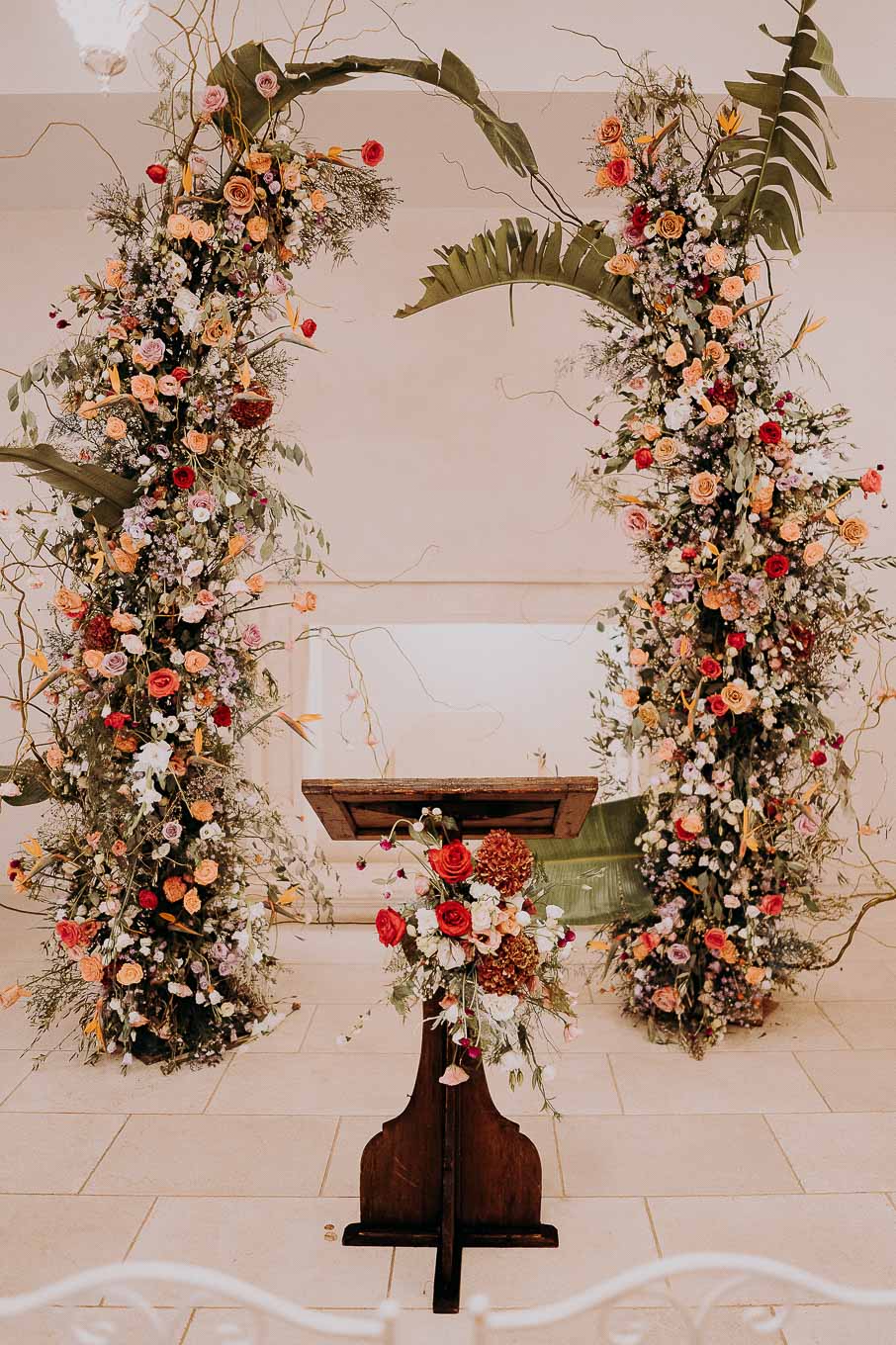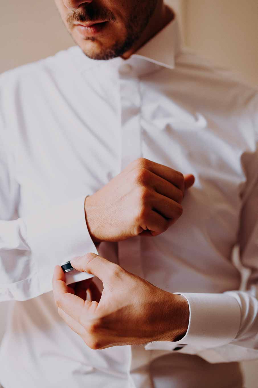 The wedding took place in September, a month where the light in Puglia softens into gold, and the air carries the last warmth of summer. Although rain visited the estate that day, it did nothing to dampen the spirit of celebration. The ceremony, originally planned outdoors, was elegantly moved to the estate’s indoor hall a rustic yet refined space where wooden beams, stone walls, and candlelight created an intimate and magical atmosphere.