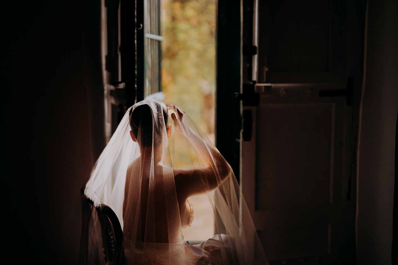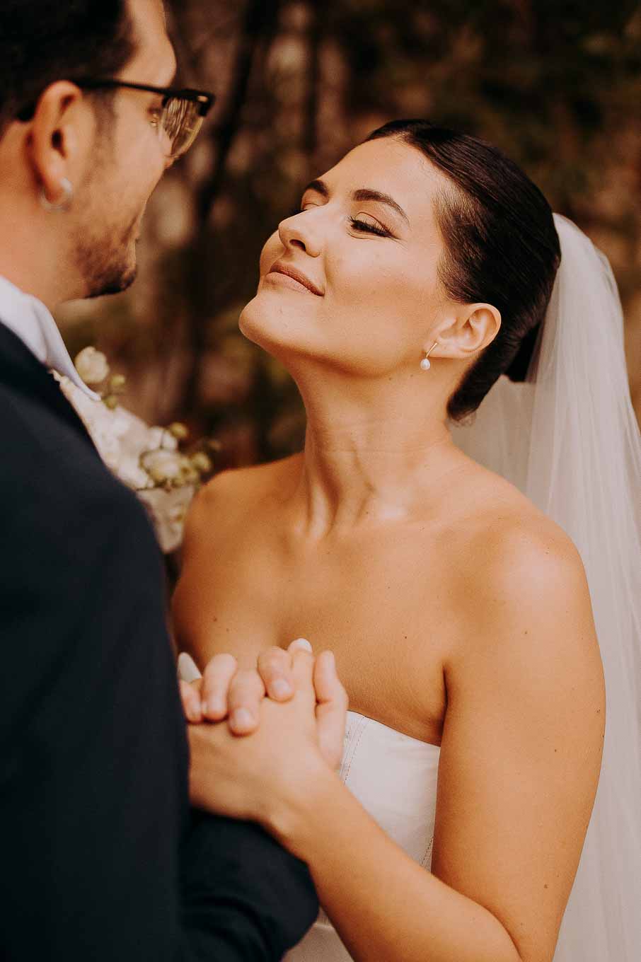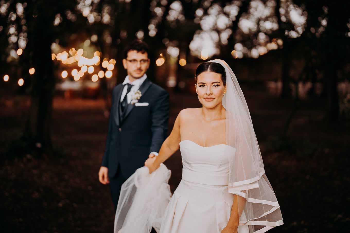 After the ceremony, as the rain eased into a soft drizzle, Isabela and Salvatore stepped into the forest that surrounds the estate a lush, centuries-old oak woodland that Tenuta Tresca lovingly preserves. Here, in the quiet green of nature, they enjoyed a private photo session. The sound of leaves, the earthy scent of wet soil, and the soft light filtering through the trees created a dreamlike backdrop for capturing the first peaceful moments as newlyweds.