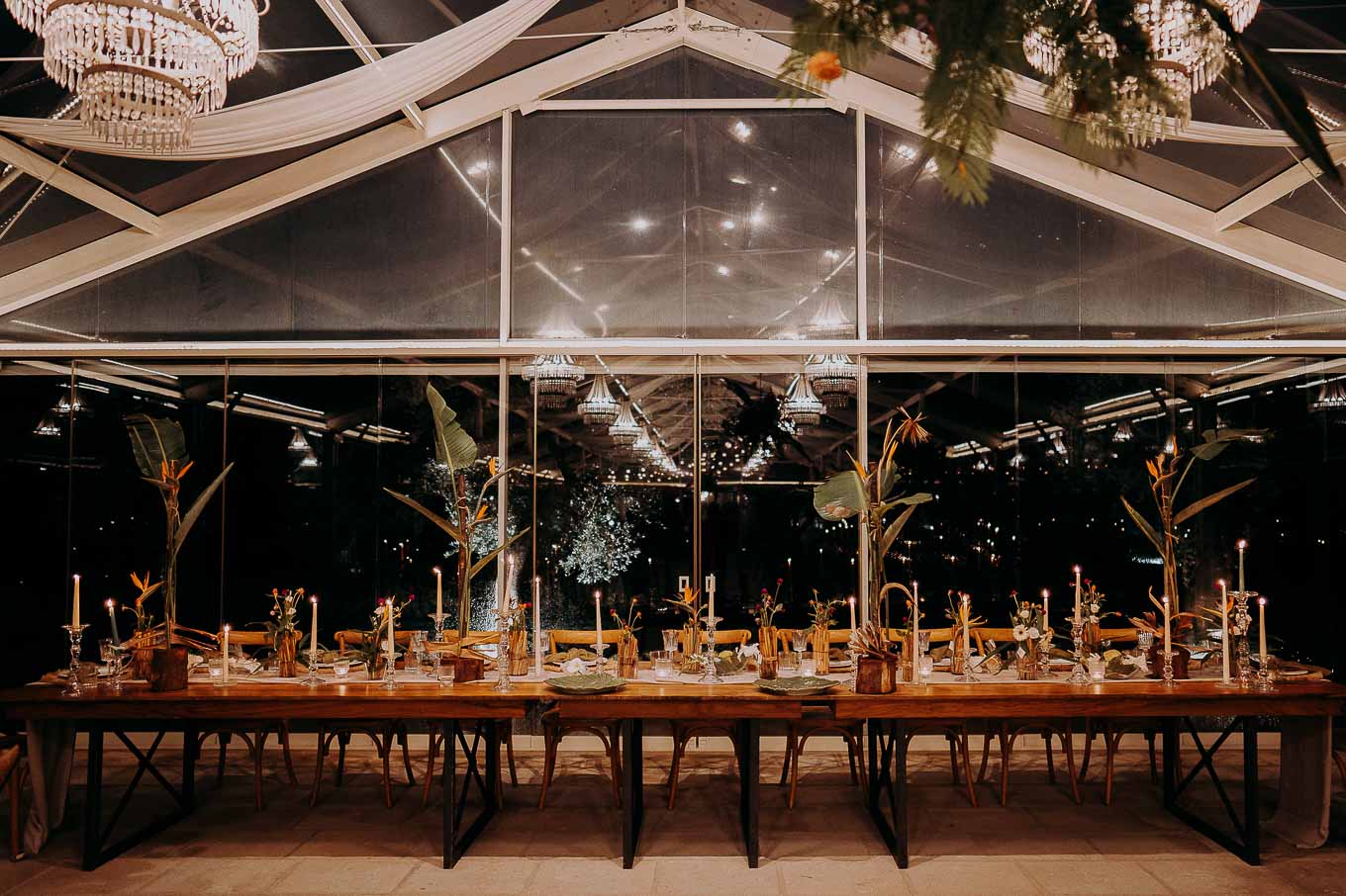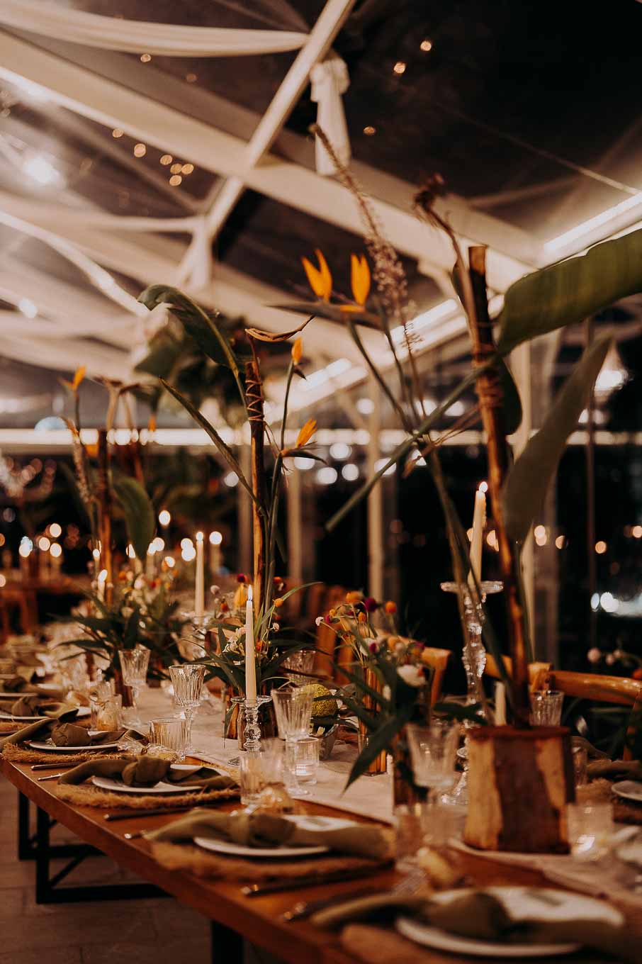 The celebration continued with an elegant dinner inside the estate’s reception area. Twinkling lights draped from wooden beams, soft linen tablecloths, and carefully arranged floral decor created a fairy tale ambiance. Despite the rain, the atmosphere remained vibrant filled with laughter, toasts, and heartfelt speeches.