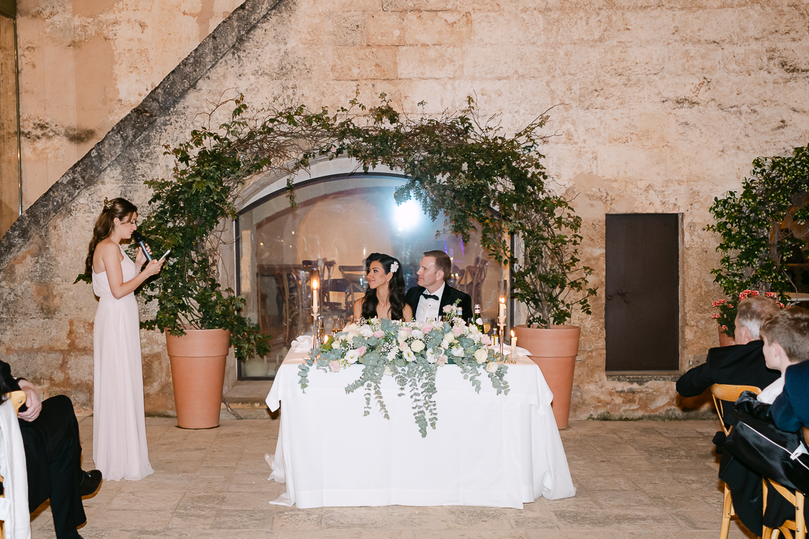 The ceremony took place in a natural amphitheater among ancient olive trees, with a view stretching across the golden countryside. Catherine walked gracefully in a light, floral-detailed gown, while Adam waited under a rustic floral arch, beaming. Their vows were personal and deeply felt — a mix of tender tears and joyful smiles, in a setting that felt straight out of a dream.