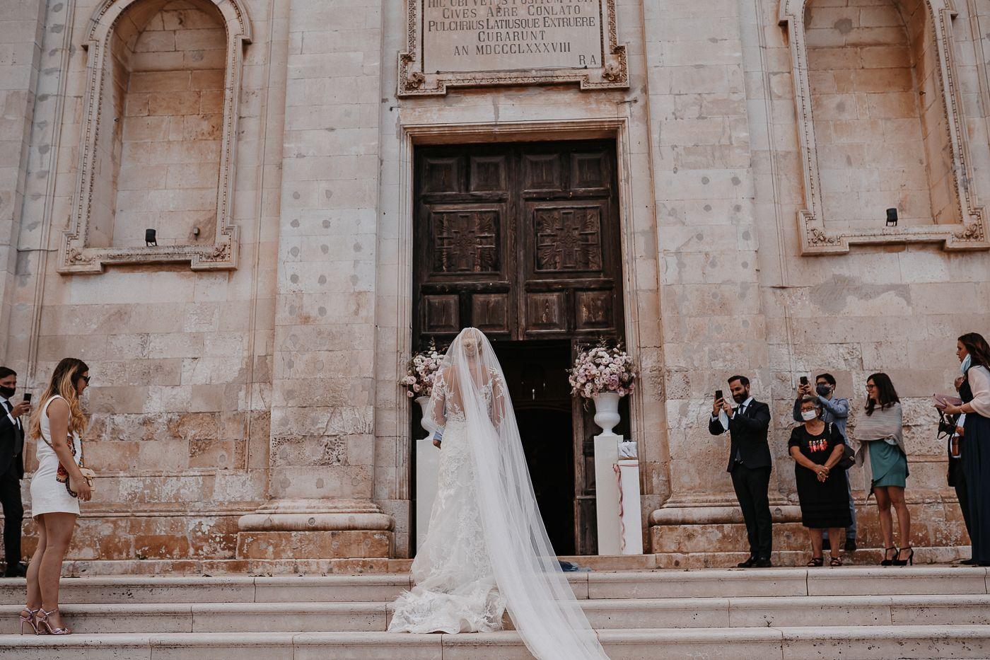The wedding of Sandra and Giuseppe was very suggestive, not only for the period in which they celebrated it, sign of a rebirth after very sad days, but also for the wonderful location that hosted the wedding, i.e. the church of San Rocco Ceglie in Messapica. The bride and groom did not want to give up their most important day and celebrated the wedding following all the provisions included in the regional ordinance, dedicated to weddings, which provides for the use of masks and social distancing between non-cohabiting people.