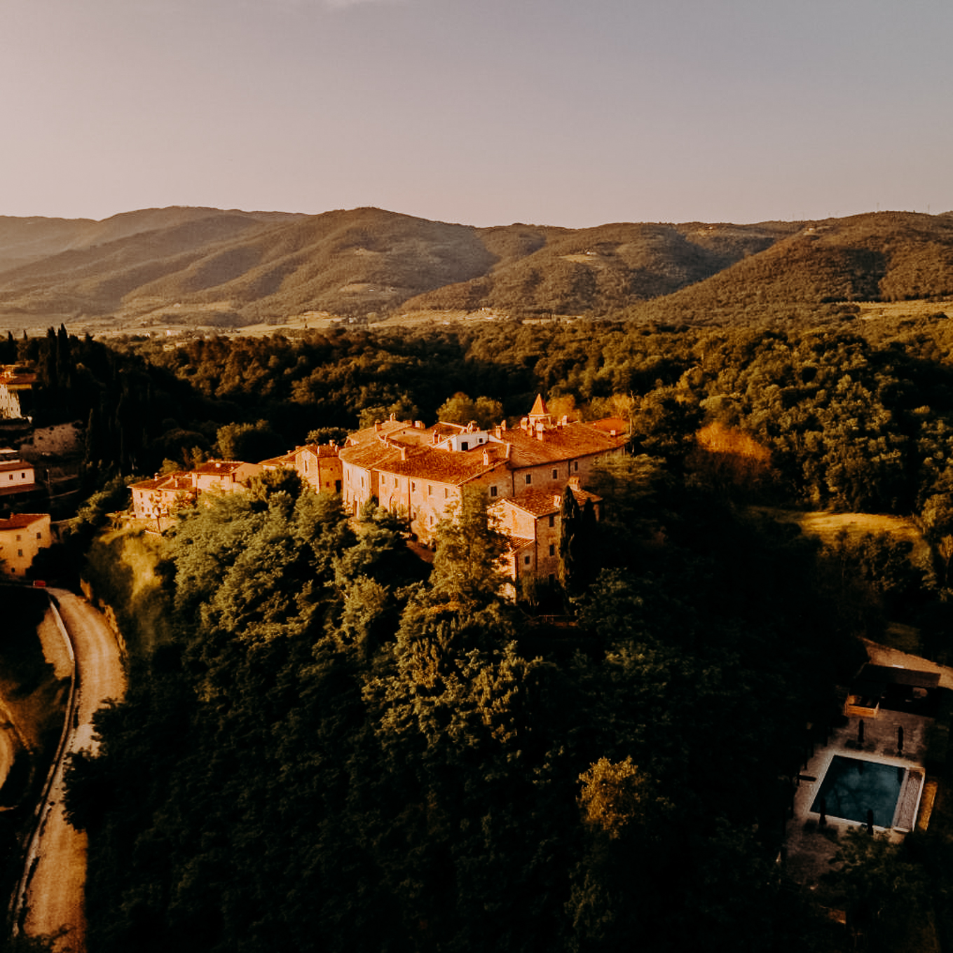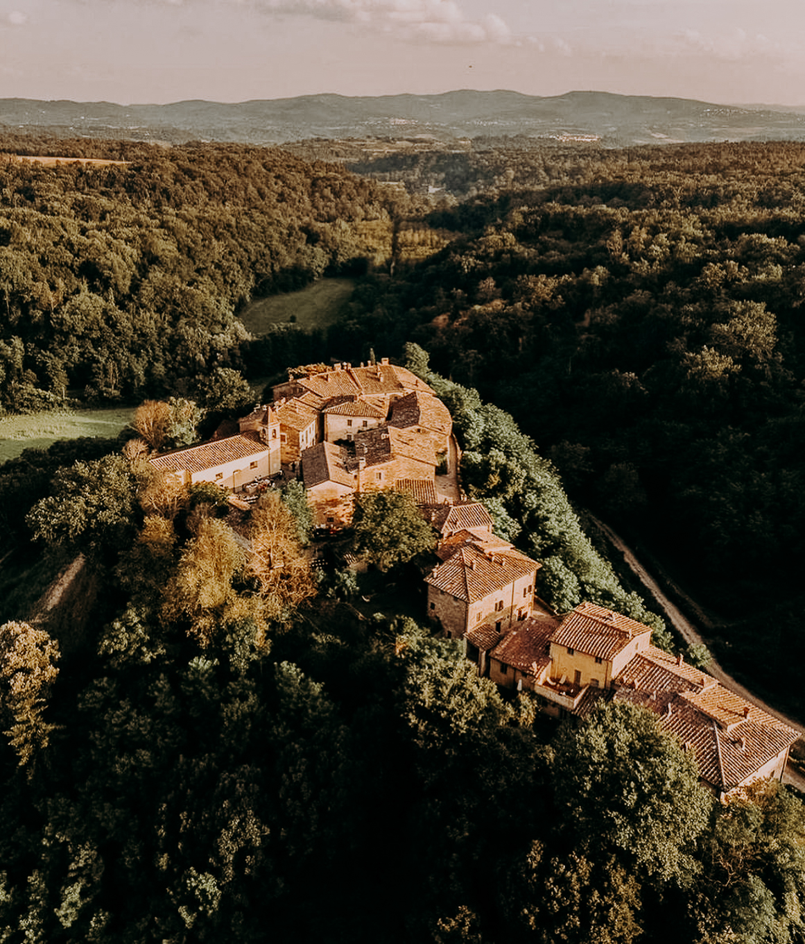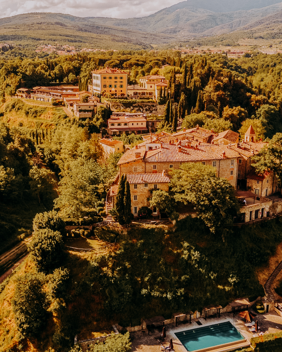 Il Borro is situated in the heart of Tuscany, in the province of Arezzo. It is surrounded by rolling hills, vineyards, and olive groves, making it a secluded yet easily accessible destination.