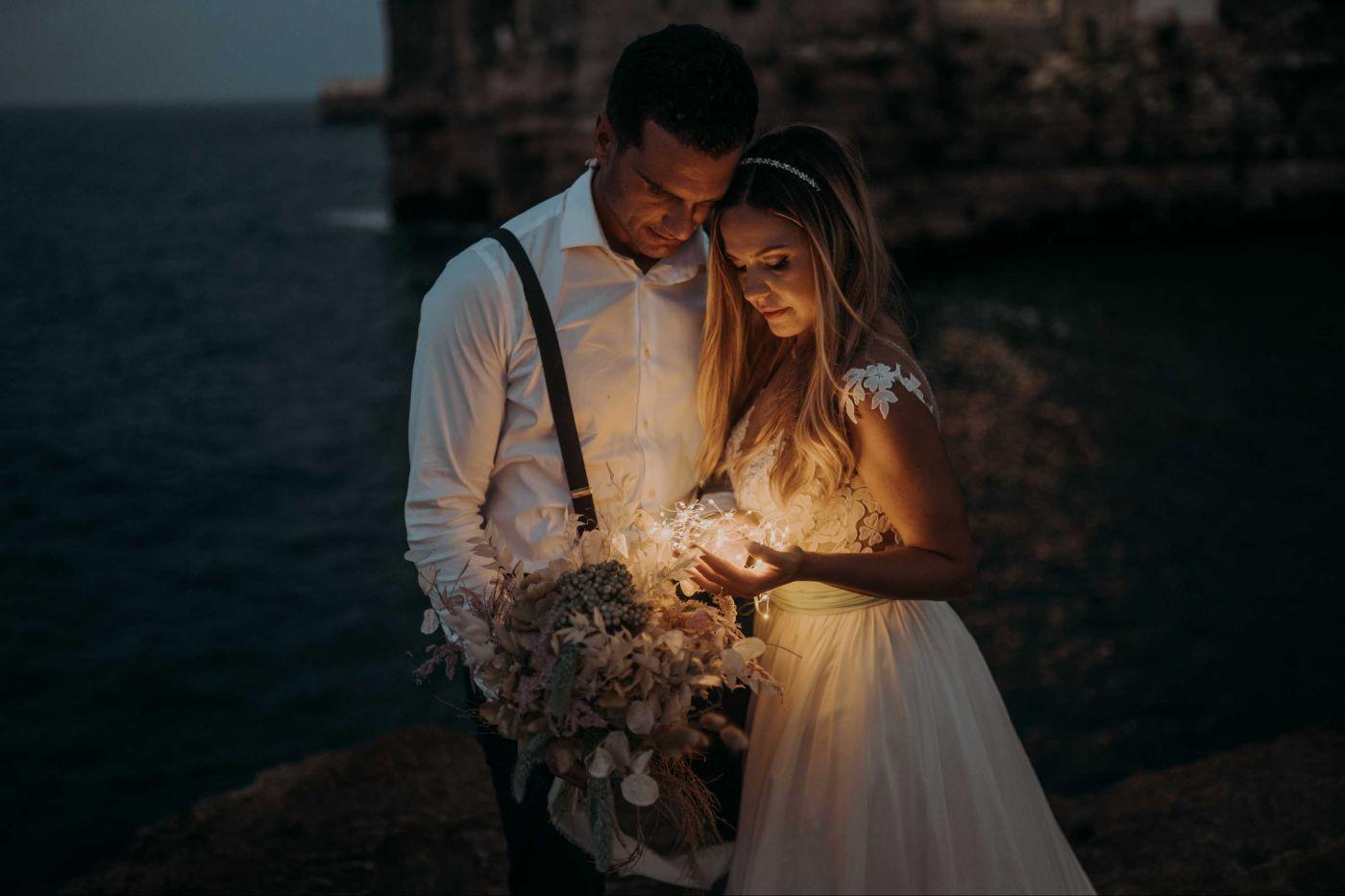 Le lucine accese delle case, i riflessi della luna che si abbattono nel mare, il tutto così magico. Da pugliese innamorato della sua terra non posso che consigliarvi un elopement nella bellissima Puglia, sia che voi viviate in Italia, sia che siate residenti all’estero. Questo luogo magico, unico nel suo genere, merita un viaggio ed è la cornice ideale per costruire un matrimonio intimo e memorabile e che rimanga indelebile per tutta la vita.