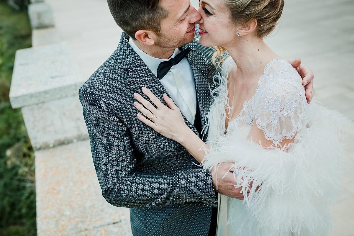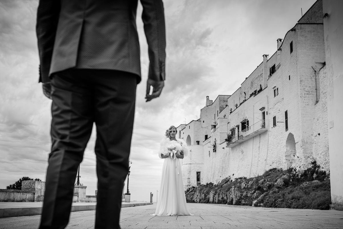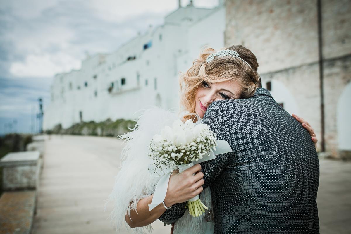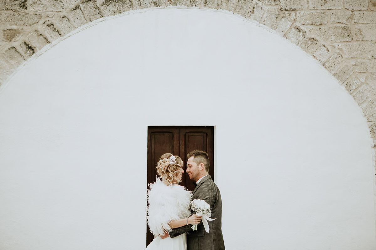 I colori tenui del cielo grigio perla, appena velato da una leggera pioggerellina, si sono combinati alla perfezione con il bianco dell’abito della sposa, il colore candido dei vicoletti del centro storico della Città Bianca e l’azzurro degli occhi innamorati dei due sposi. È stato un idillio. Un connubio perfetto tra architettura, bellezza e fascino. E noi abbiamo avuto la fortuna di immortalare tutto questo negli scatti del matrimonio della coppia.