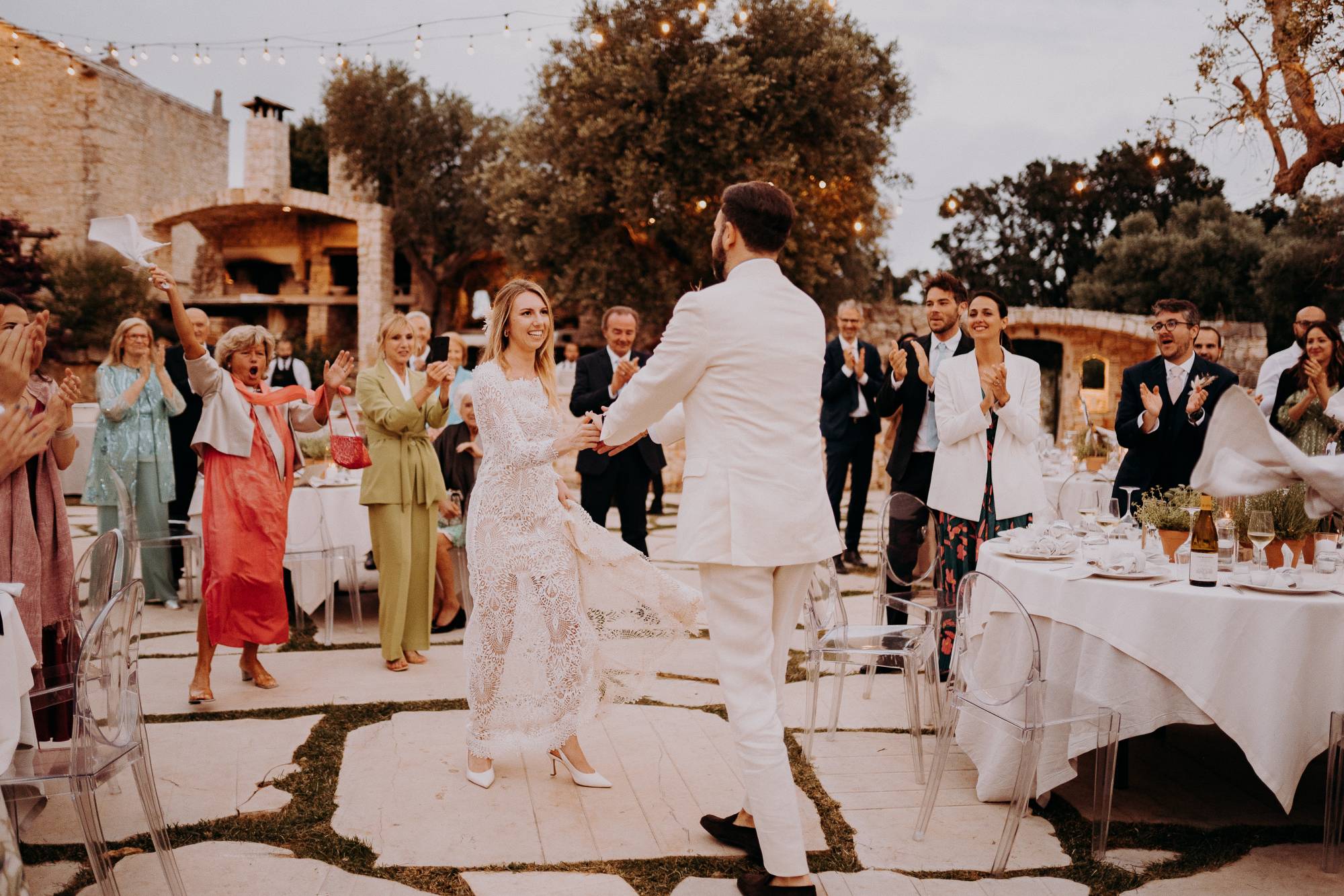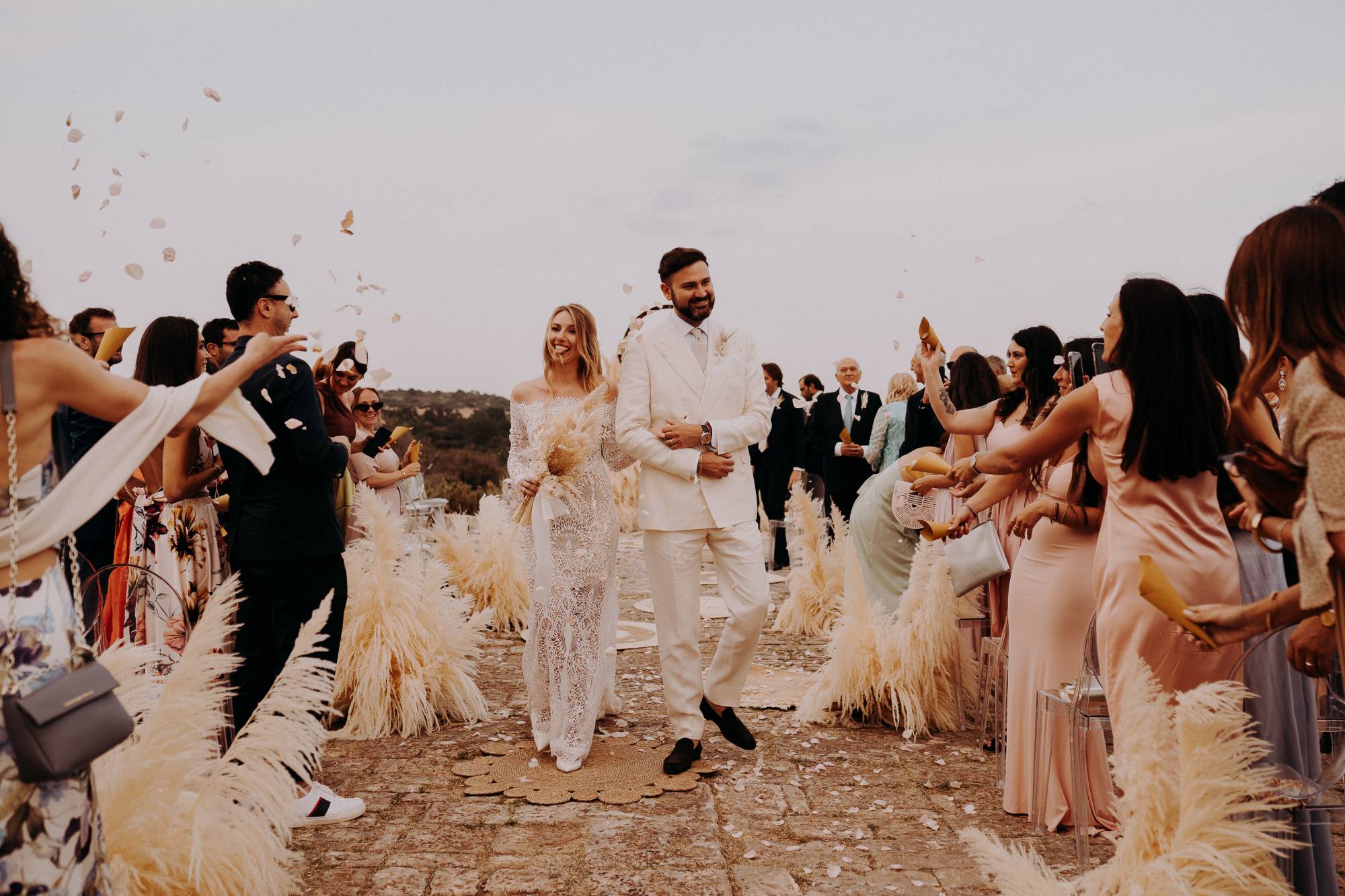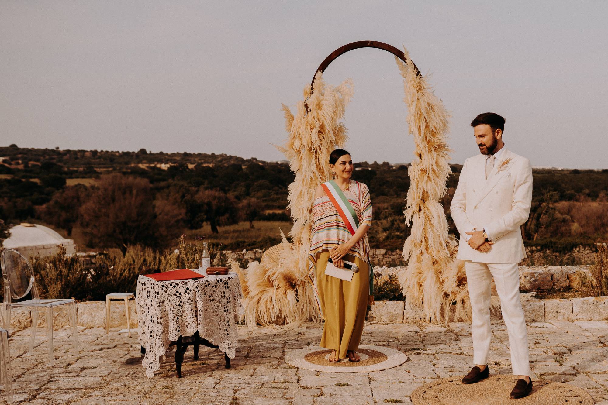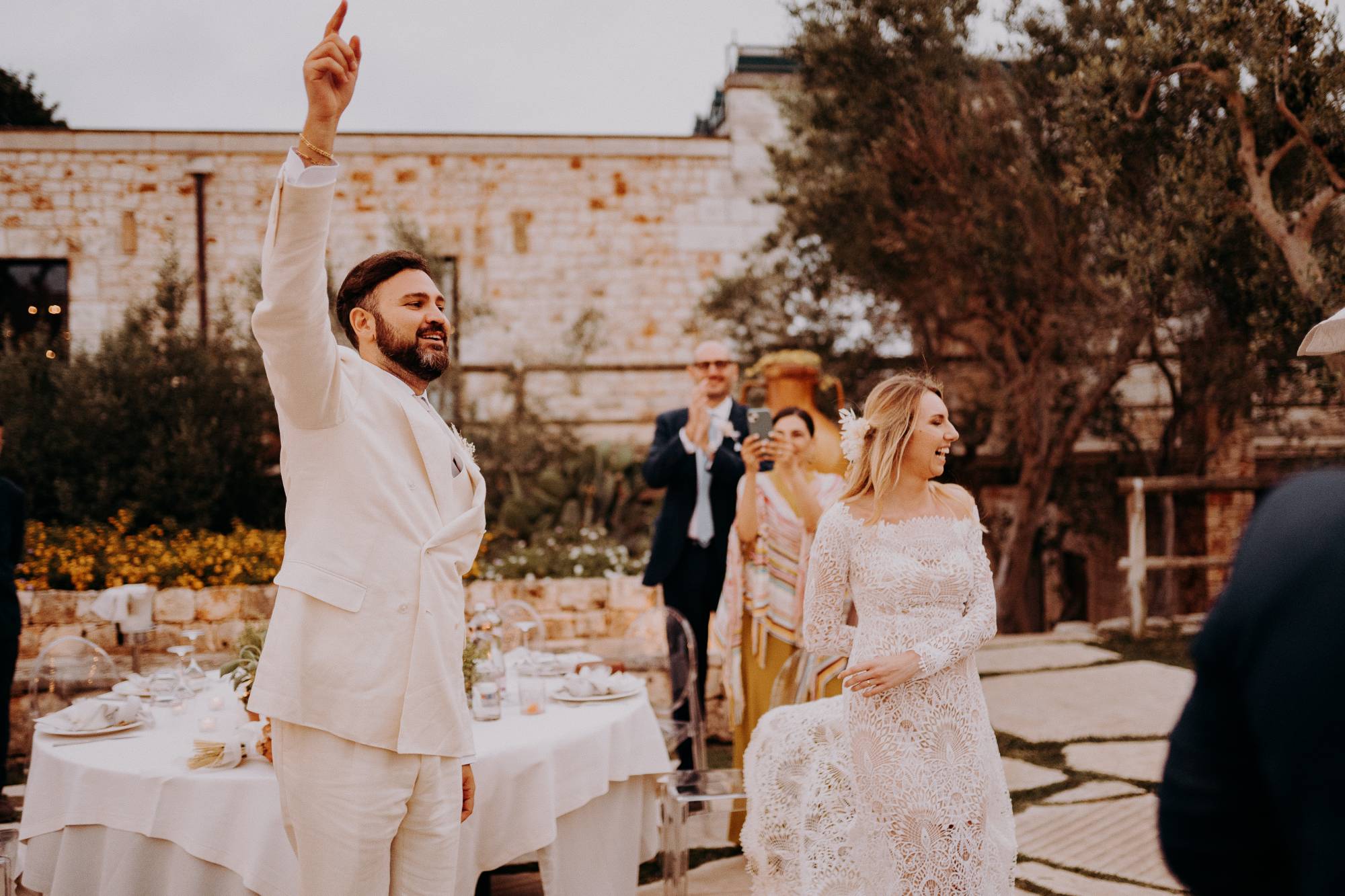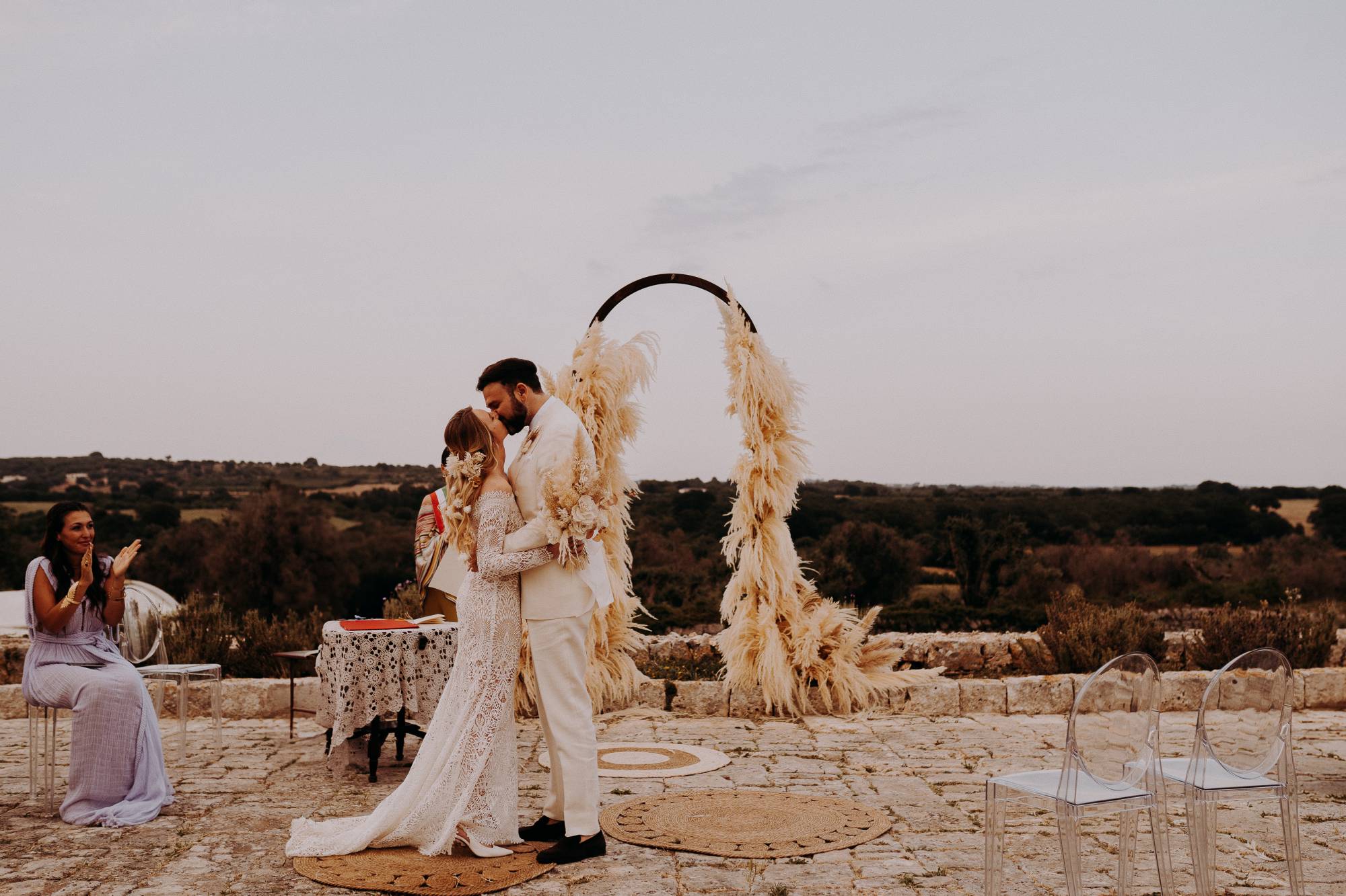 La cerimonia civile si è svolta in un angolo riservato dei rigogliosi giardini della Masseria. Circondati dai loro amici e familiari più cari, Ettore ed Elena si sono scambiati voti pieni di sentimento sotto il caldo sole italiano. L’ambientazione era tanto intima quanto suggestiva, con il leggero fruscio degli ulivi a fare da colonna sonora naturale.