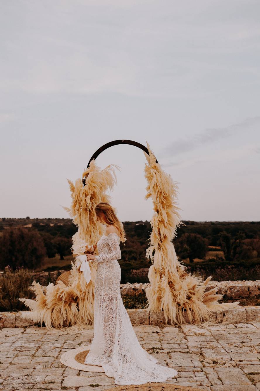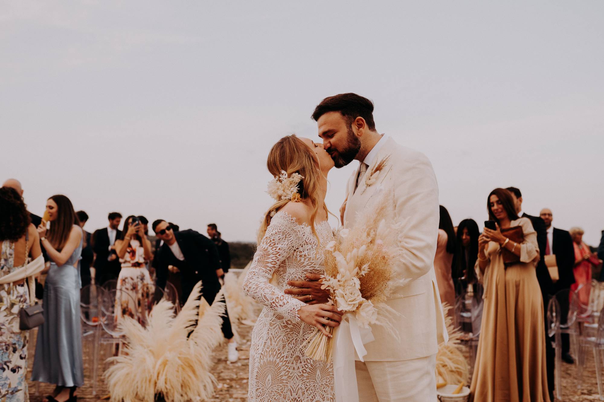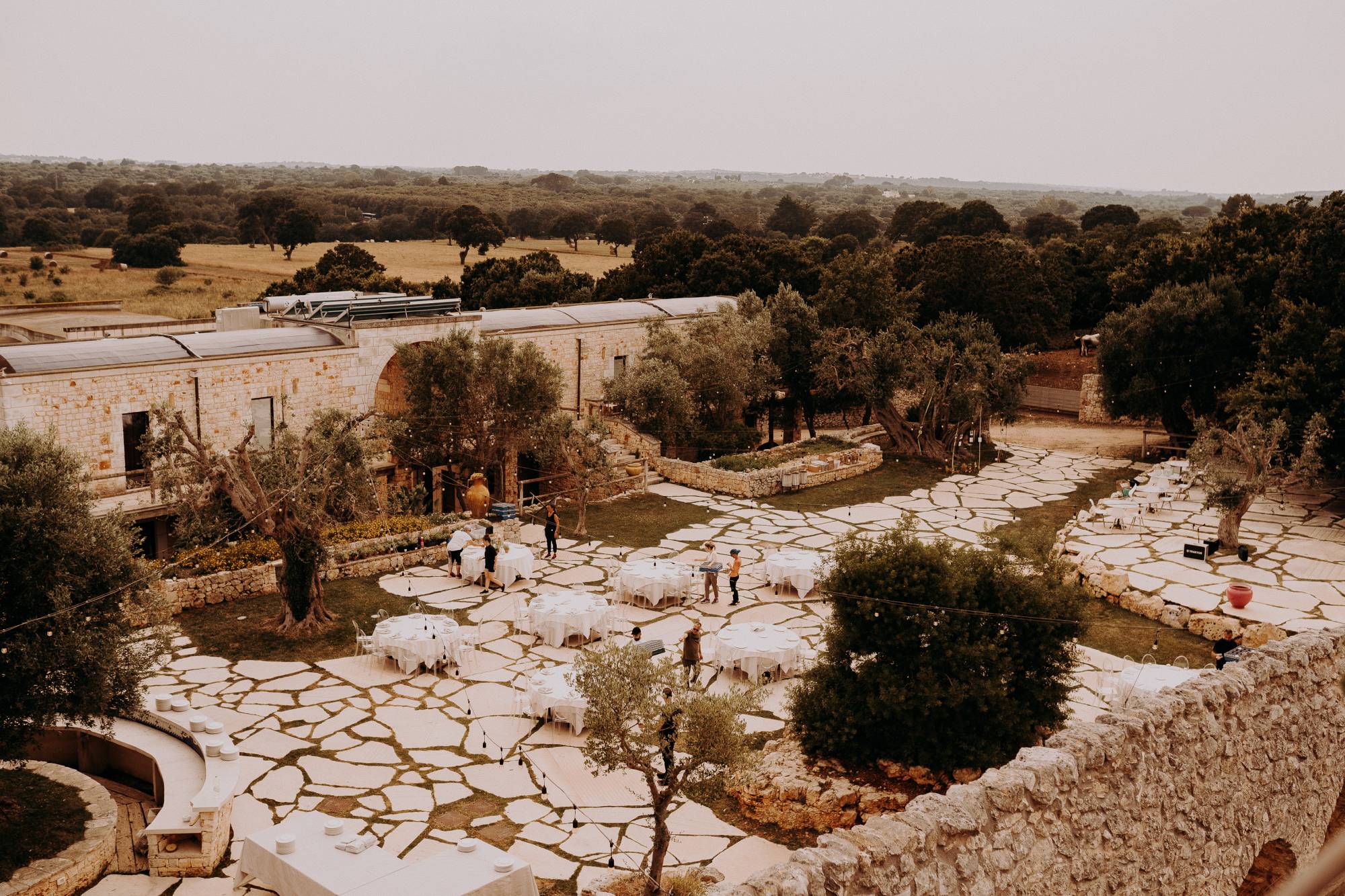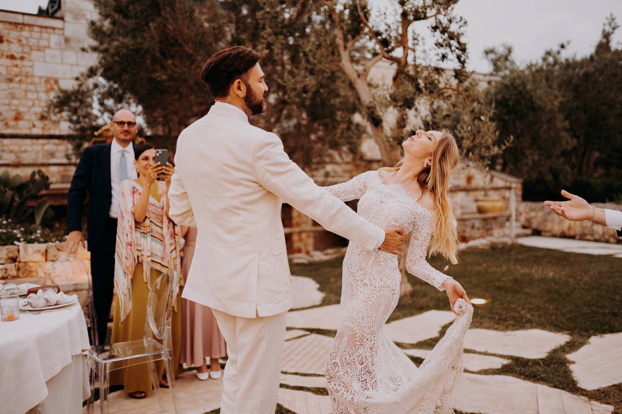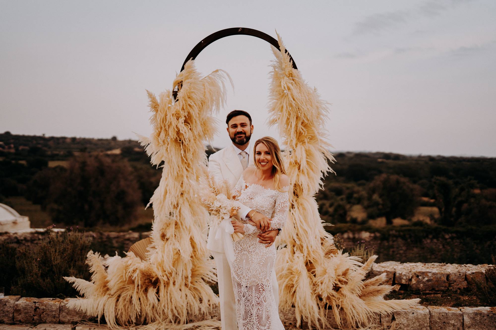 La cerimonia civile si è svolta in un angolo riservato dei rigogliosi giardini della Masseria. Circondati dai loro amici e familiari più cari, Ettore ed Elena si sono scambiati voti pieni di sentimento sotto il caldo sole italiano. L’ambientazione era tanto intima quanto suggestiva, con il leggero fruscio degli ulivi a fare da colonna sonora naturale.
