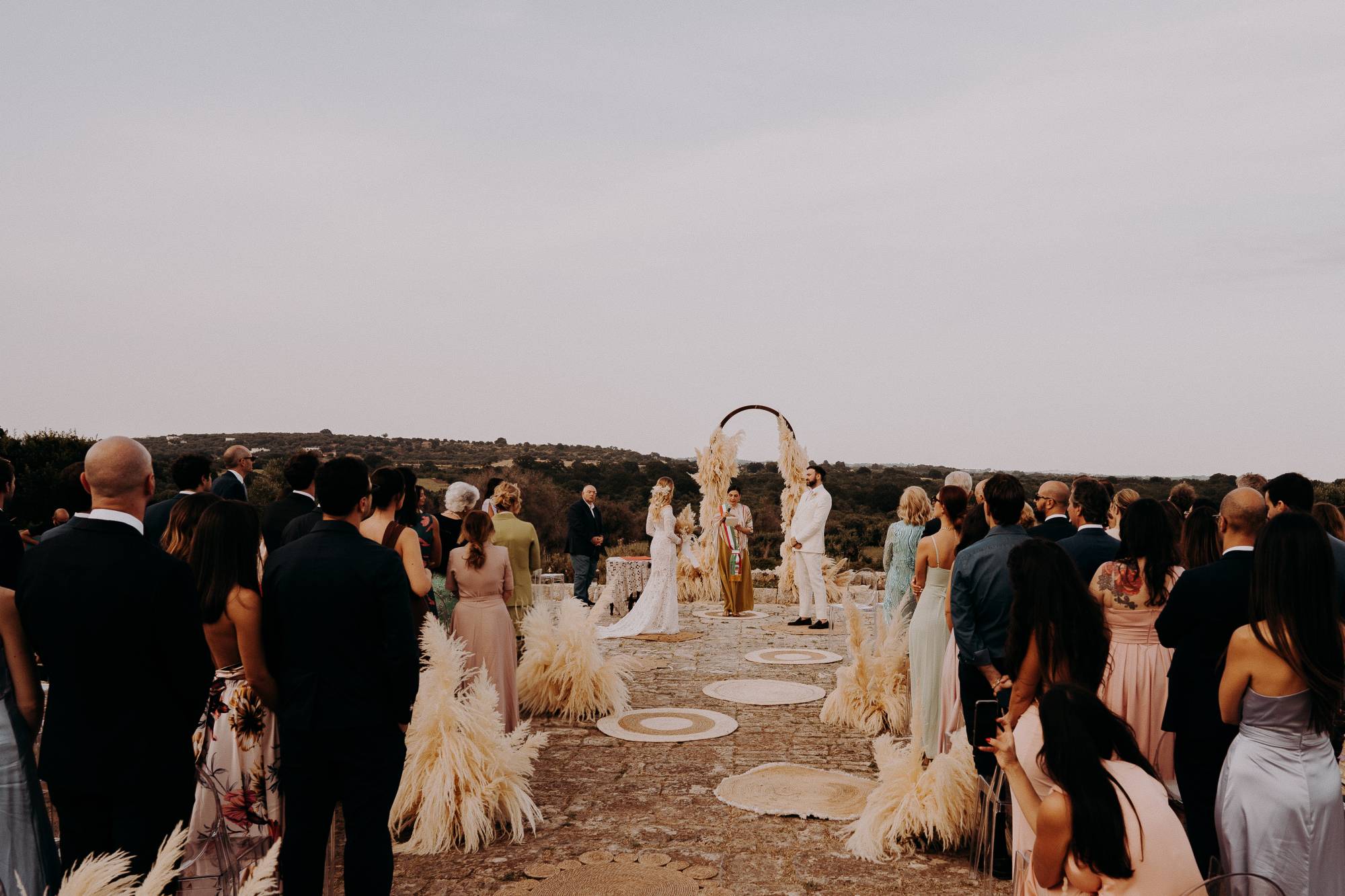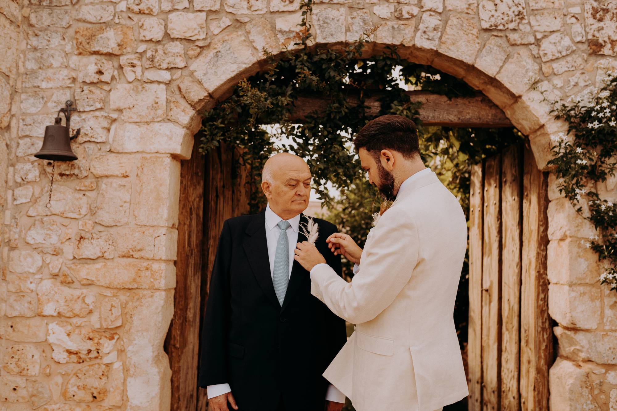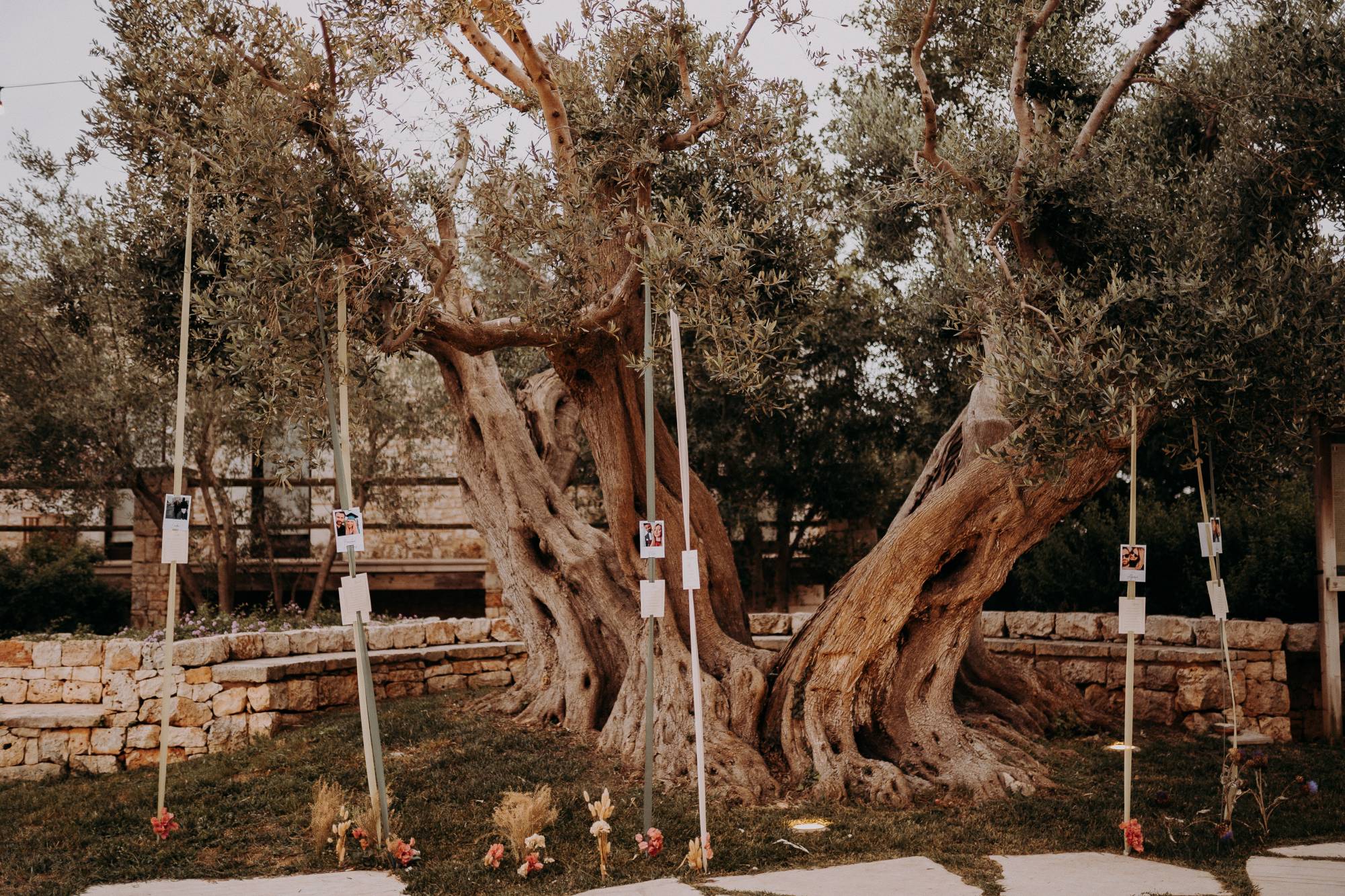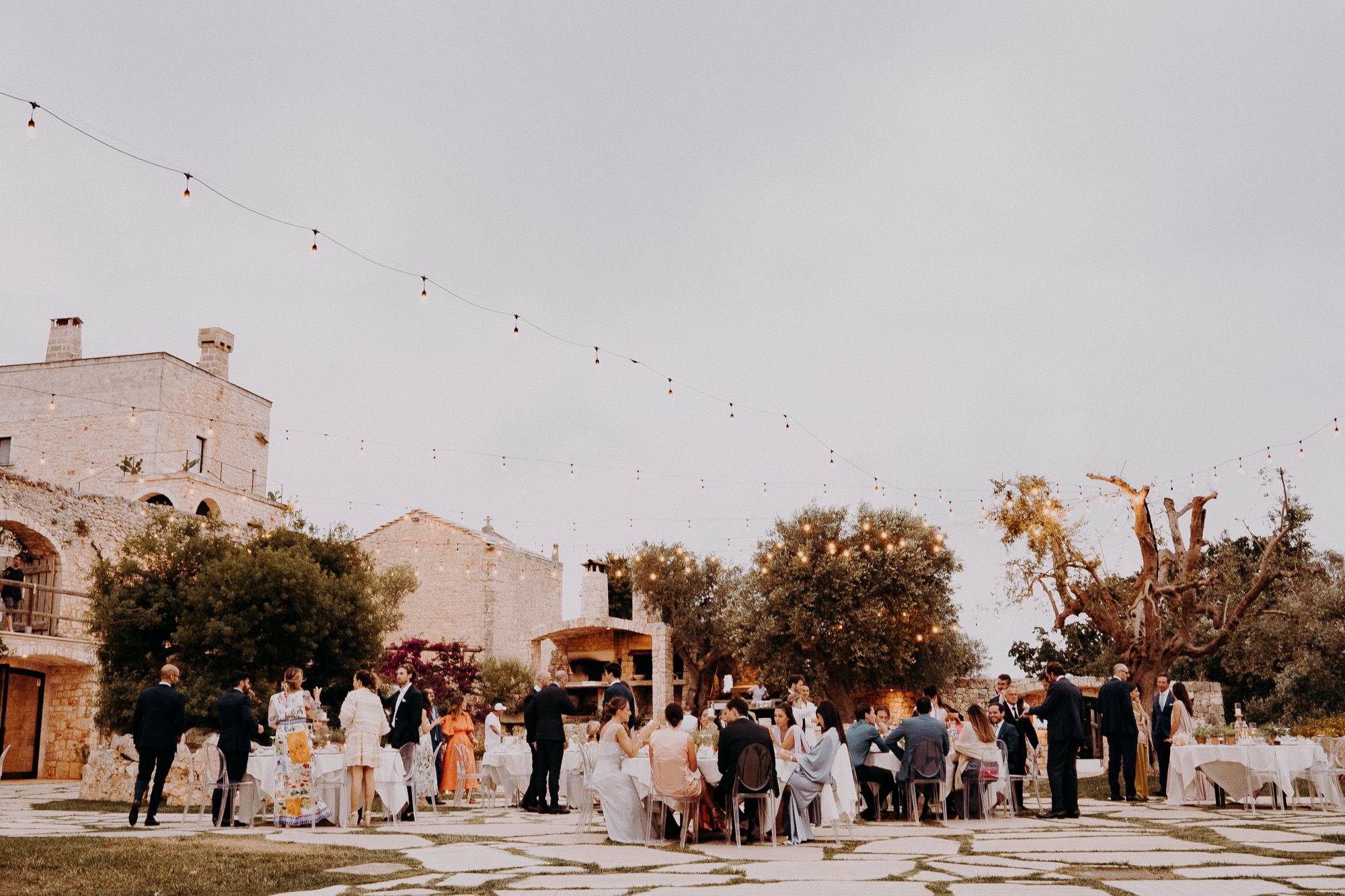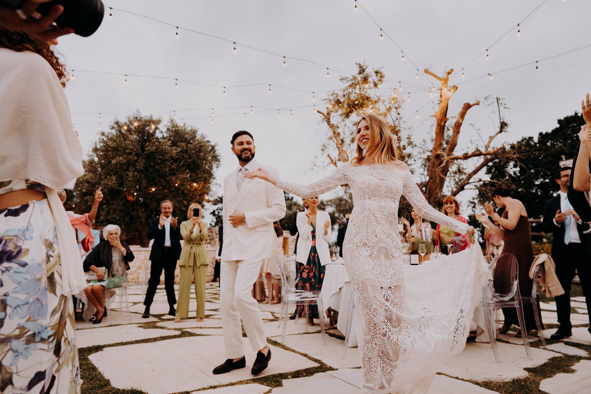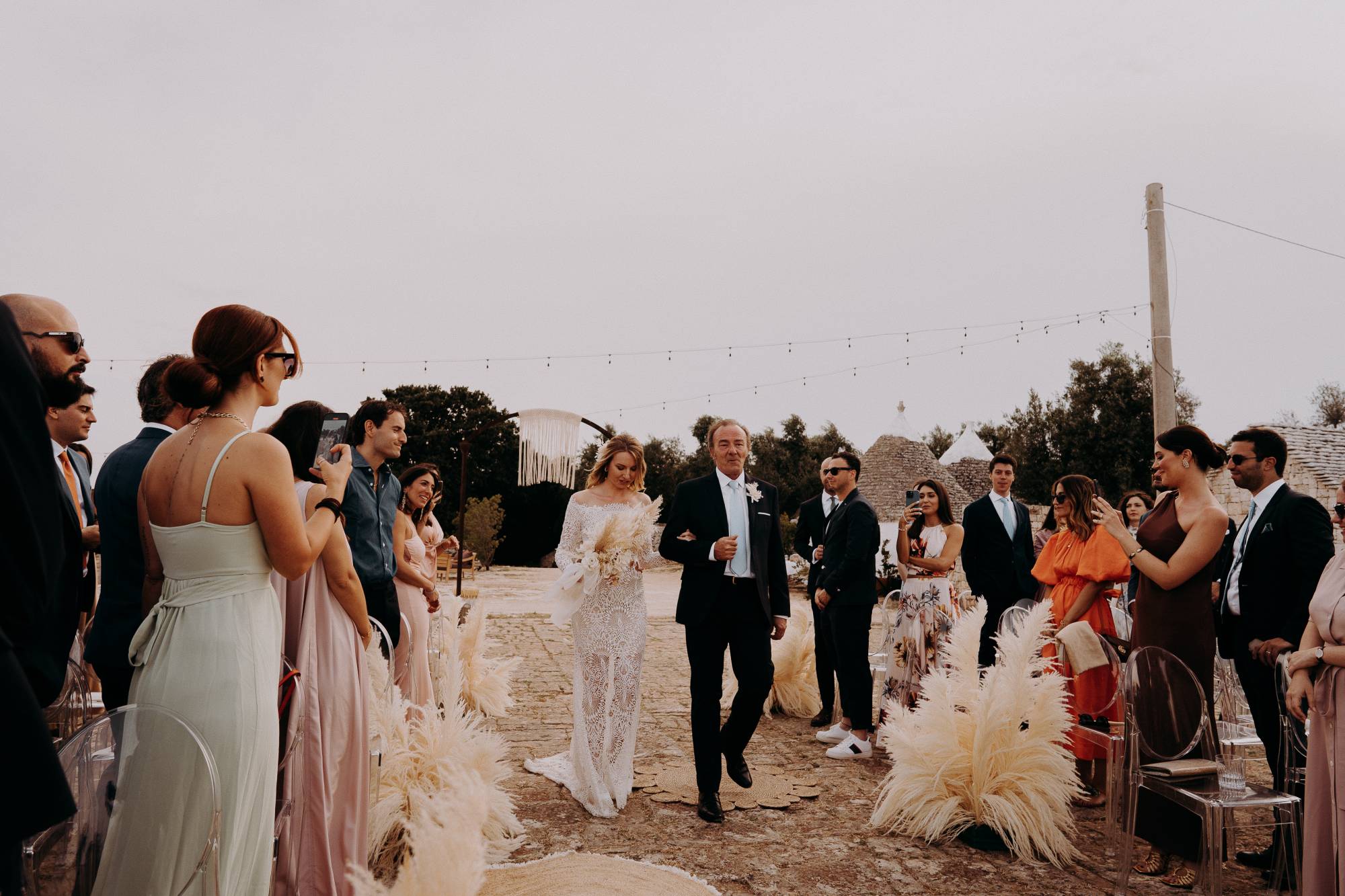 La cerimonia civile si è svolta in un angolo riservato dei rigogliosi giardini della Masseria. Circondati dai loro amici e familiari più cari, Ettore ed Elena si sono scambiati voti pieni di sentimento sotto il caldo sole italiano. L’ambientazione era tanto intima quanto suggestiva, con il leggero fruscio degli ulivi a fare da colonna sonora naturale.