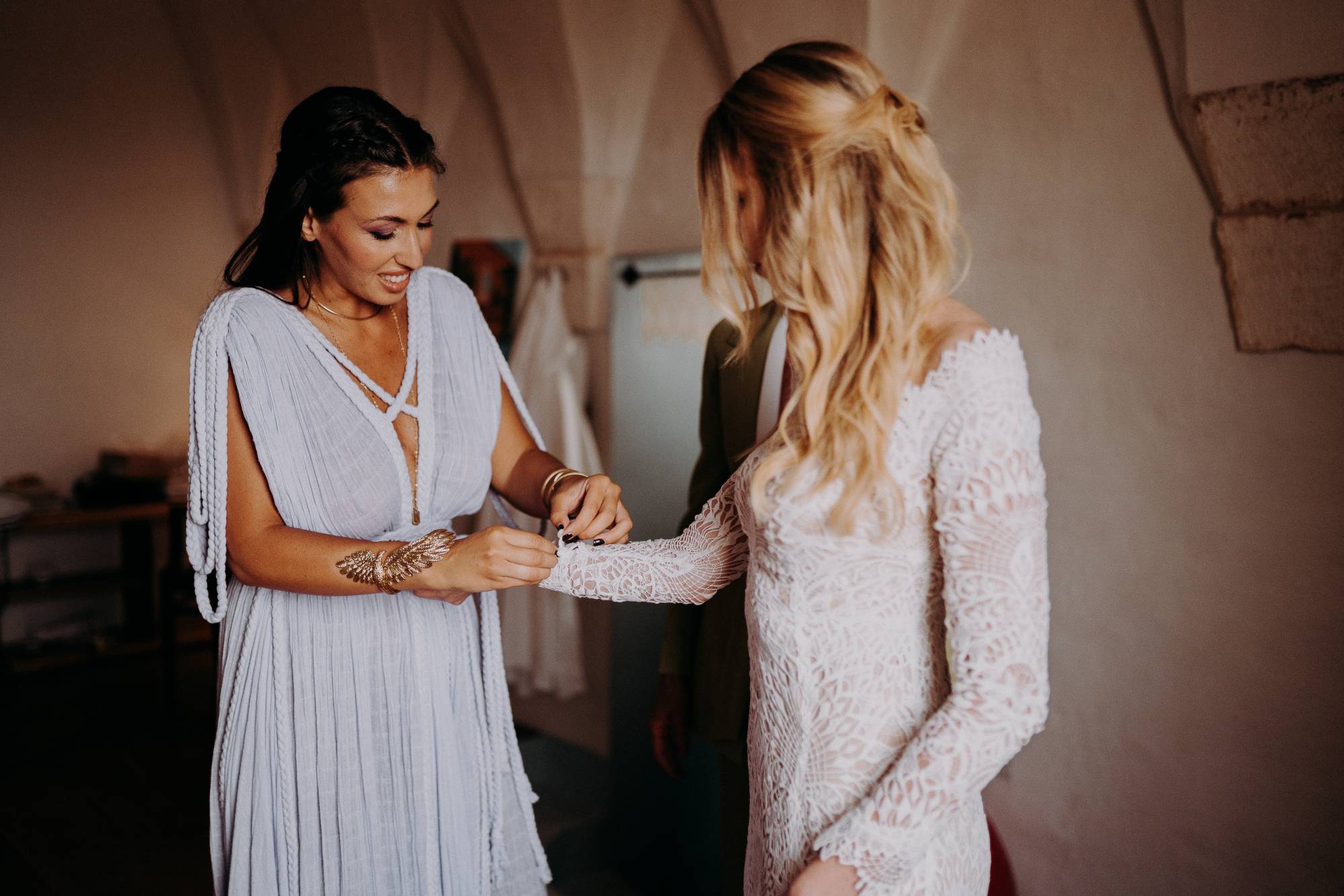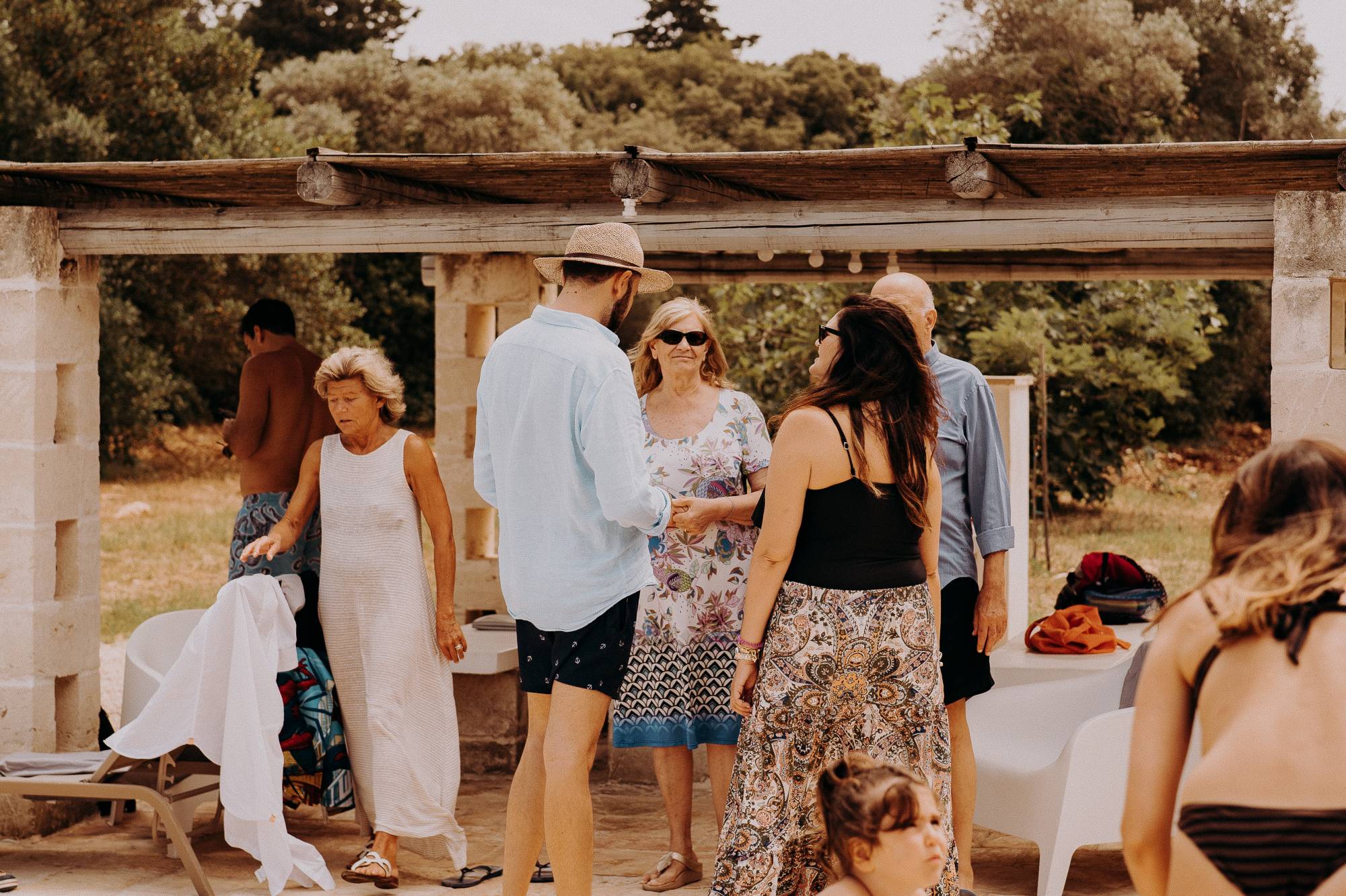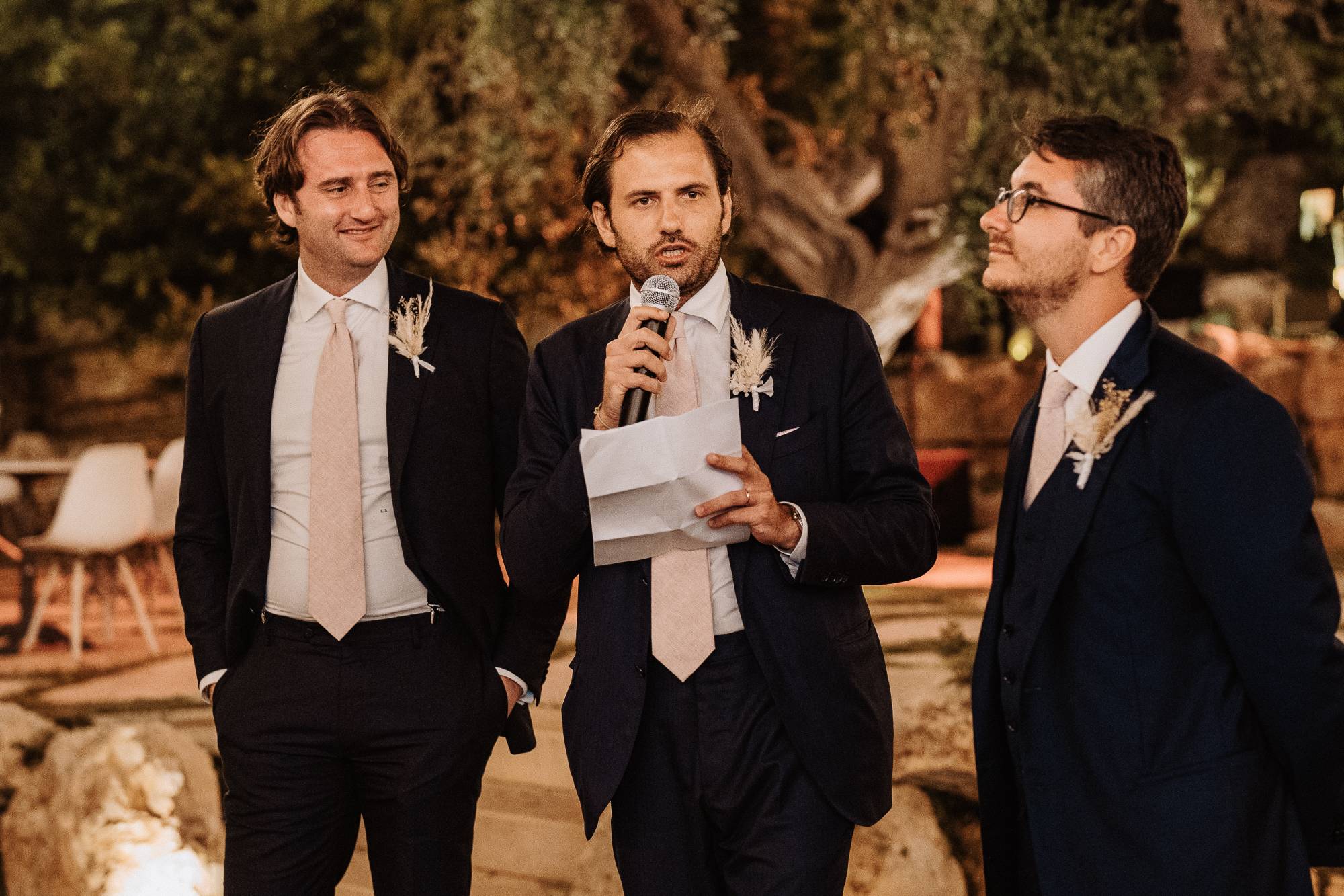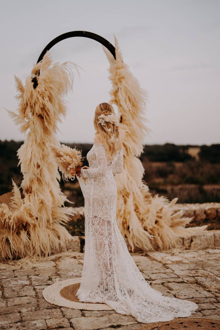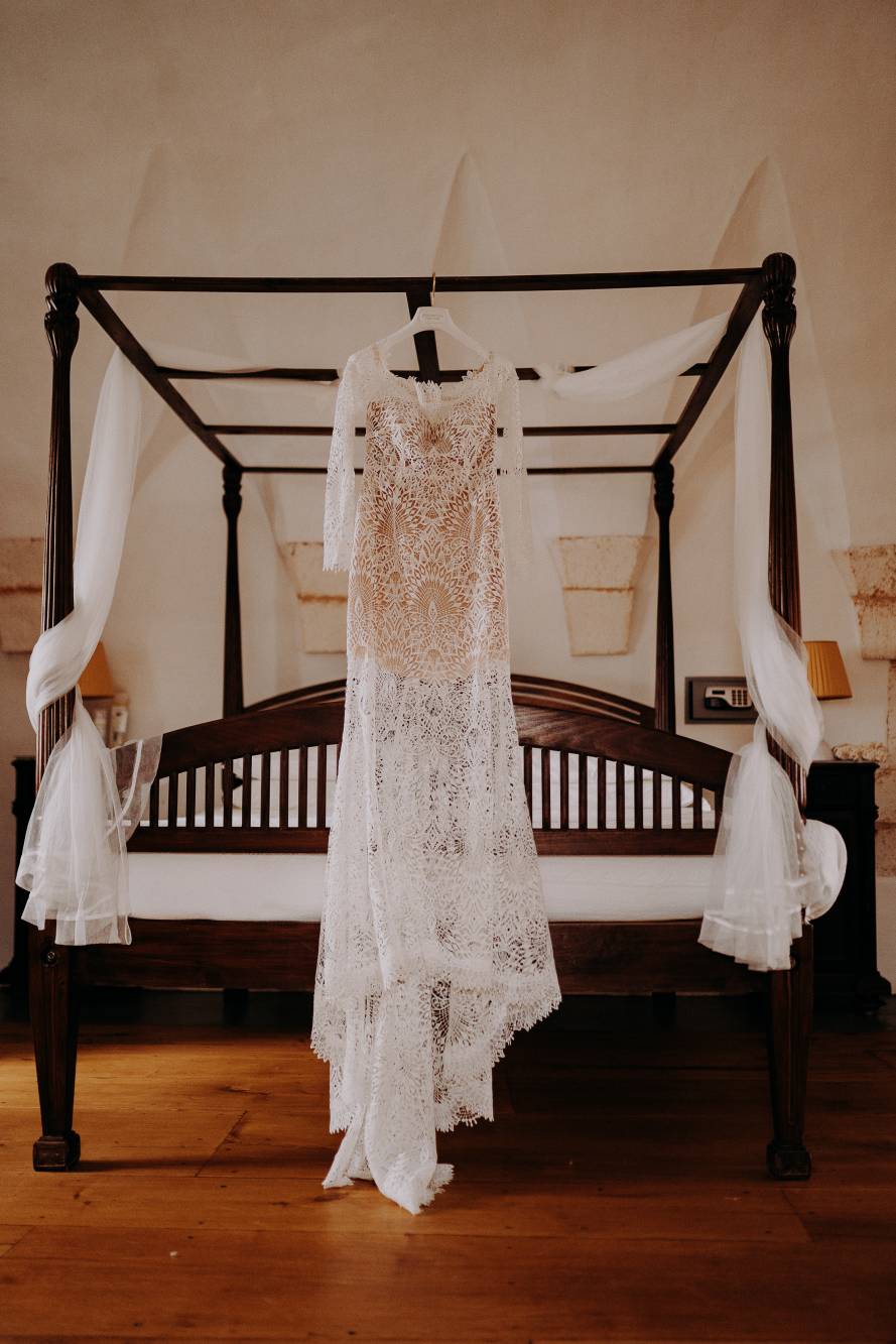 La cerimonia civile si è svolta in un angolo riservato dei rigogliosi giardini della Masseria. Circondati dai loro amici e familiari più cari, Ettore ed Elena si sono scambiati voti pieni di sentimento sotto il caldo sole italiano. L’ambientazione era tanto intima quanto suggestiva, con il leggero fruscio degli ulivi a fare da colonna sonora naturale.