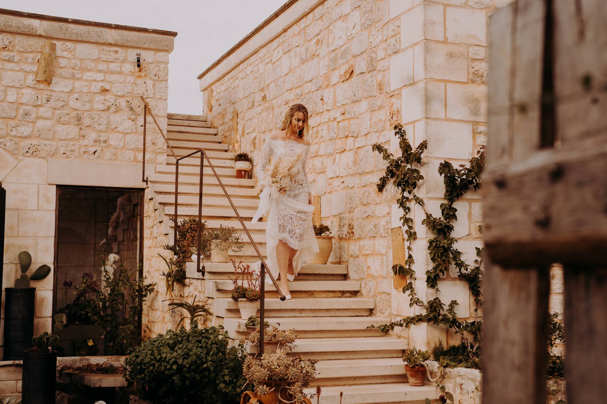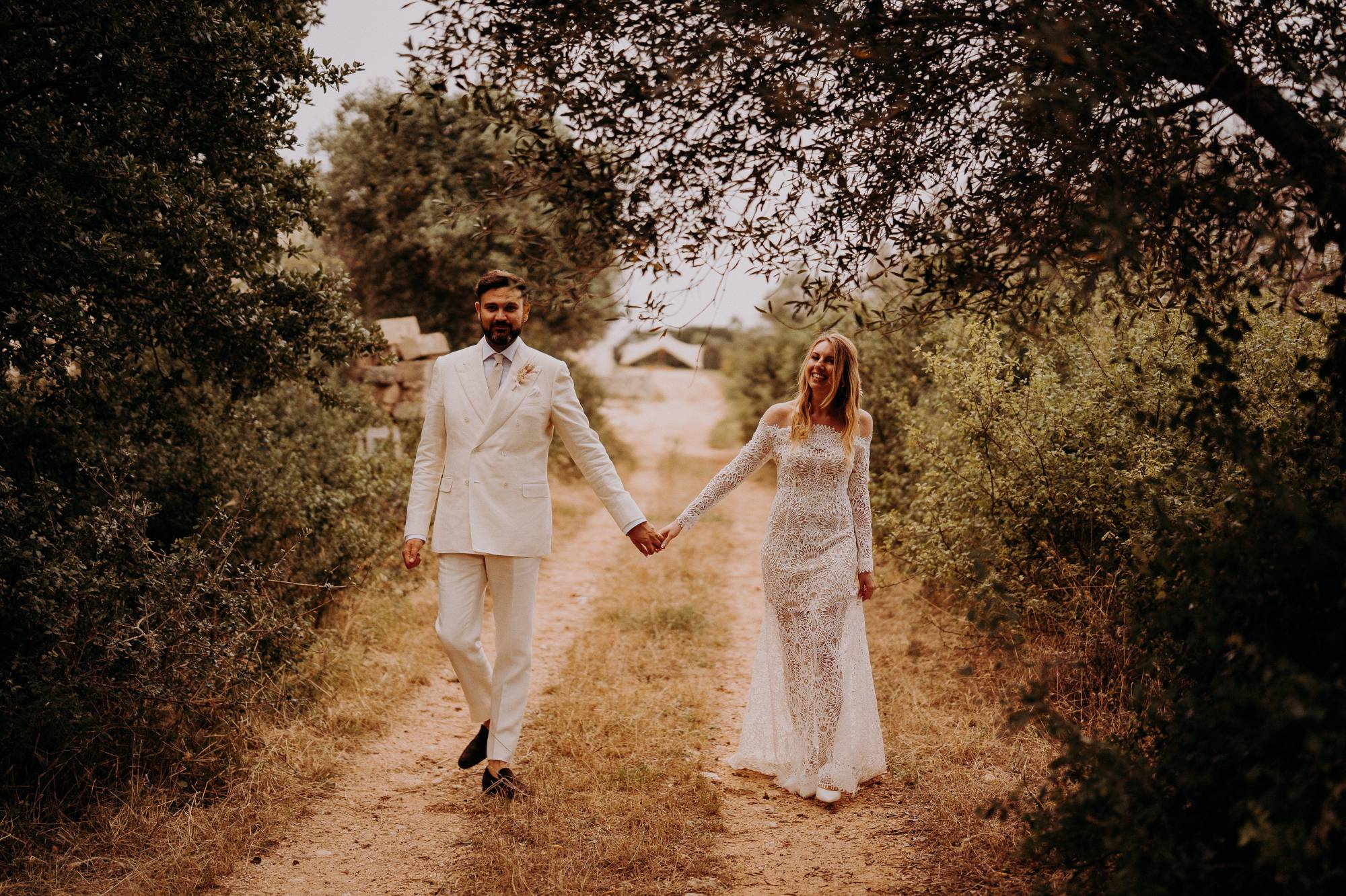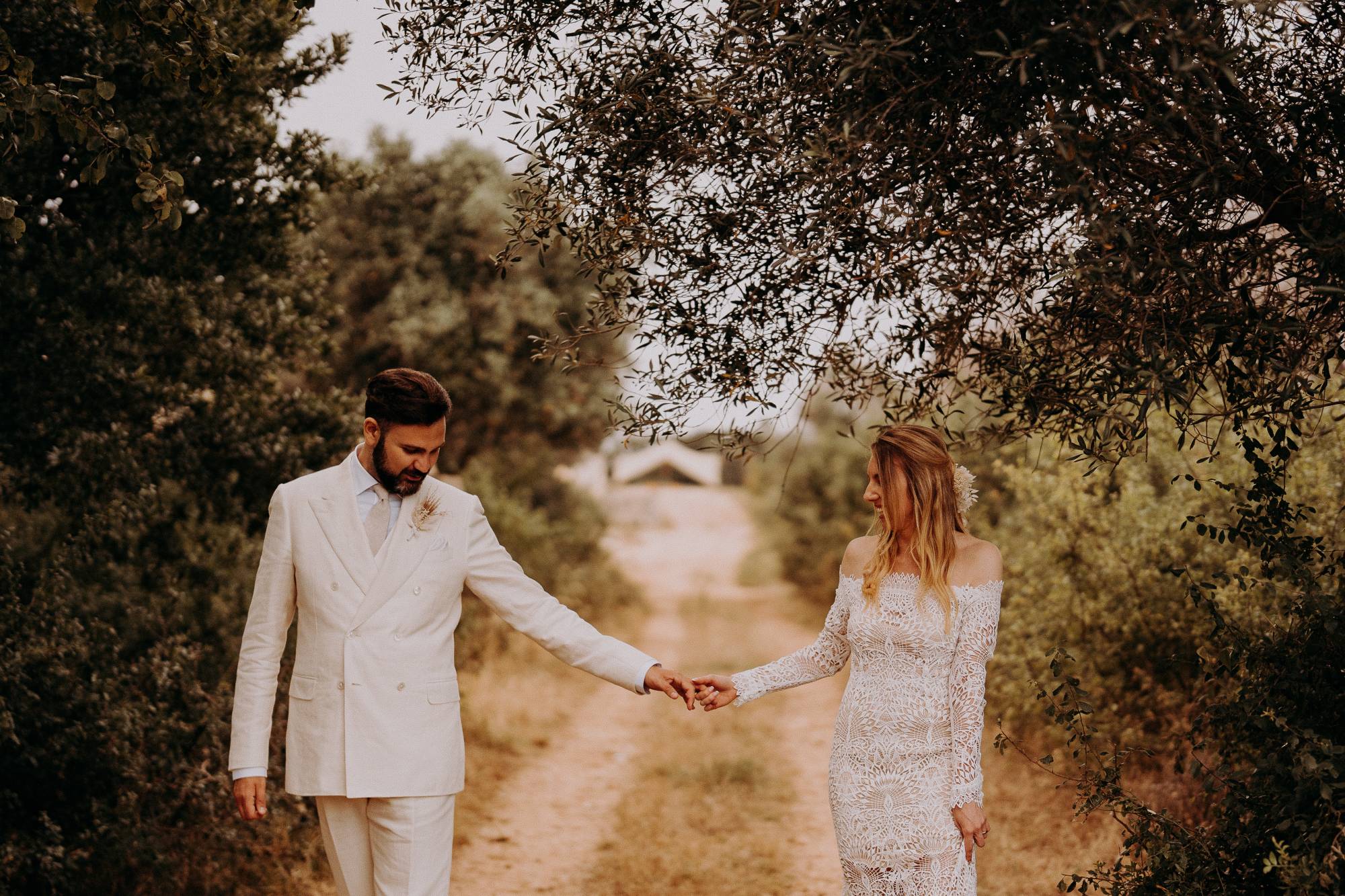 Dopo la cerimonia, ci siamo avventurati nella campagna circostante la Masseria per una sessione fotografica intima e romantica. La luce dell’ora dorata, filtrata tra gli ulivi, ha creato un’atmosfera magica, avvolgendo la coppia in un caldo bagliore.