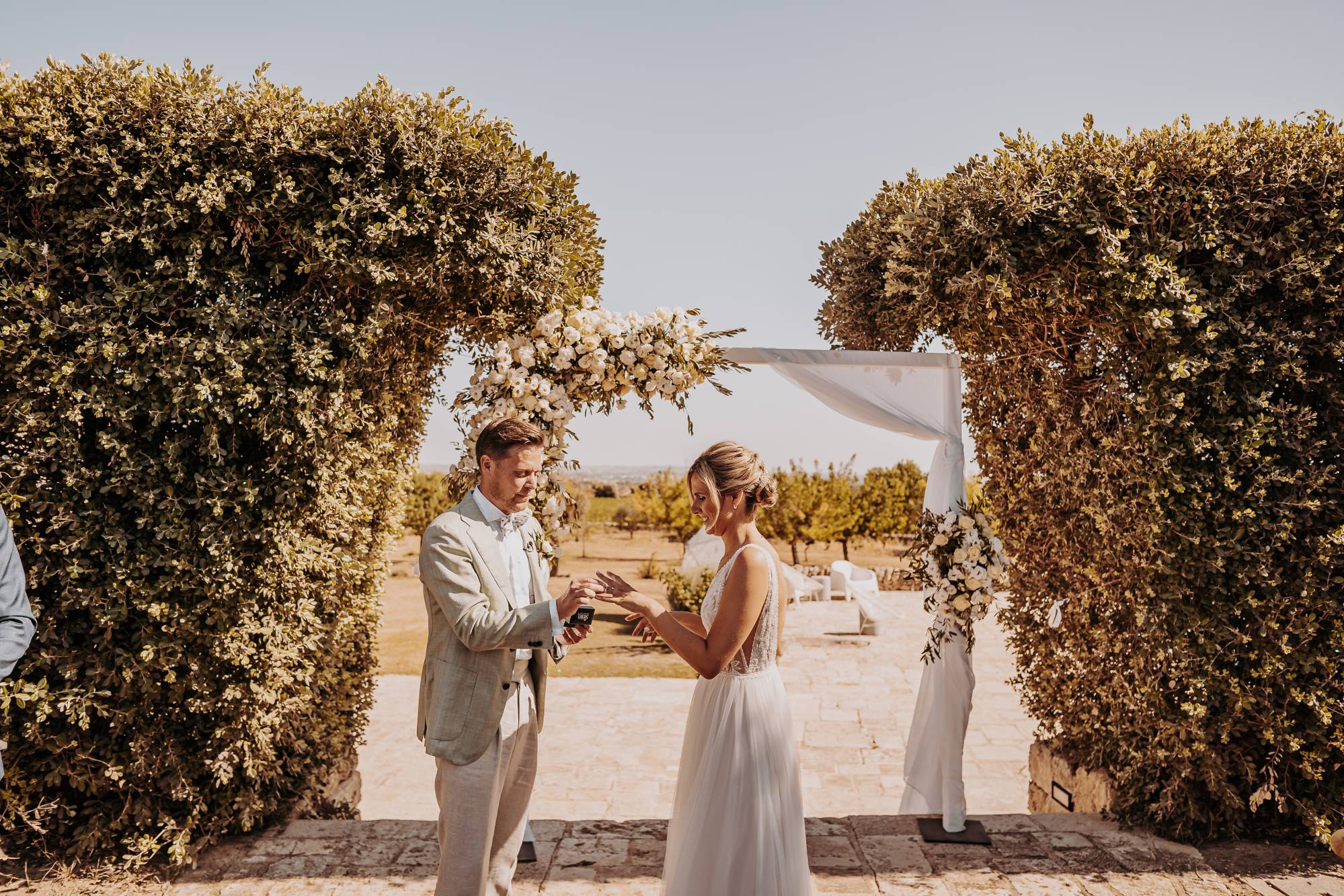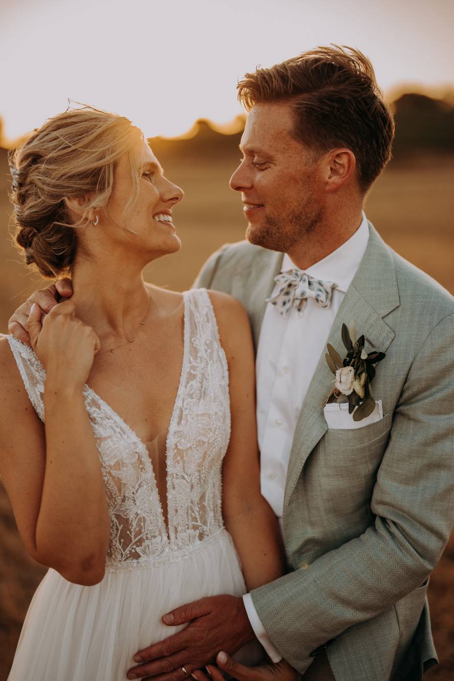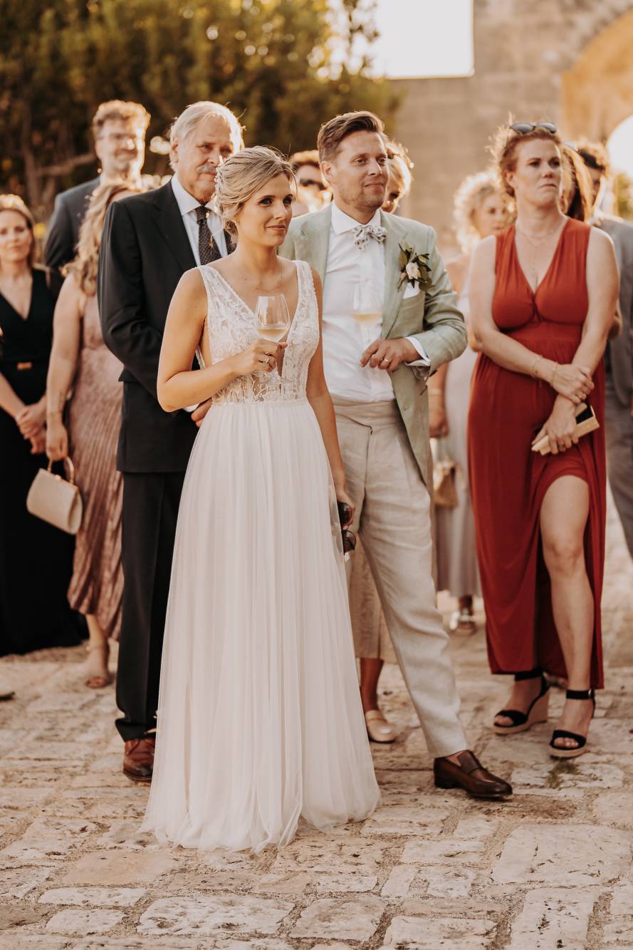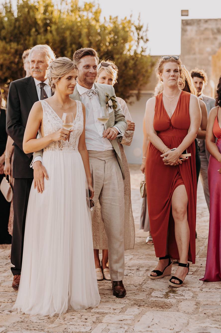 Il giorno del matrimonio, il cielo azzurro e la luce calda del tramonto pugliese hanno fatto da cornice a un rito simbolico che ha reso questo momento davvero speciale. Maurice e Noortje hanno scambiato le loro promesse d’amore all’aperto, circondati dal verde dei vigneti e dagli ulivi secolari della masseria. Un'atmosfera unica che ha emozionato tutti i presenti, con la natura che ha fatto da scenografia alla cerimonia, facendo sentire ogni ospite parte di qualcosa di speciale. Il rito, simbolico ma ricco di significato, ha coinvolto ogni invitato, facendo percepire la magia del momento.