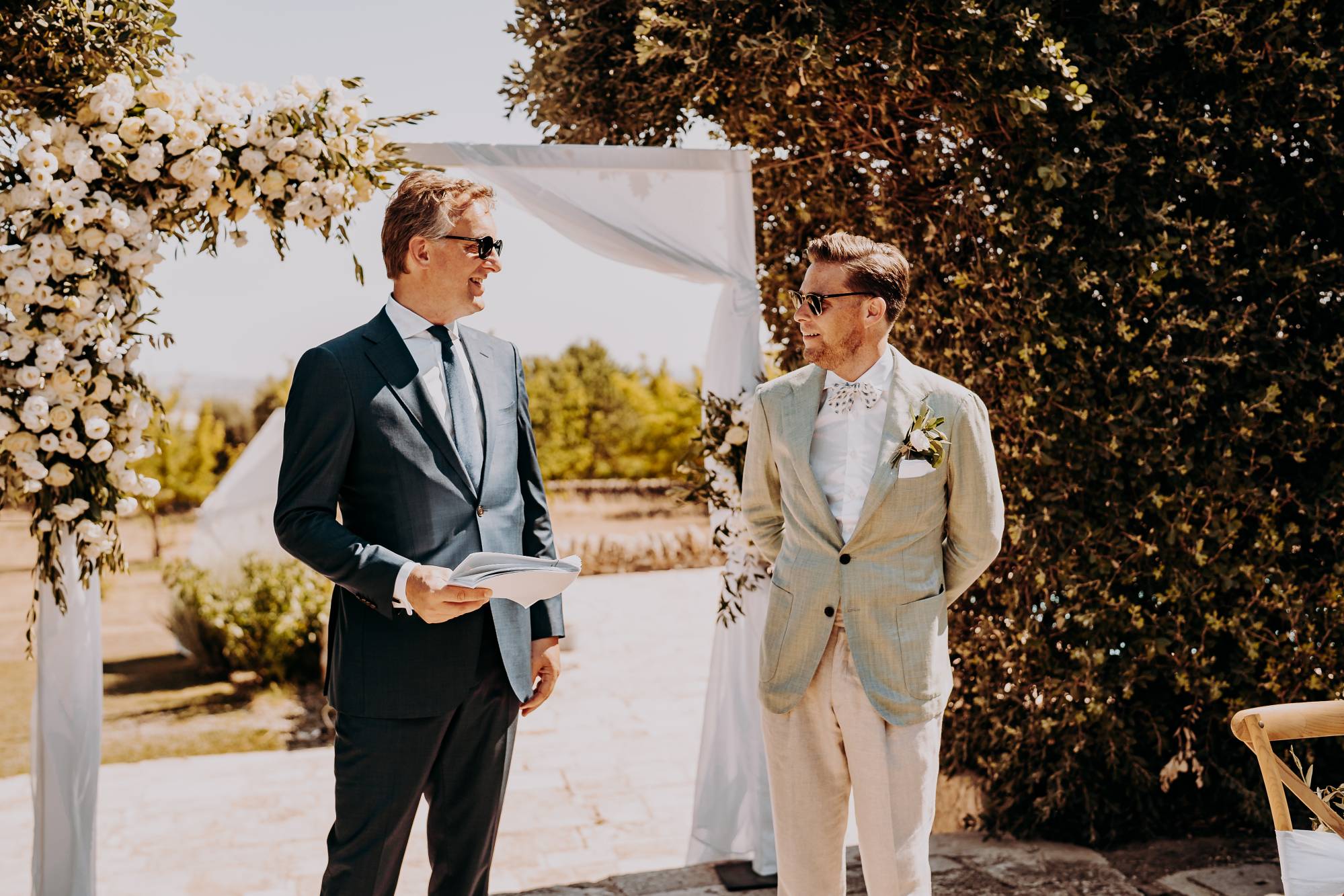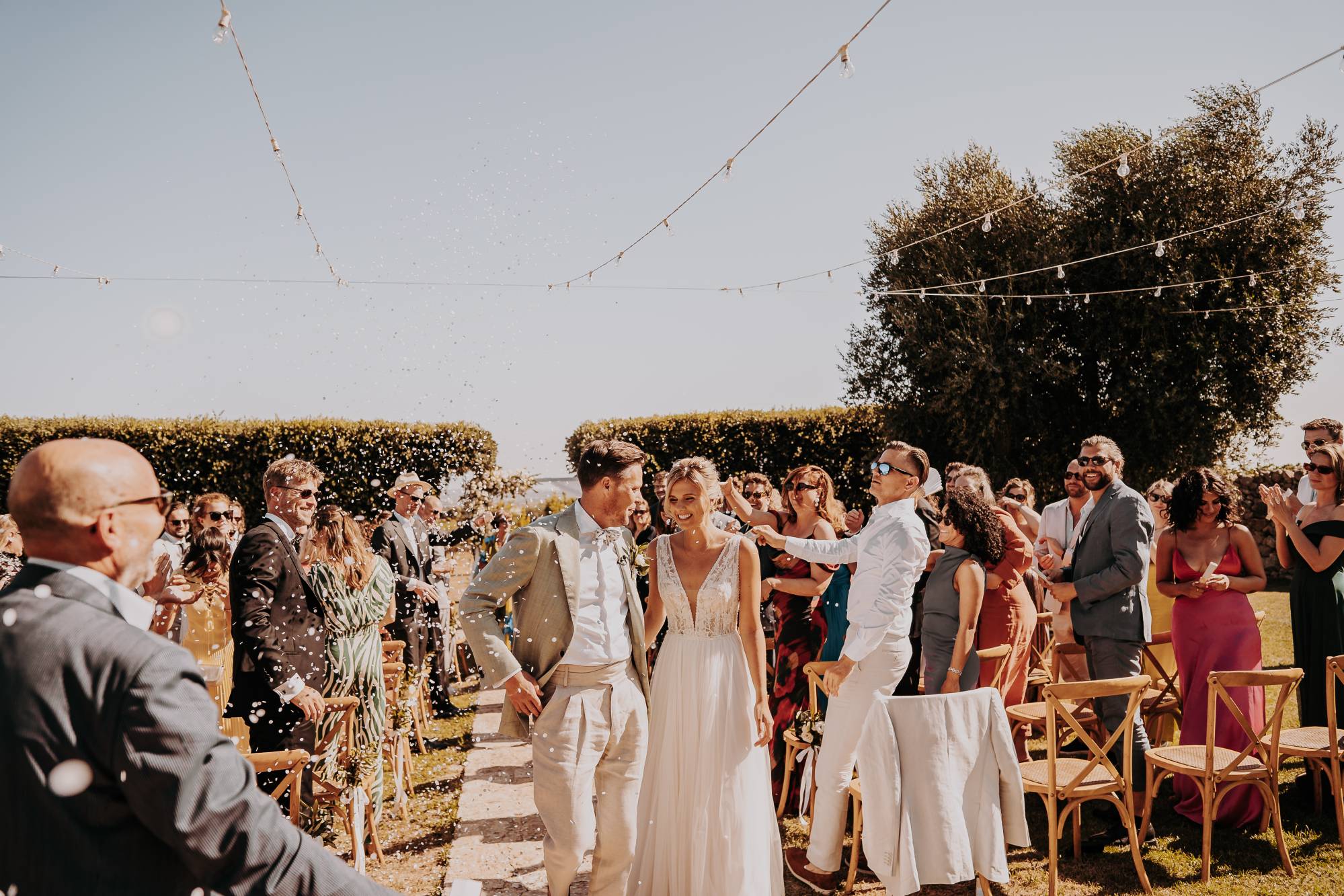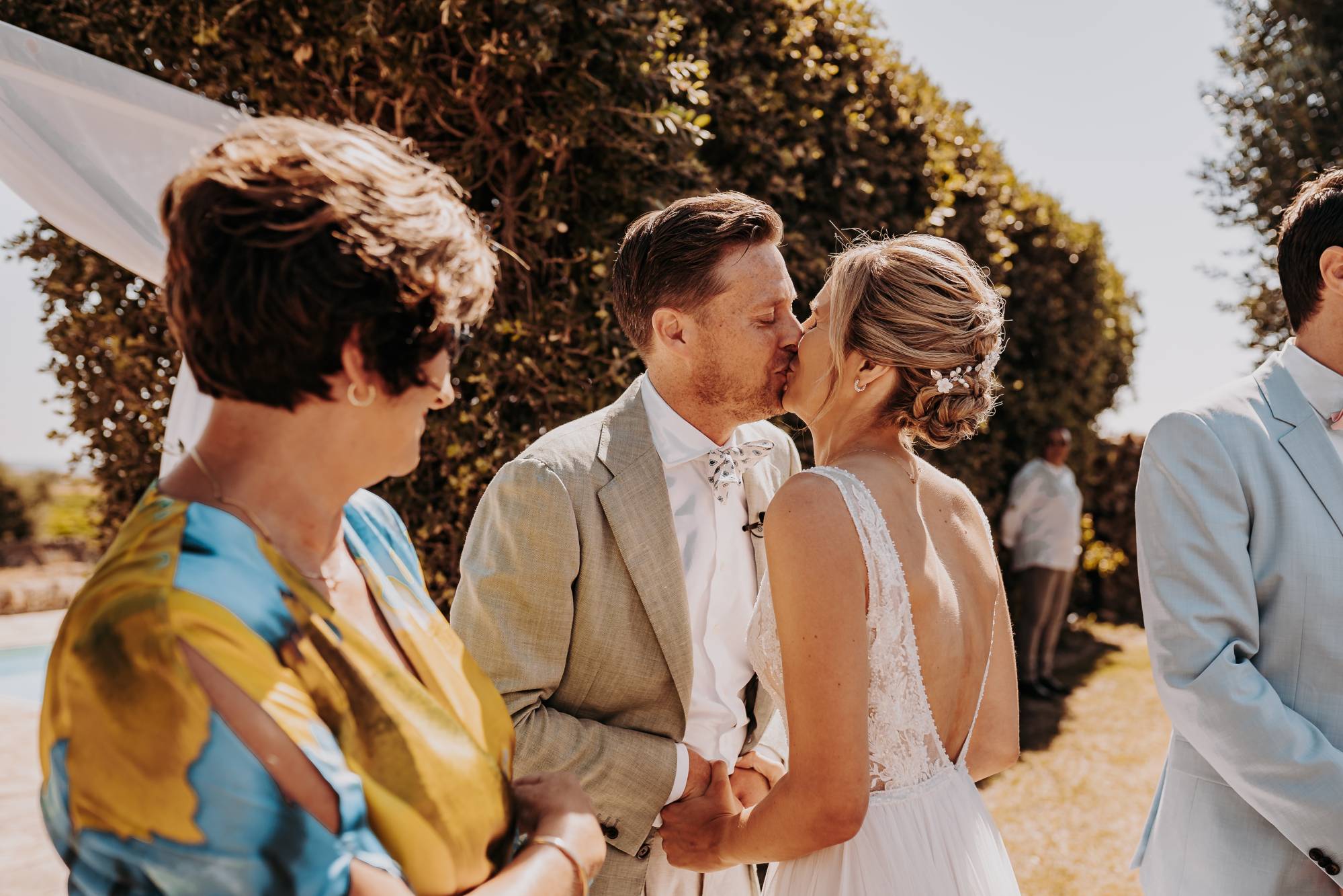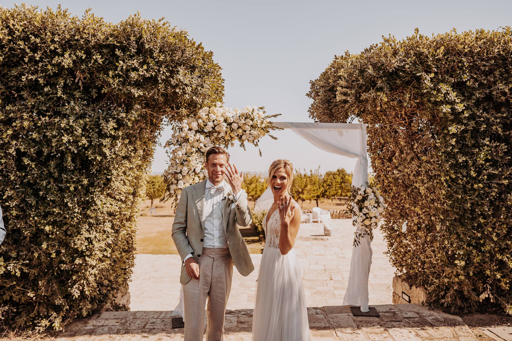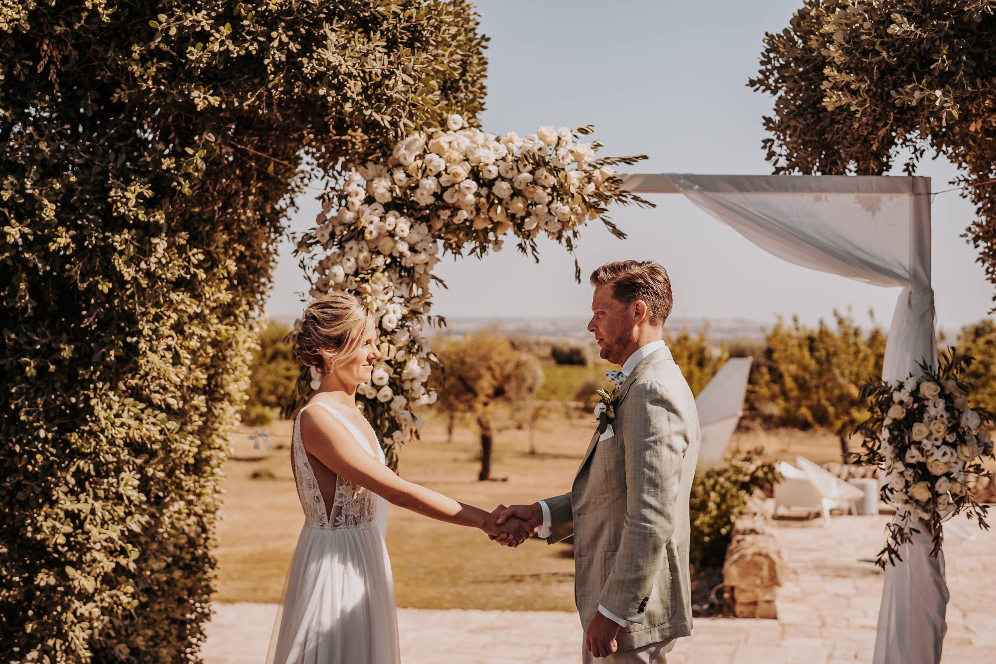 Il giorno del matrimonio, il cielo azzurro e la luce calda del tramonto pugliese hanno fatto da cornice a un rito simbolico che ha reso questo momento davvero speciale. Maurice e Noortje hanno scambiato le loro promesse d’amore all’aperto, circondati dal verde dei vigneti e dagli ulivi secolari della masseria. Un'atmosfera unica che ha emozionato tutti i presenti, con la natura che ha fatto da scenografia alla cerimonia, facendo sentire ogni ospite parte di qualcosa di speciale. Il rito, simbolico ma ricco di significato, ha coinvolto ogni invitato, facendo percepire la magia del momento.