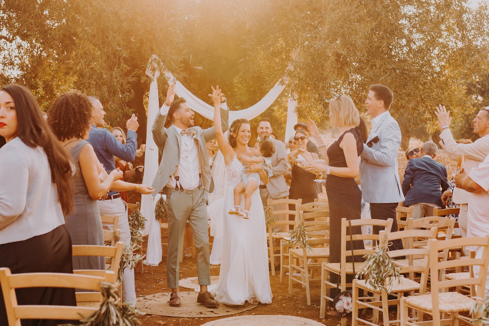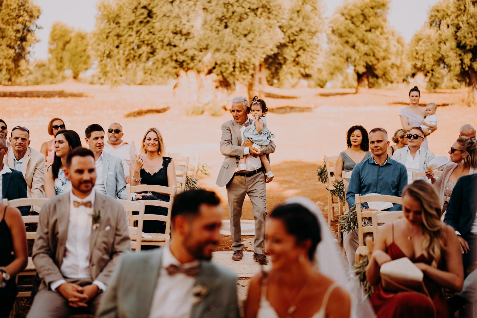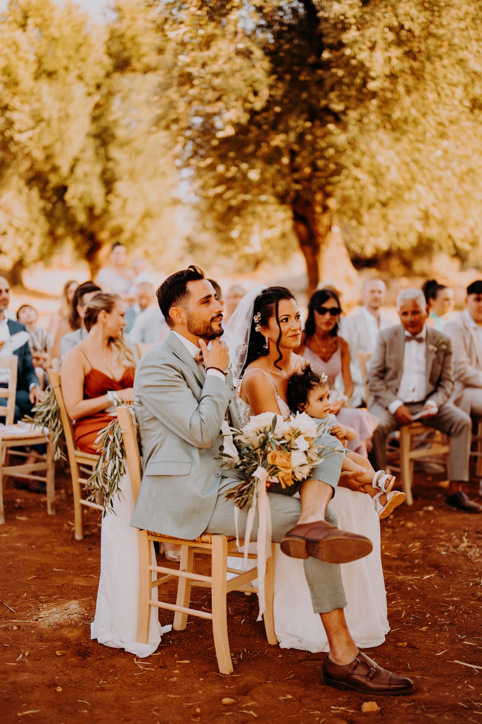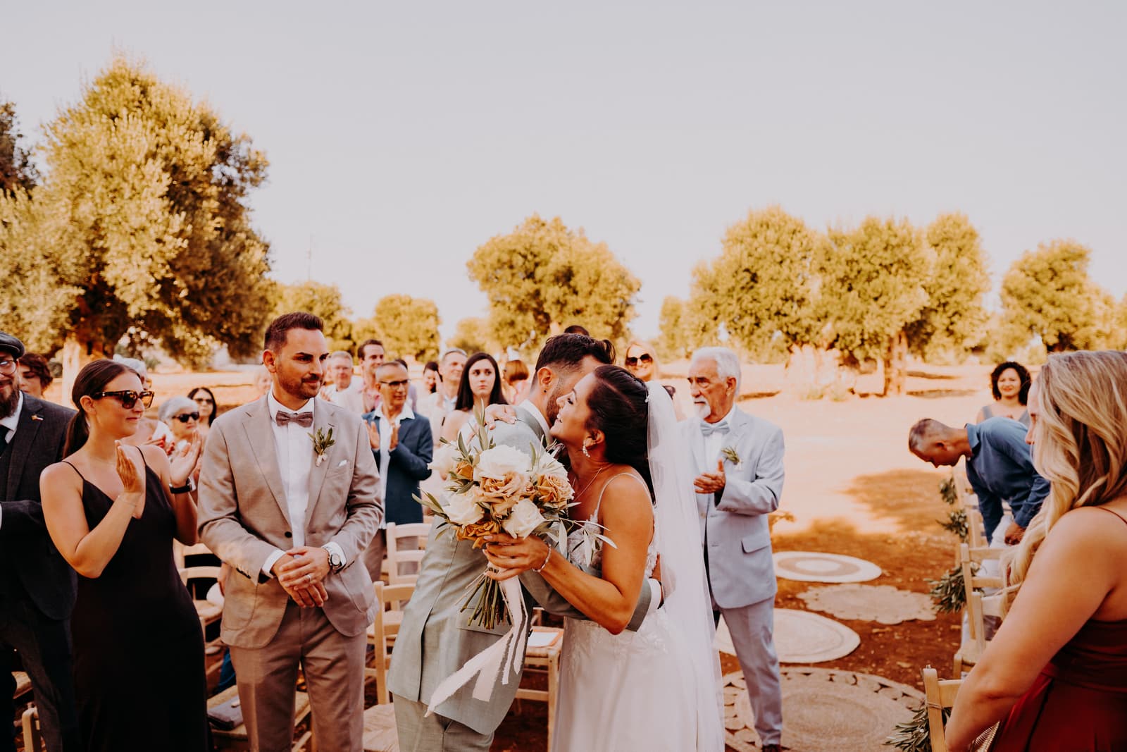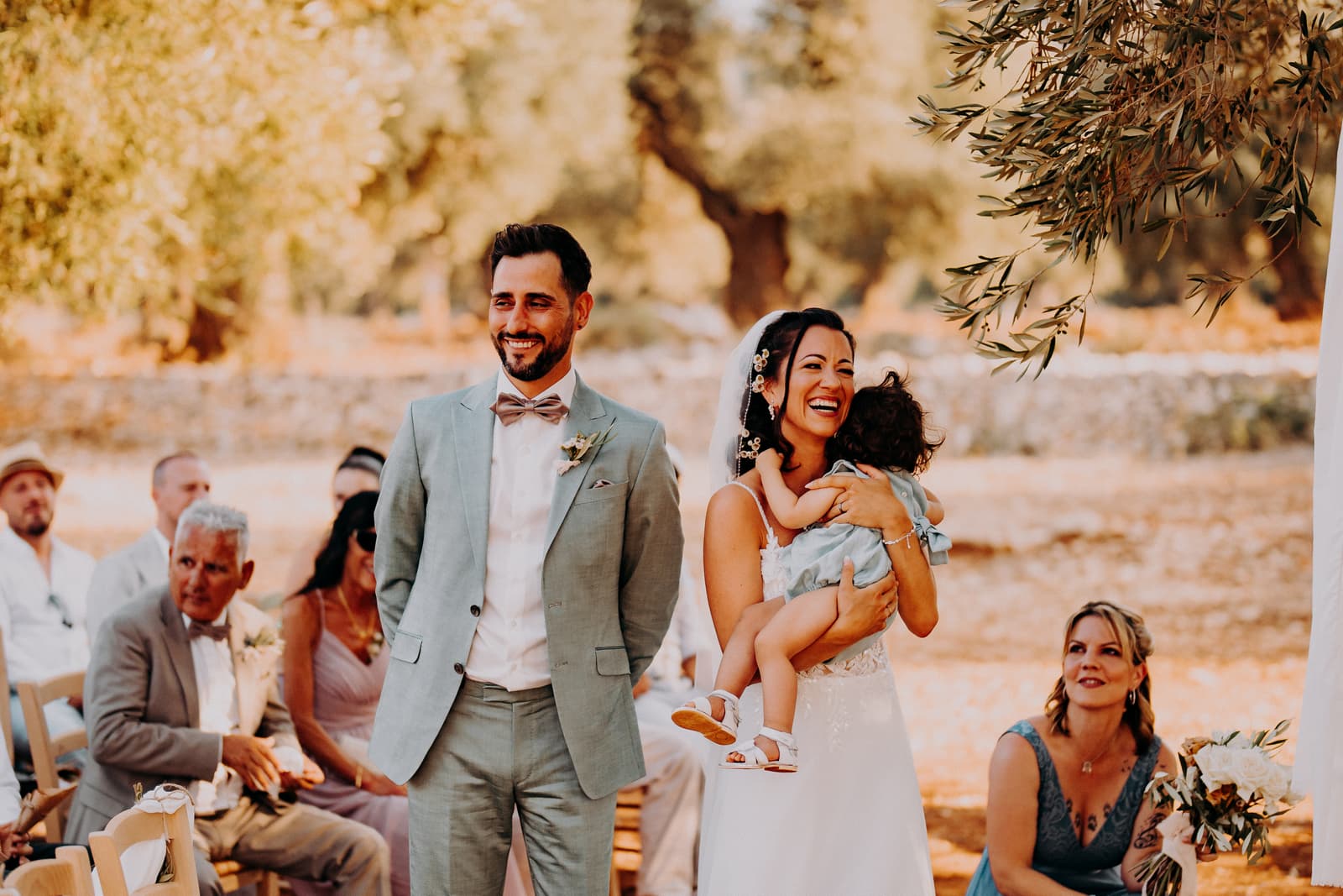 Luglio, una giornata calda e serena, ha accolto Fabbiene e Gianpaolo per il loro rito simbolico. Il matrimonio si è svolto all’aperto, tra gli ulivi della masseria, con il sole che tramontava lentamente all’orizzonte, dipingendo il cielo di sfumature dorate e arancioni. Una scenografia naturale pazzesca che ha reso l’atmosfera ancora più magica. Il rito è stato davvero emozionante, con molti momenti di commozione. Non sono mancate le lacrime, soprattutto quando si è unita alla scena la loro piccola bambina, una presenza dolcissima che ha reso tutto ancora più speciale.