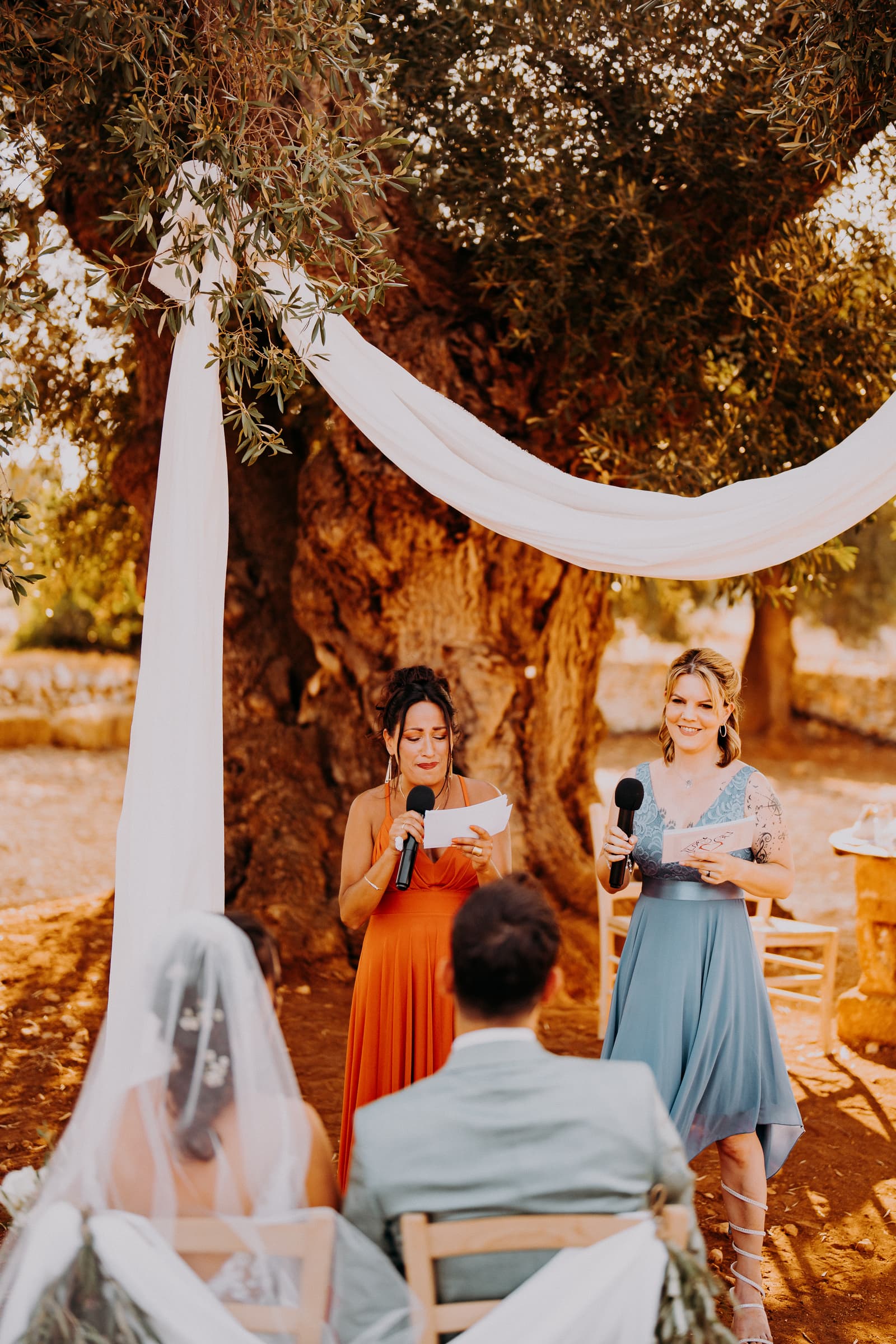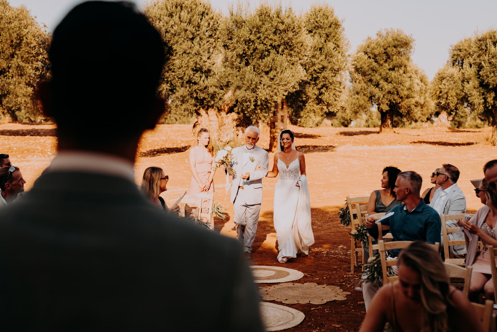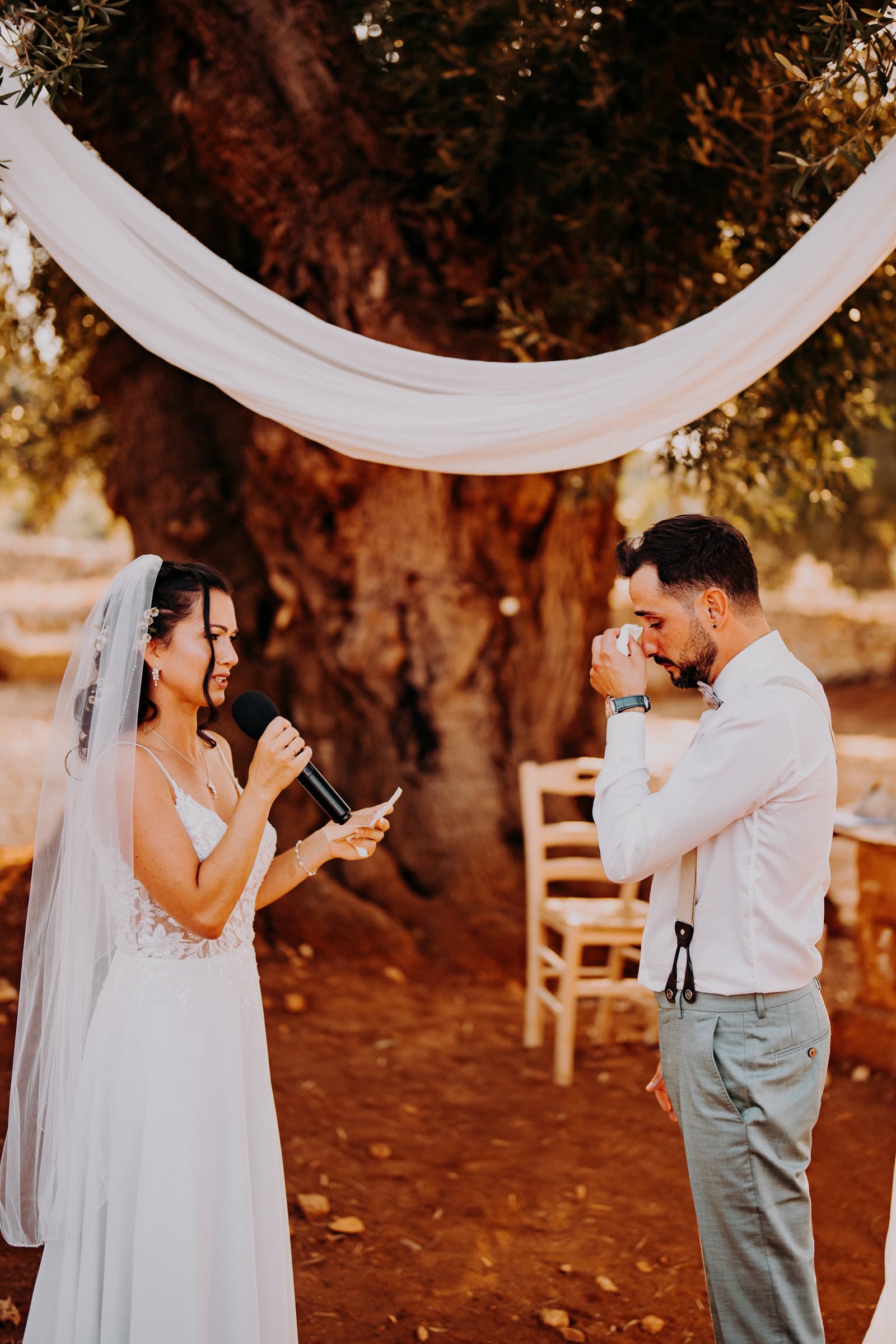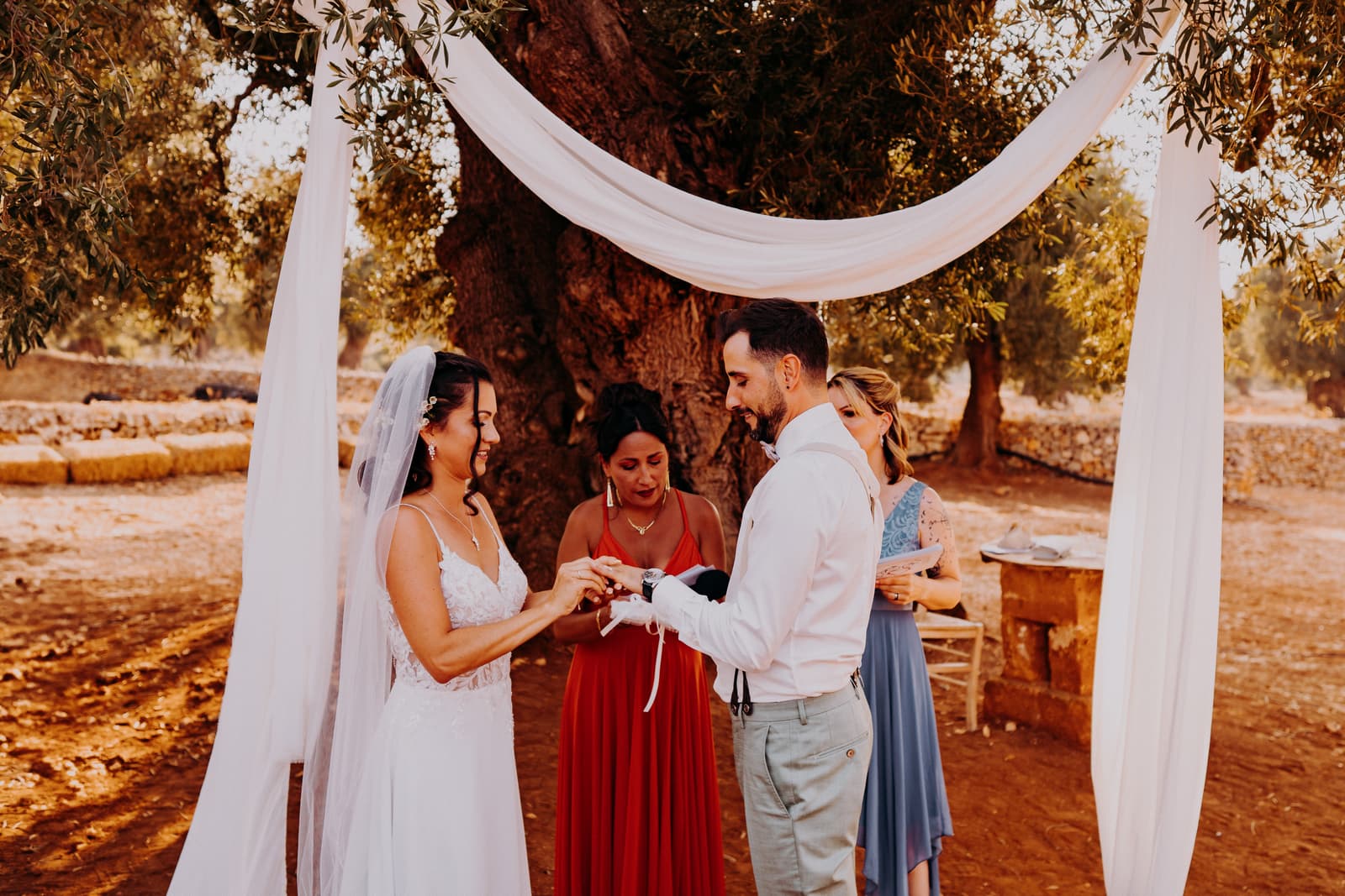 Luglio, una giornata calda e serena, ha accolto Fabbiene e Gianpaolo per il loro rito simbolico. Il matrimonio si è svolto all’aperto, tra gli ulivi della masseria, con il sole che tramontava lentamente all’orizzonte, dipingendo il cielo di sfumature dorate e arancioni. Una scenografia naturale pazzesca che ha reso l’atmosfera ancora più magica. Il rito è stato davvero emozionante, con molti momenti di commozione. Non sono mancate le lacrime, soprattutto quando si è unita alla scena la loro piccola bambina, una presenza dolcissima che ha reso tutto ancora più speciale.