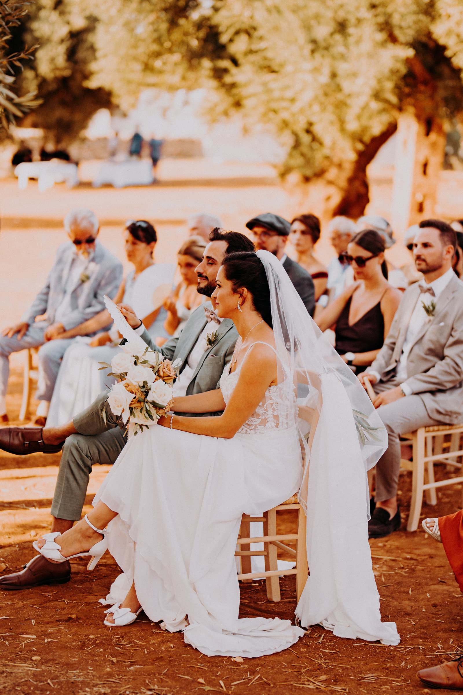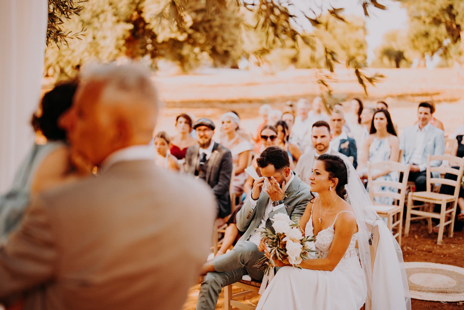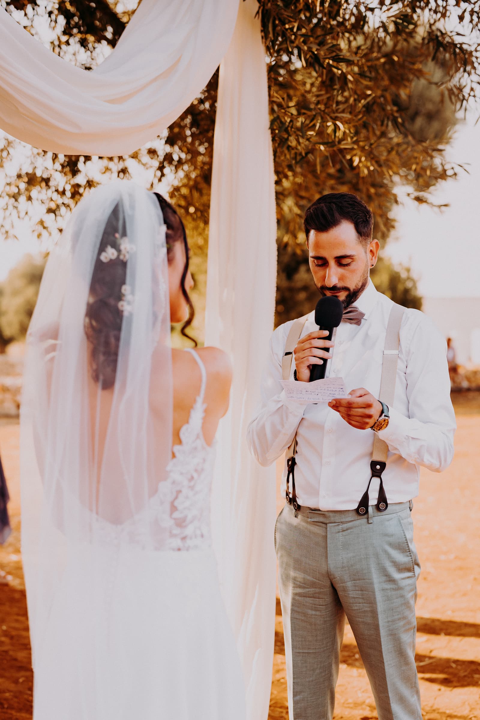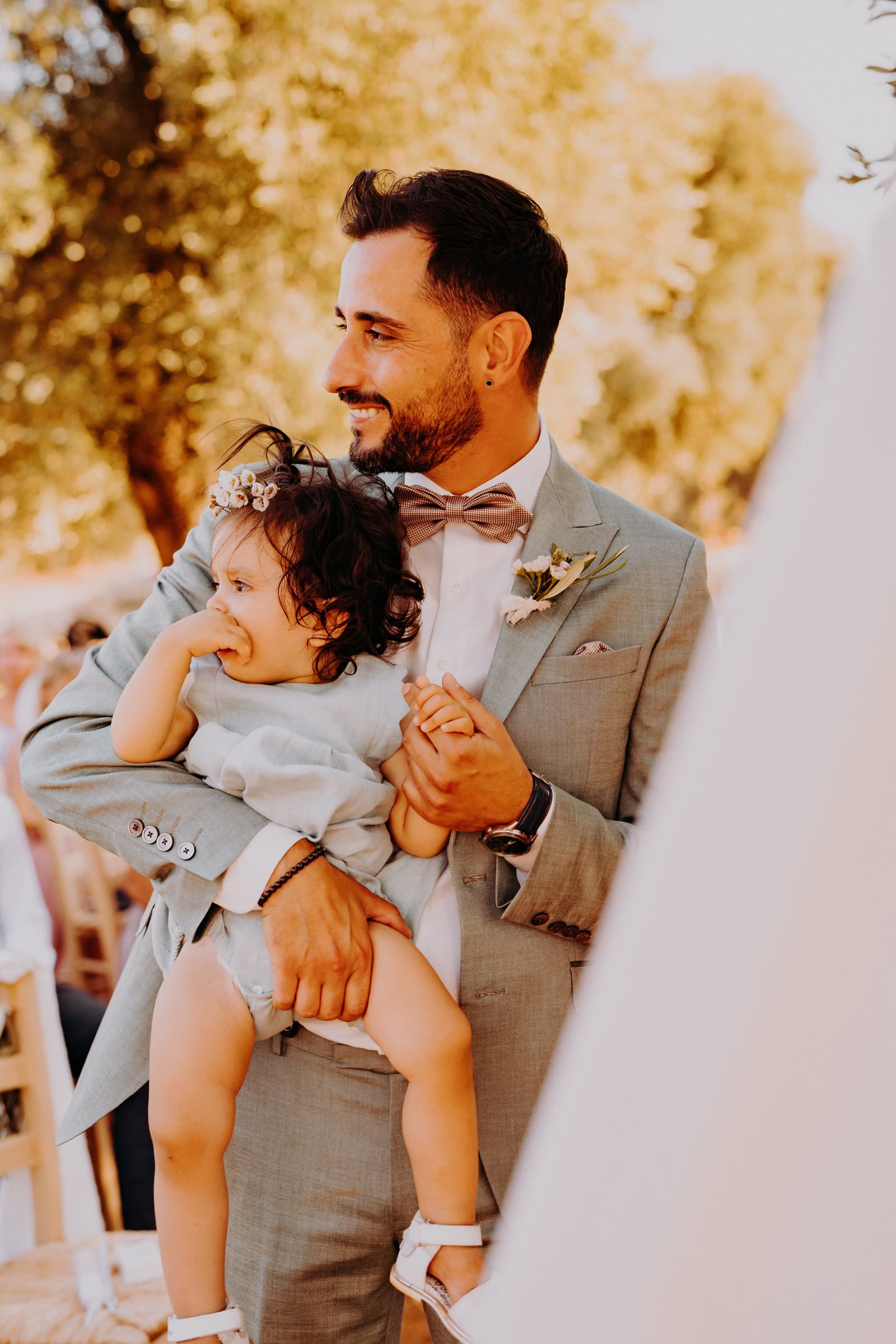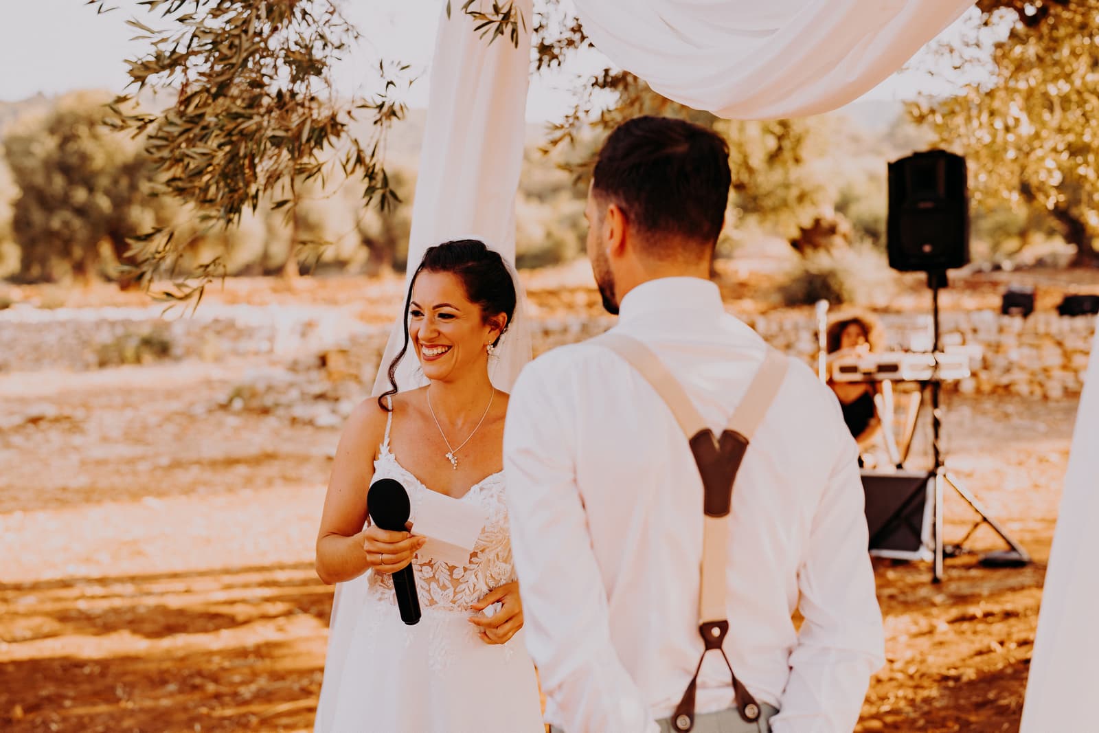 Luglio, una giornata calda e serena, ha accolto Fabbiene e Gianpaolo per il loro rito simbolico. Il matrimonio si è svolto all’aperto, tra gli ulivi della masseria, con il sole che tramontava lentamente all’orizzonte, dipingendo il cielo di sfumature dorate e arancioni. Una scenografia naturale pazzesca che ha reso l’atmosfera ancora più magica. Il rito è stato davvero emozionante, con molti momenti di commozione. Non sono mancate le lacrime, soprattutto quando si è unita alla scena la loro piccola bambina, una presenza dolcissima che ha reso tutto ancora più speciale.