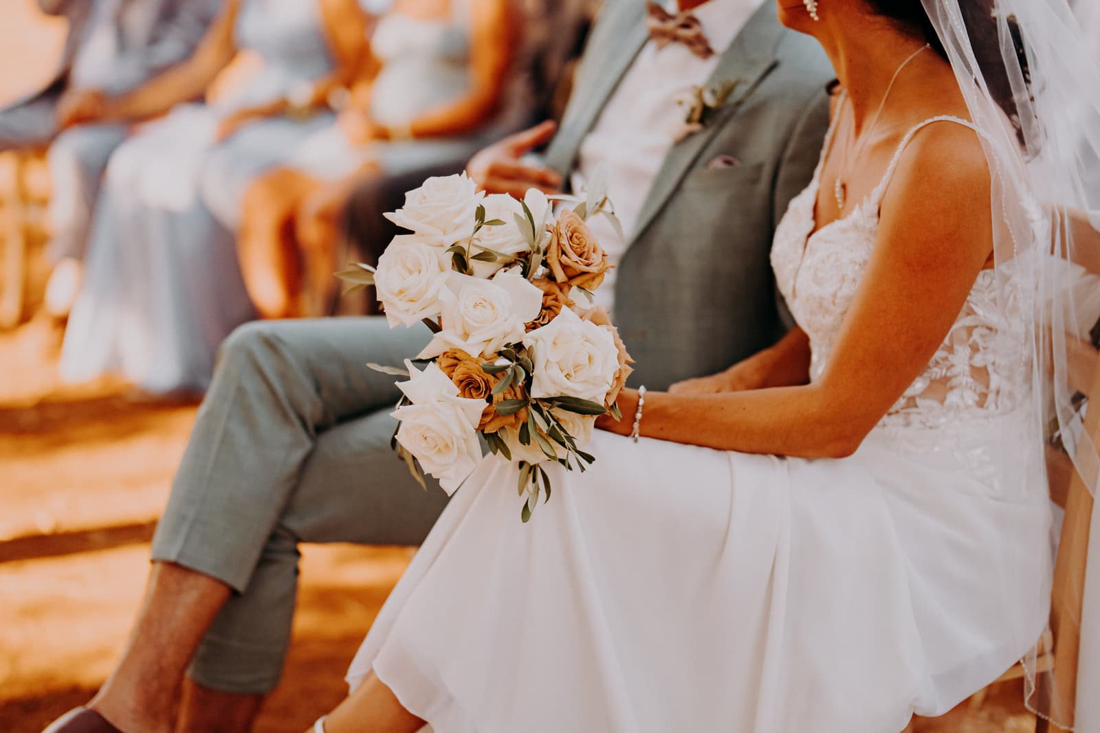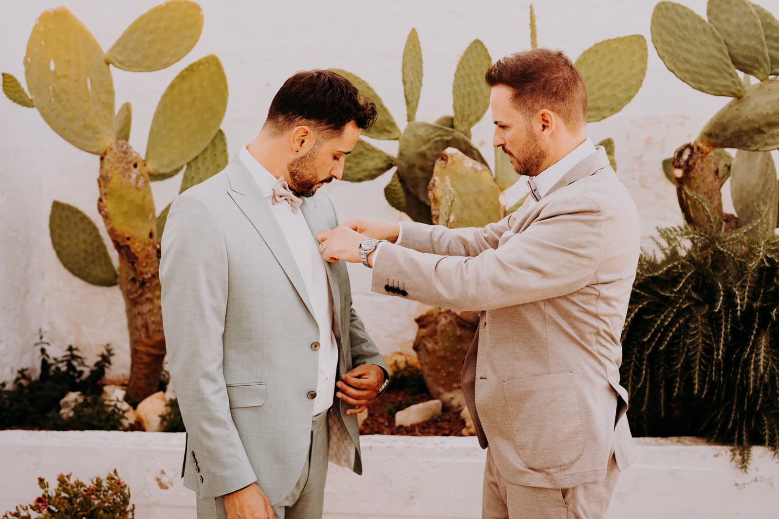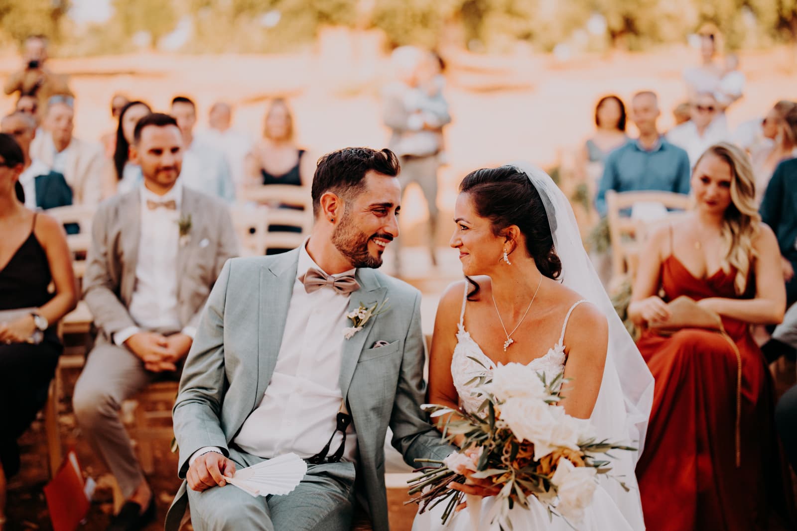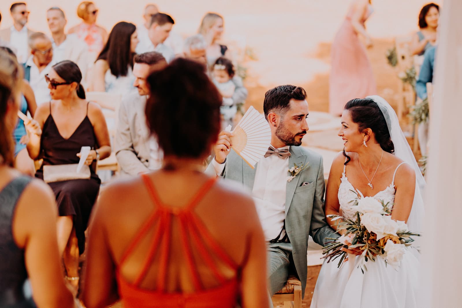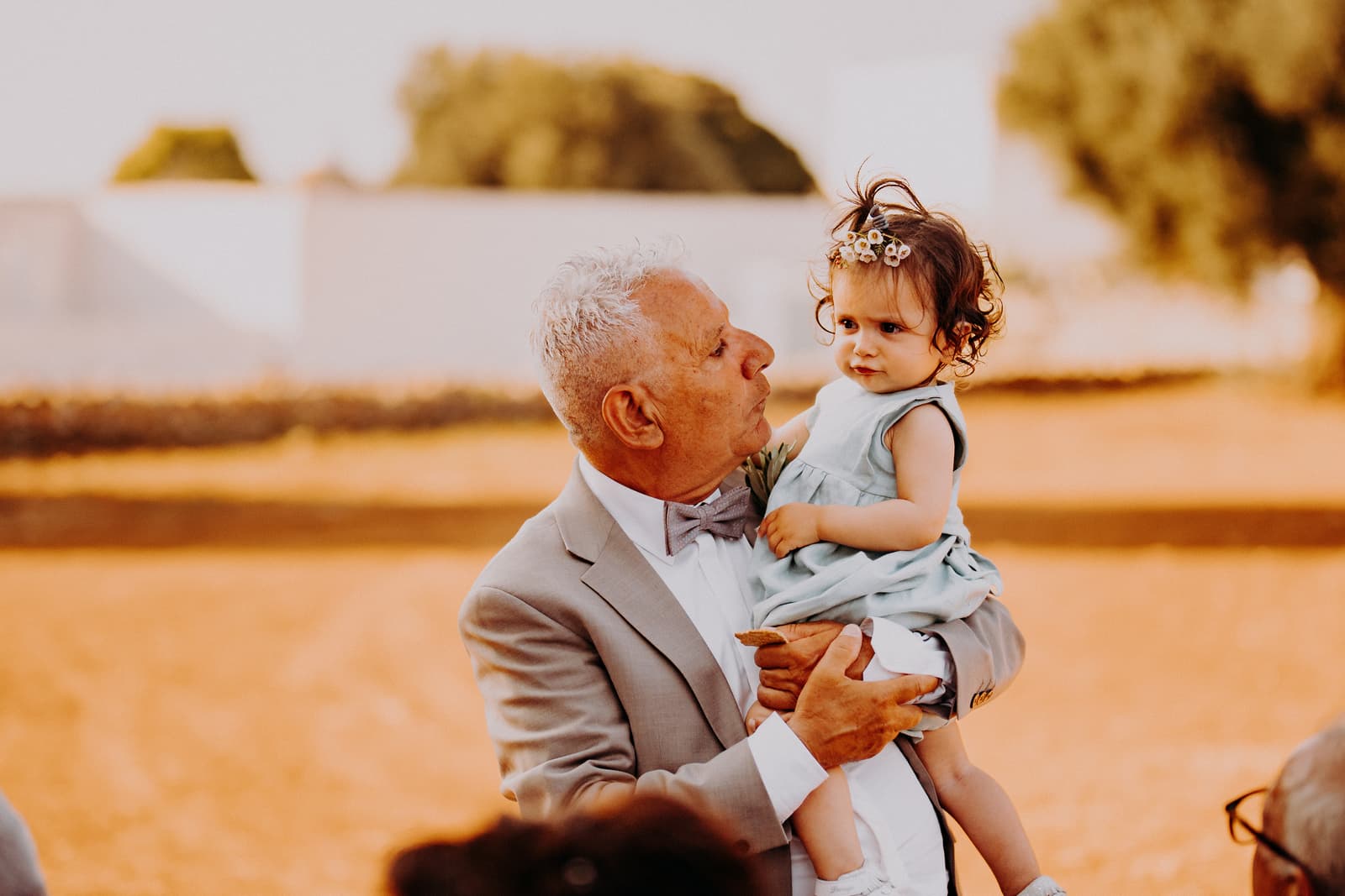 Luglio, una giornata calda e serena, ha accolto Fabbiene e Gianpaolo per il loro rito simbolico. Il matrimonio si è svolto all’aperto, tra gli ulivi della masseria, con il sole che tramontava lentamente all’orizzonte, dipingendo il cielo di sfumature dorate e arancioni. Una scenografia naturale pazzesca che ha reso l’atmosfera ancora più magica. Il rito è stato davvero emozionante, con molti momenti di commozione. Non sono mancate le lacrime, soprattutto quando si è unita alla scena la loro piccola bambina, una presenza dolcissima che ha reso tutto ancora più speciale.