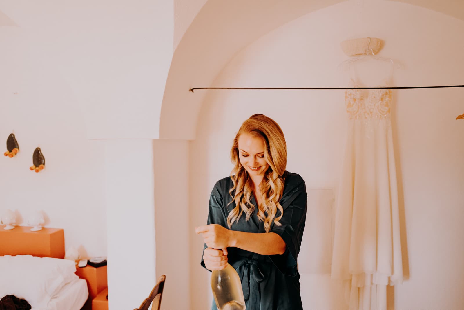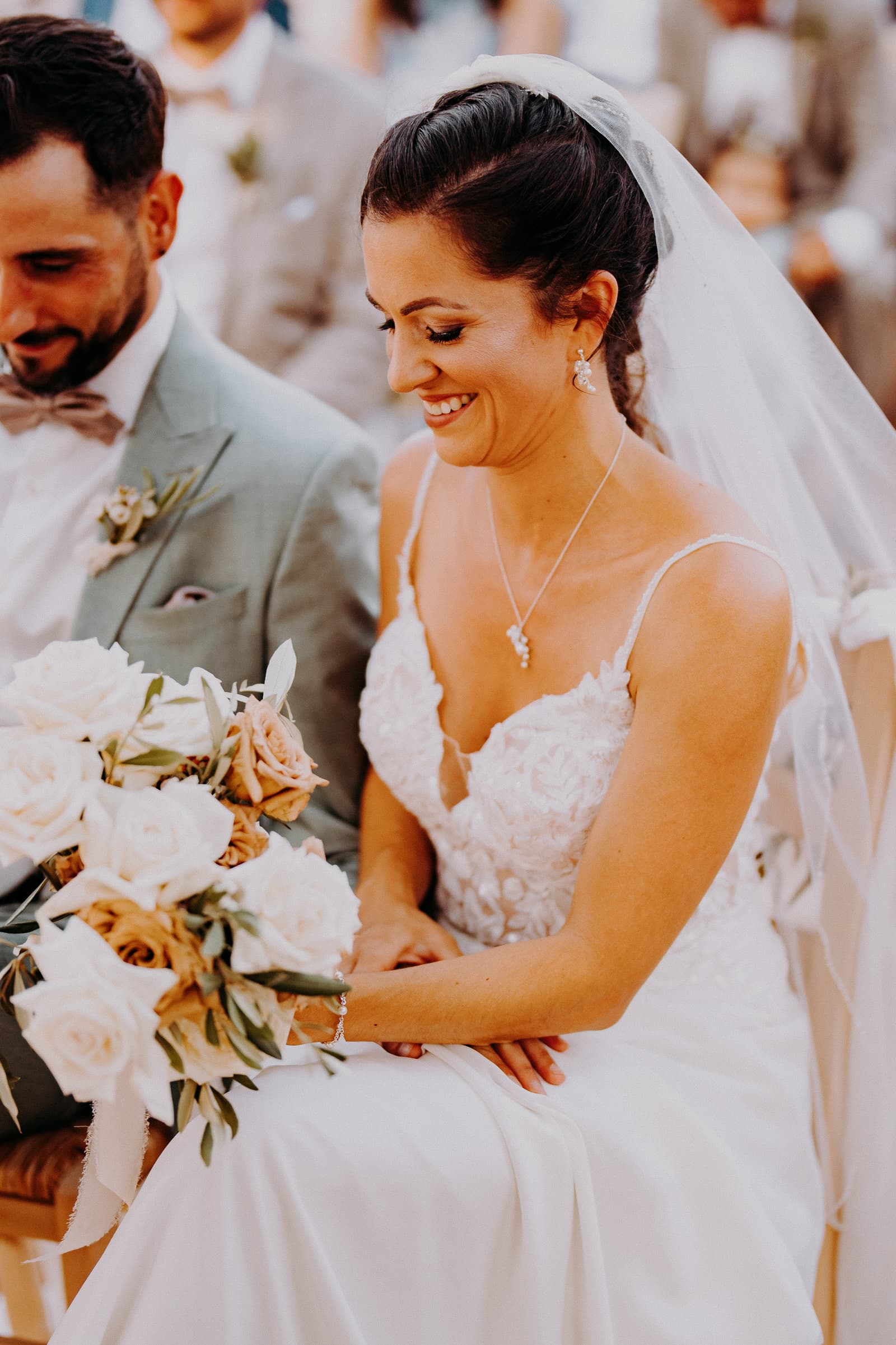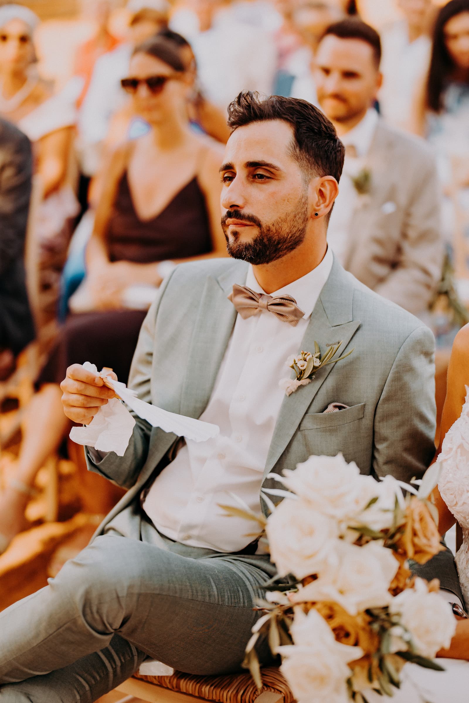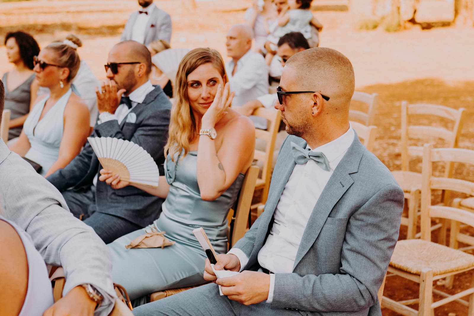 Luglio, una giornata calda e serena, ha accolto Fabbiene e Gianpaolo per il loro rito simbolico. Il matrimonio si è svolto all’aperto, tra gli ulivi della masseria, con il sole che tramontava lentamente all’orizzonte, dipingendo il cielo di sfumature dorate e arancioni. Una scenografia naturale pazzesca che ha reso l’atmosfera ancora più magica. Il rito è stato davvero emozionante, con molti momenti di commozione. Non sono mancate le lacrime, soprattutto quando si è unita alla scena la loro piccola bambina, una presenza dolcissima che ha reso tutto ancora più speciale.