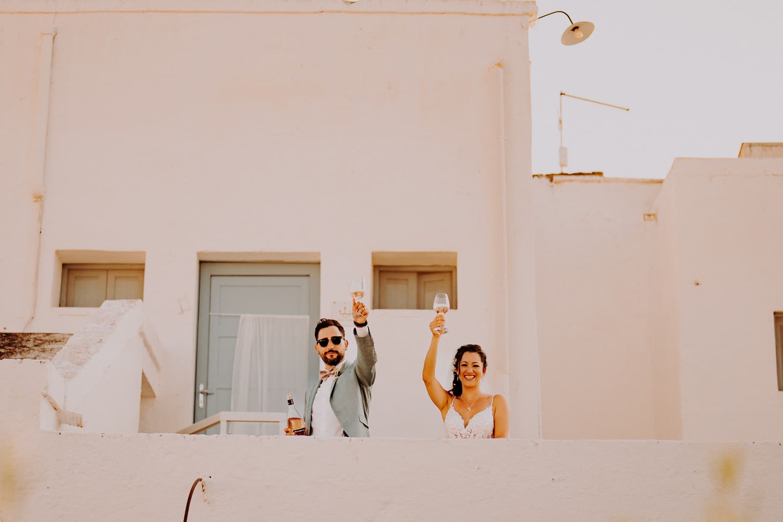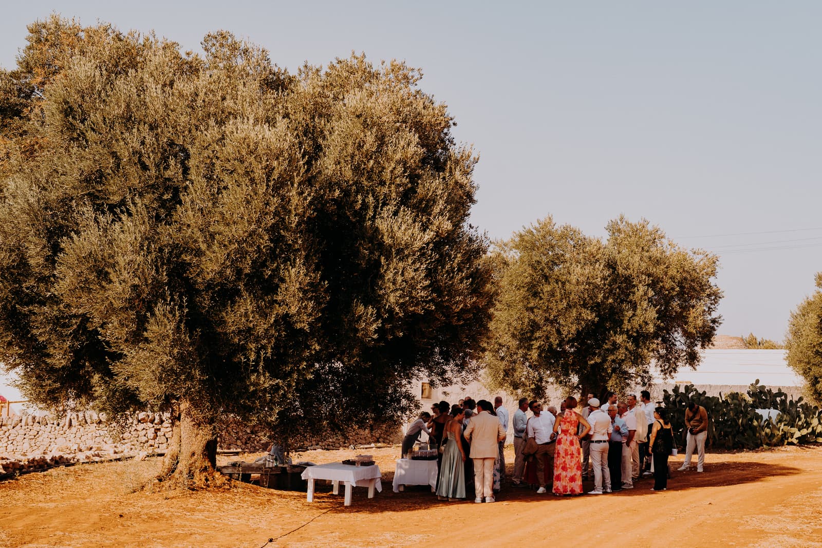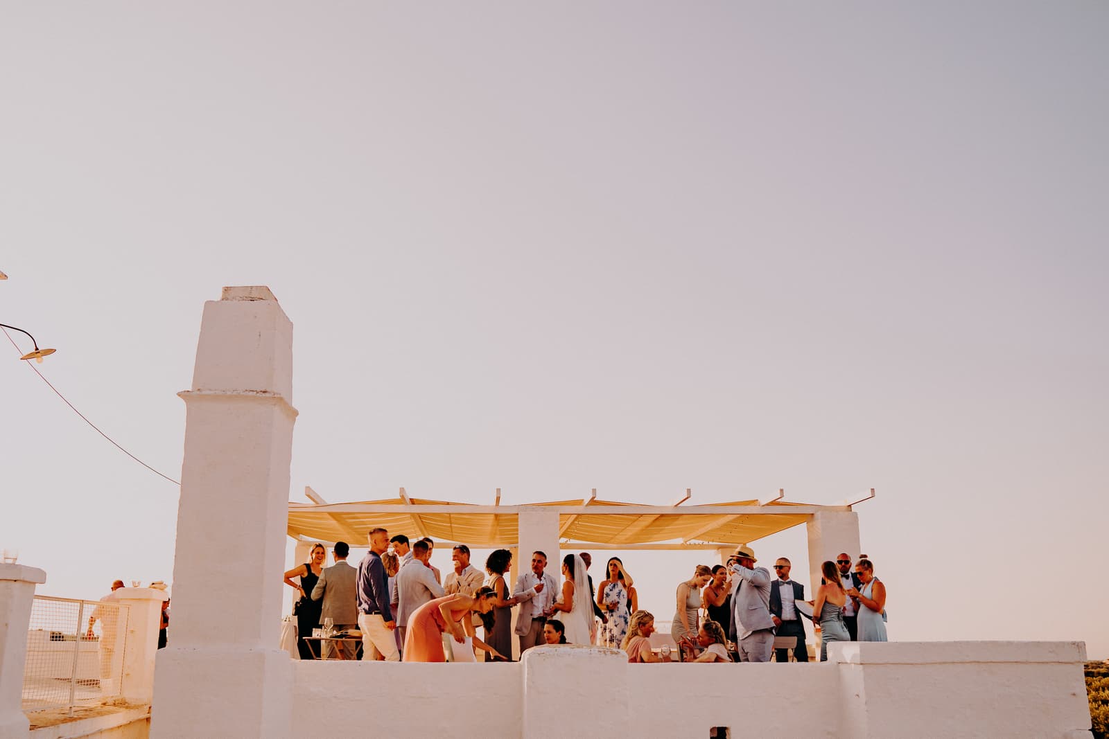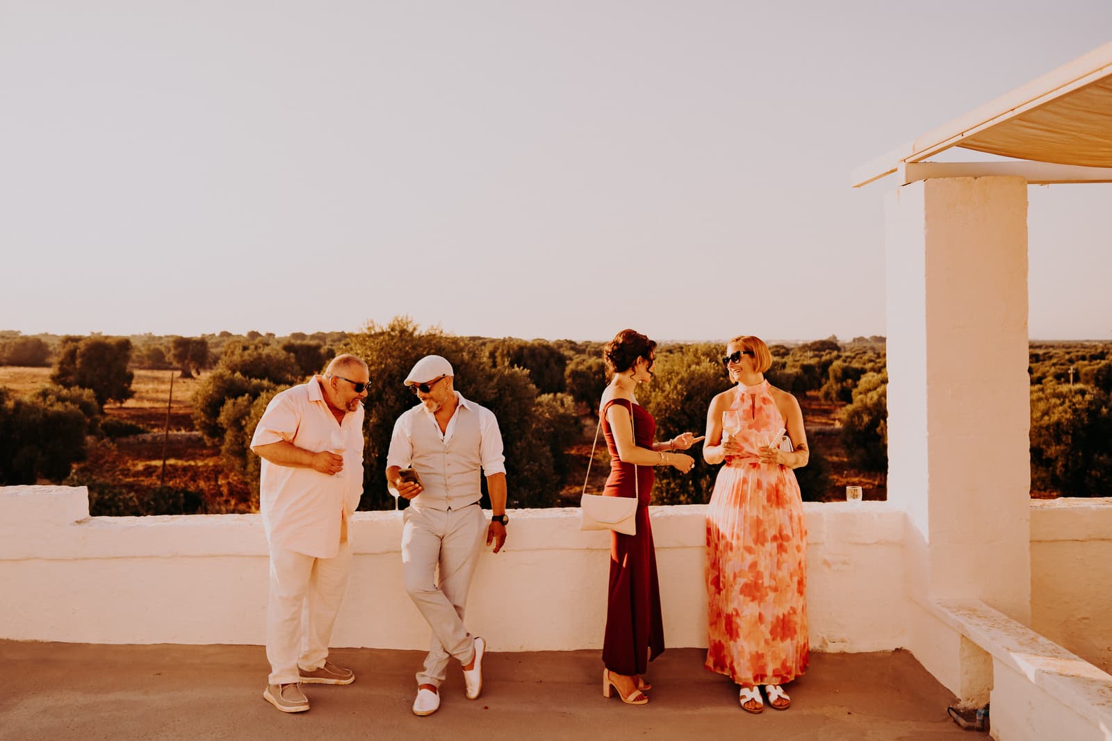 Dopo la cerimonia e gli scatti, gli sposi e gli invitati si sono concessi un aperitivo sulla terrazza della masseria, un posto perfetto per godersi il panorama e rilassarsi in buona compagnia. L’atmosfera era conviviale, con tutti che sorseggiavano drink freschi mentre si godevano il panorama mozzafiato e il cielo che cambiava colore con il calar della sera.