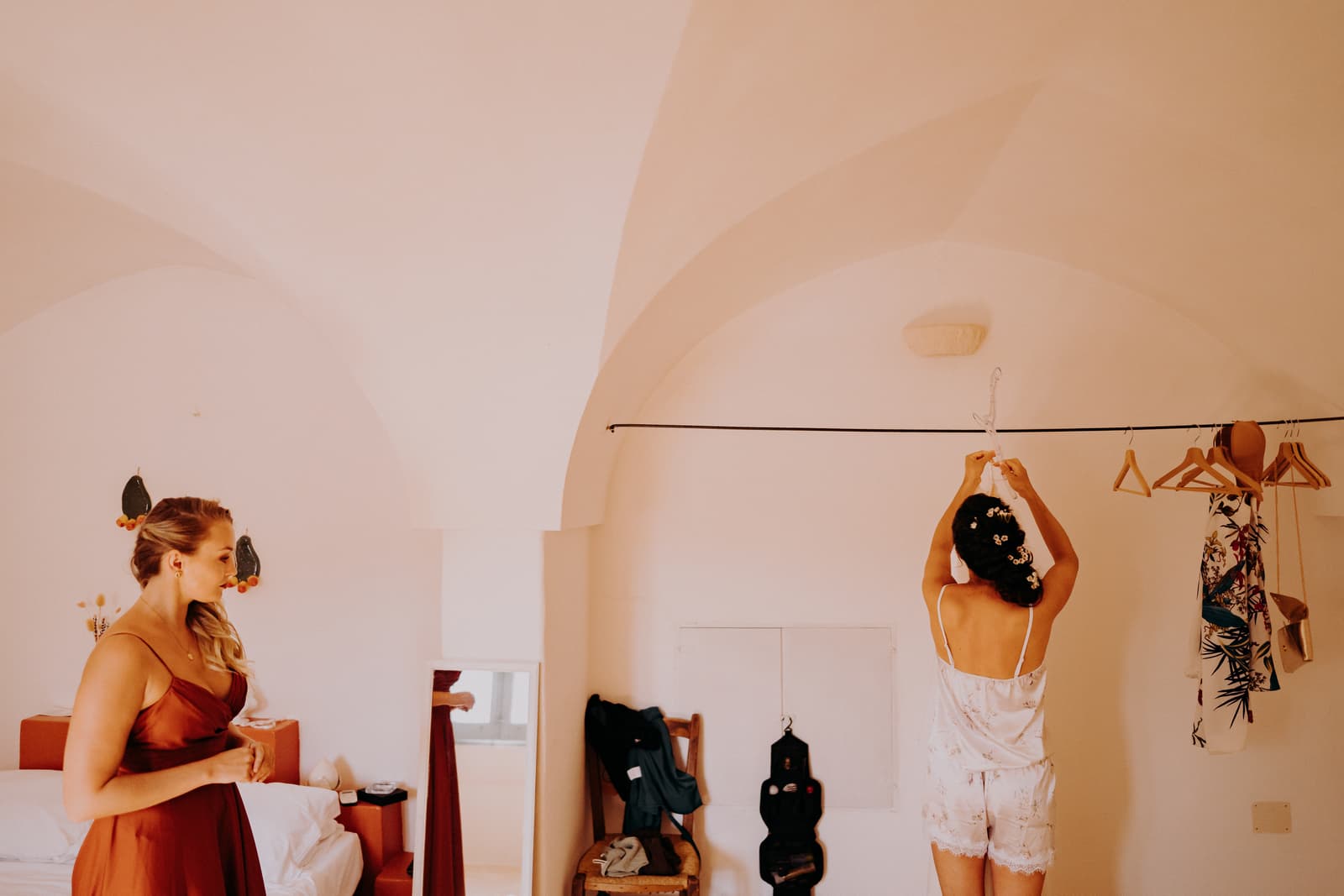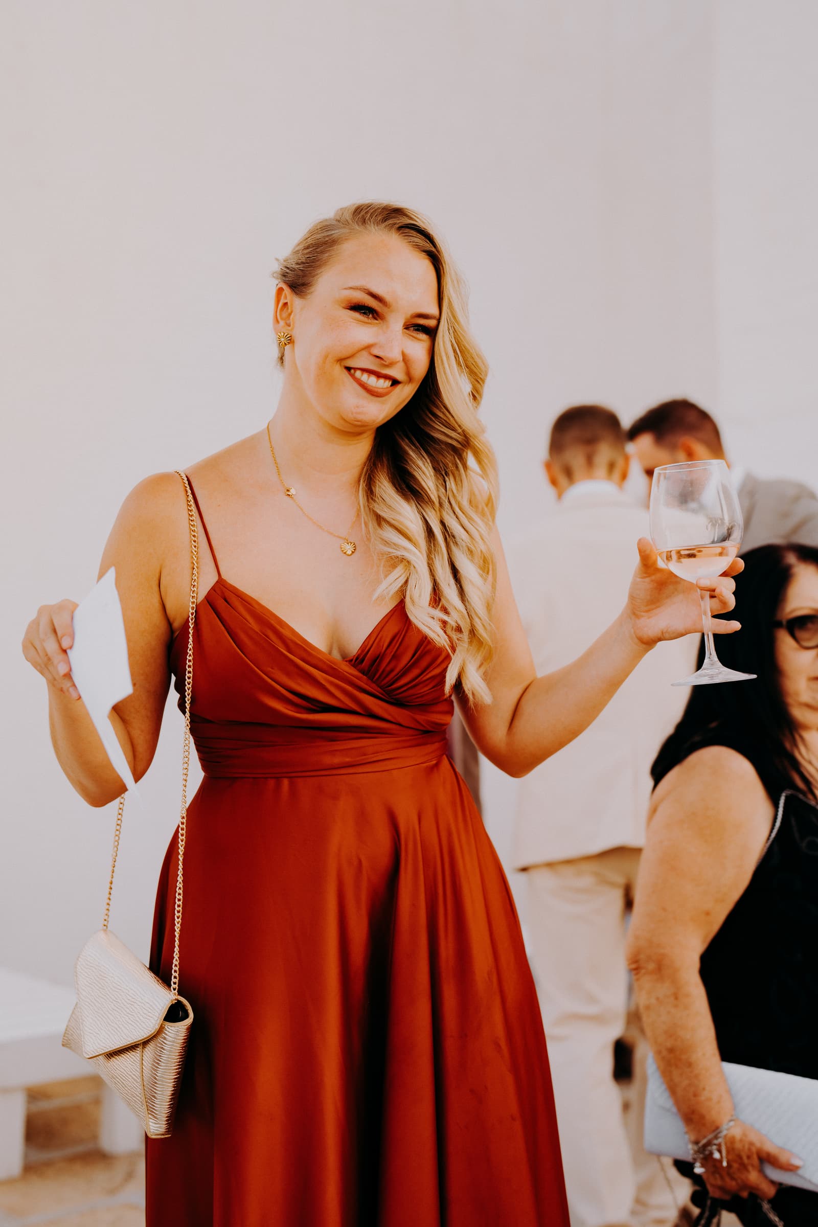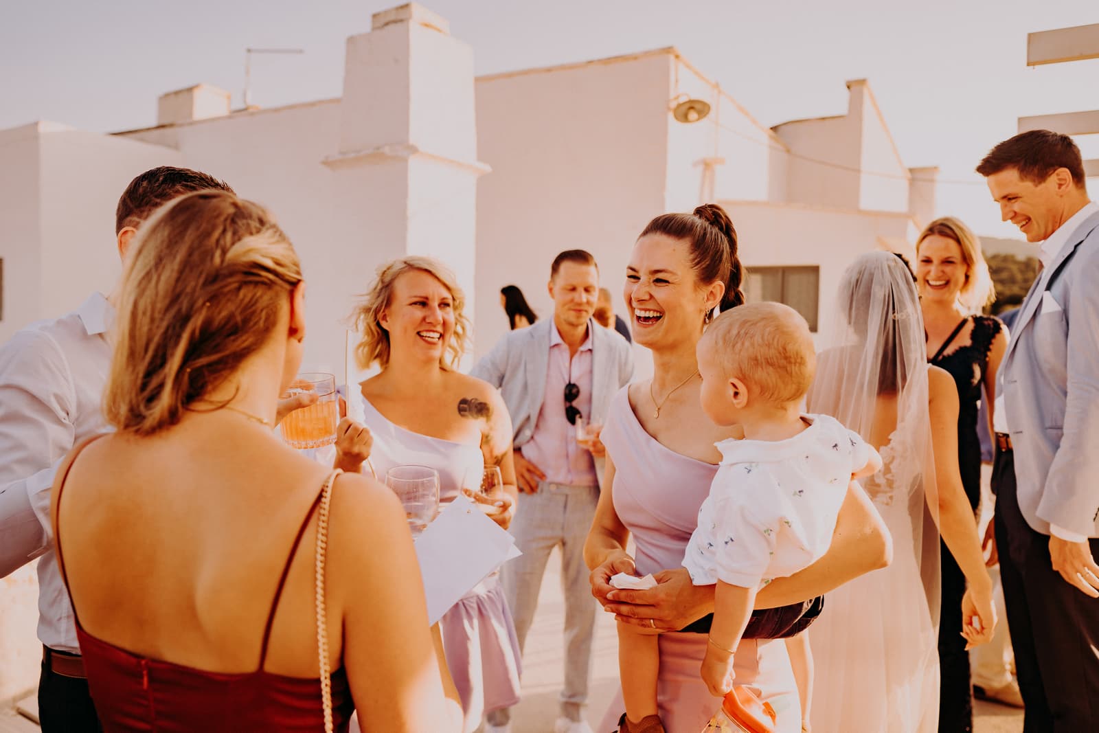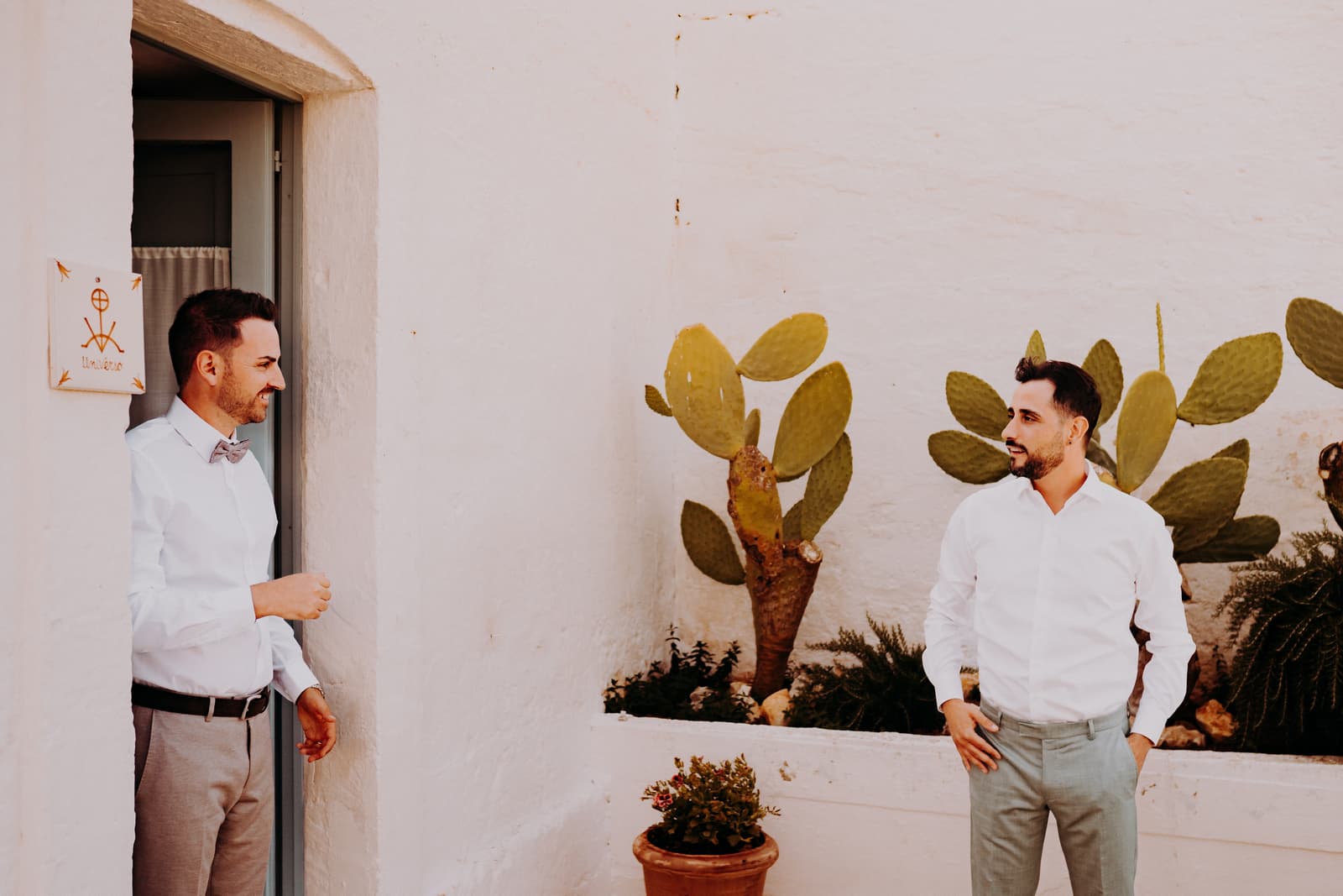 Dopo la cerimonia e gli scatti, gli sposi e gli invitati si sono concessi un aperitivo sulla terrazza della masseria, un posto perfetto per godersi il panorama e rilassarsi in buona compagnia. L’atmosfera era conviviale, con tutti che sorseggiavano drink freschi mentre si godevano il panorama mozzafiato e il cielo che cambiava colore con il calar della sera.
