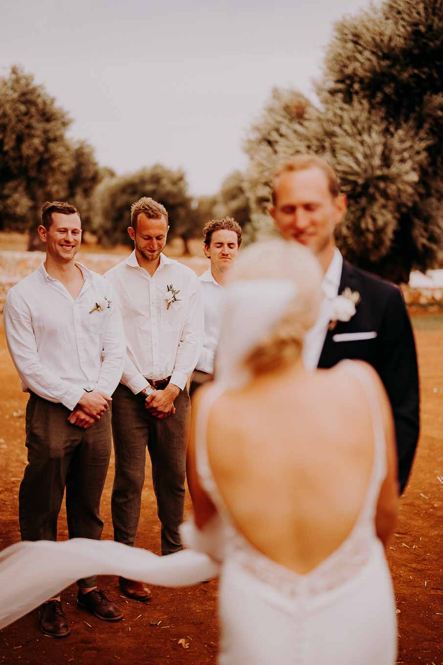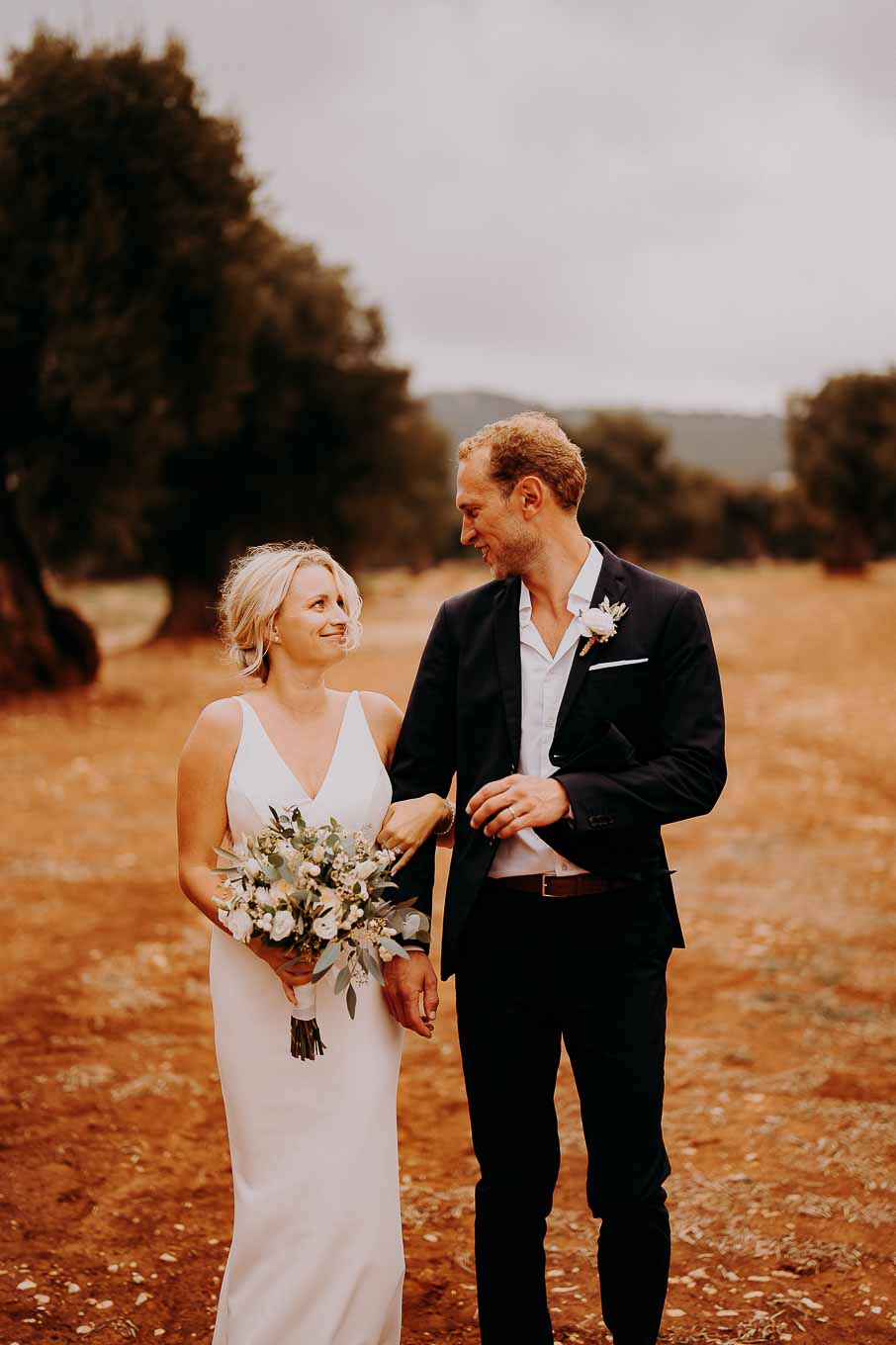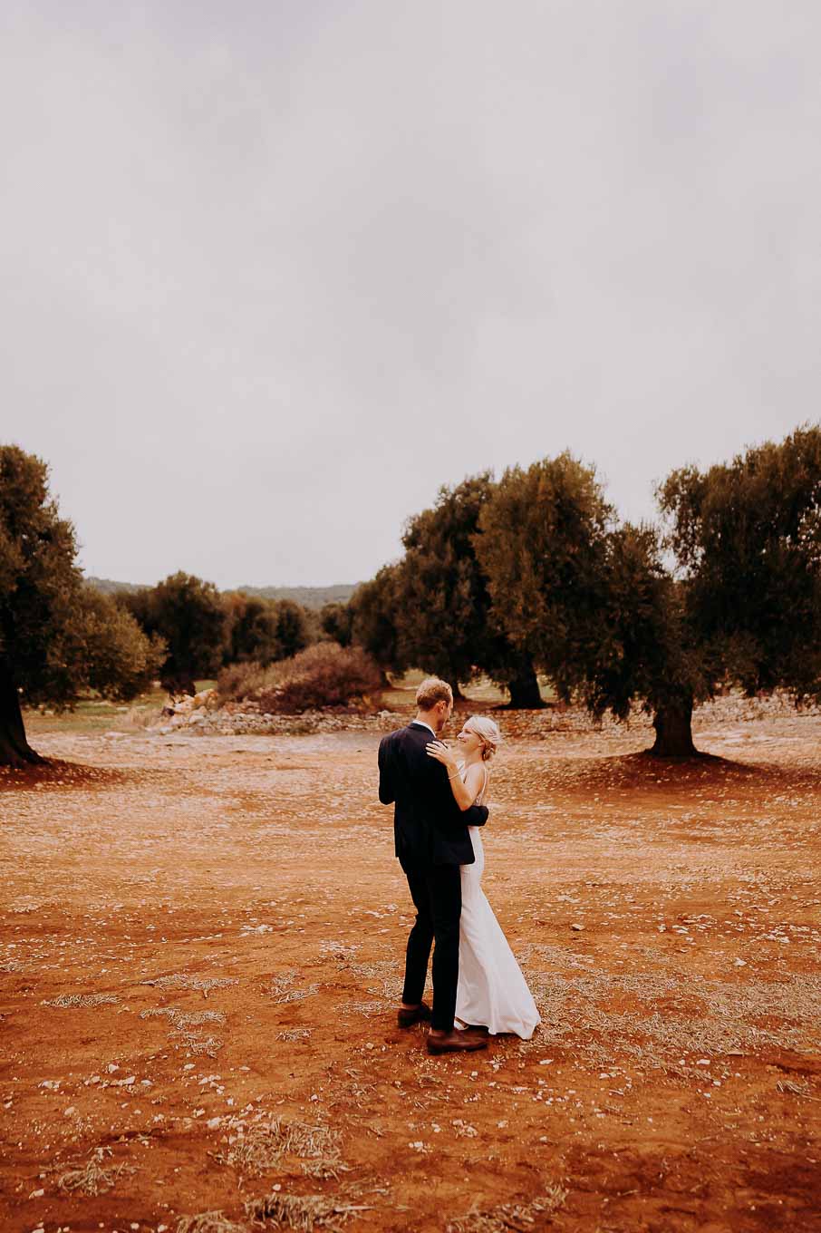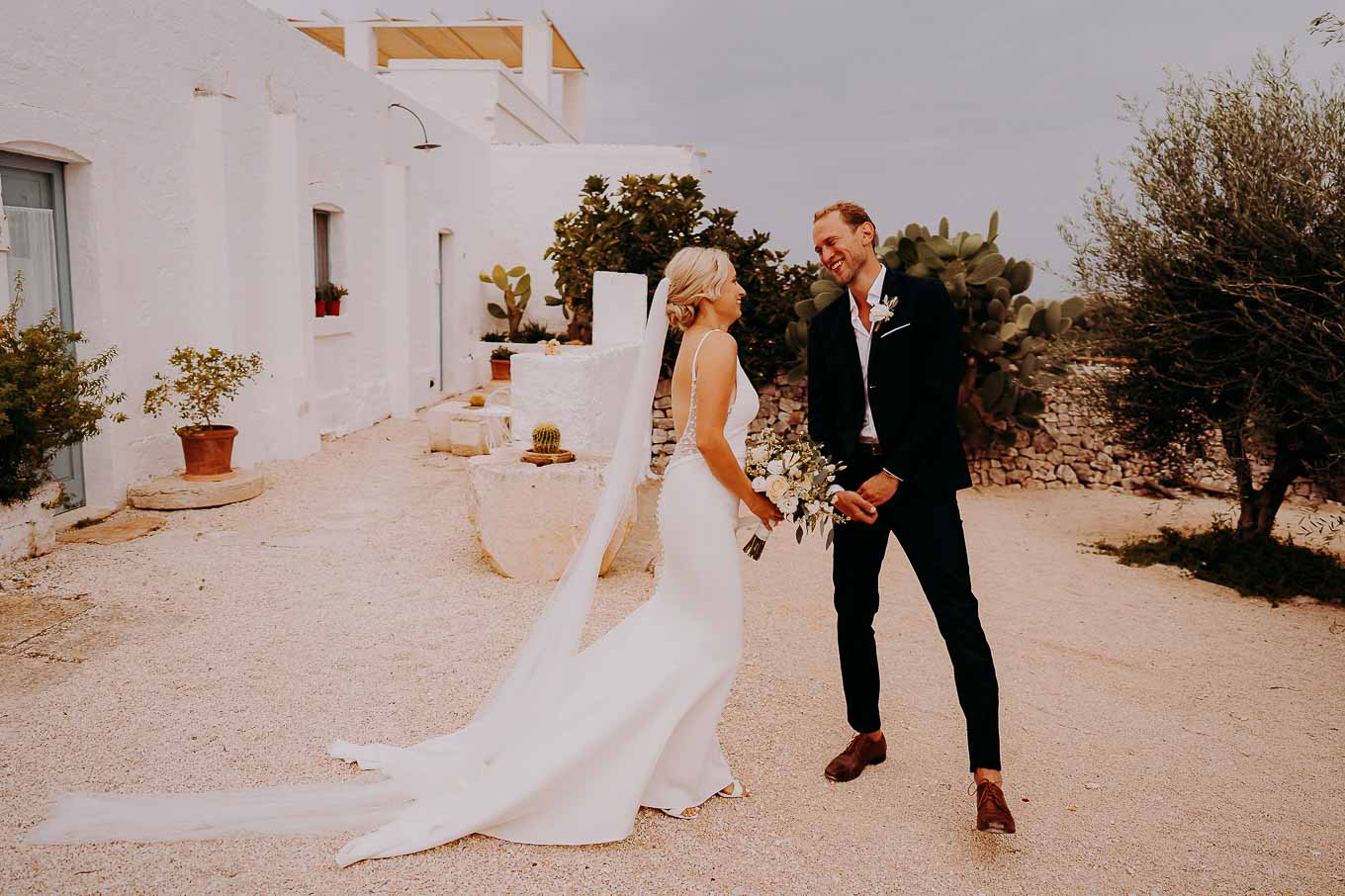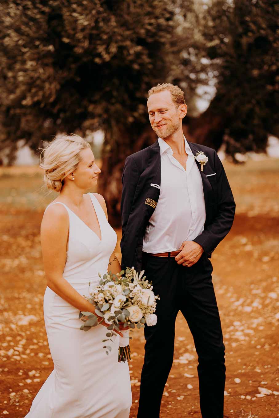 Dopo la cerimonia, gli sposi si sono concessi una passeggiata tra gli ulivi secolari della masseria, immortalando momenti indimenticabili al tramonto. La luce calda e dorata della sera, tipica della Puglia, ha reso ogni scatto unico e suggestivo.