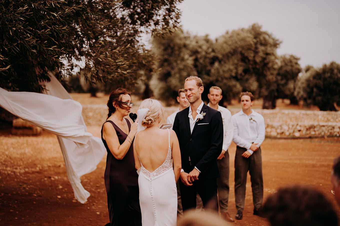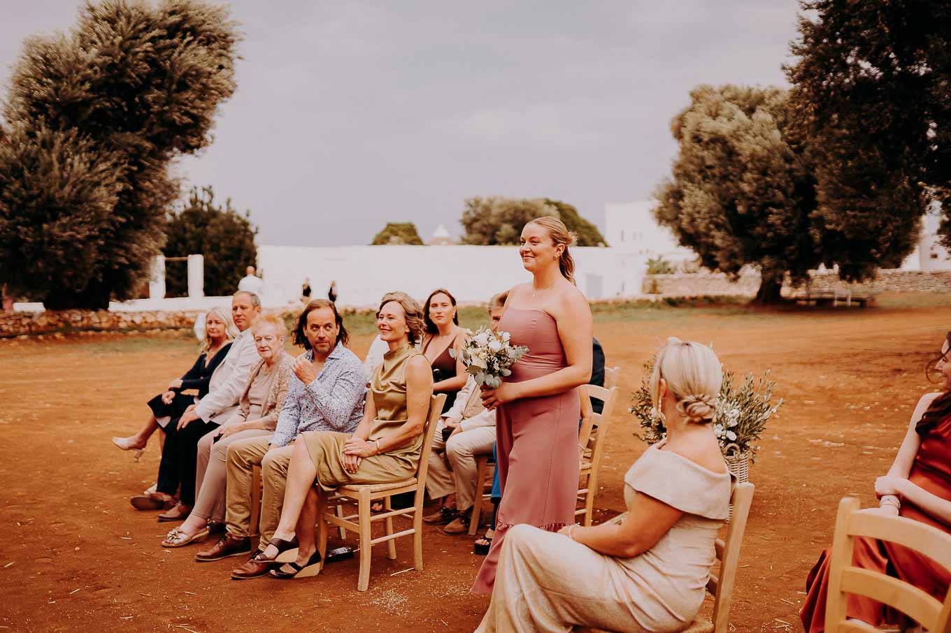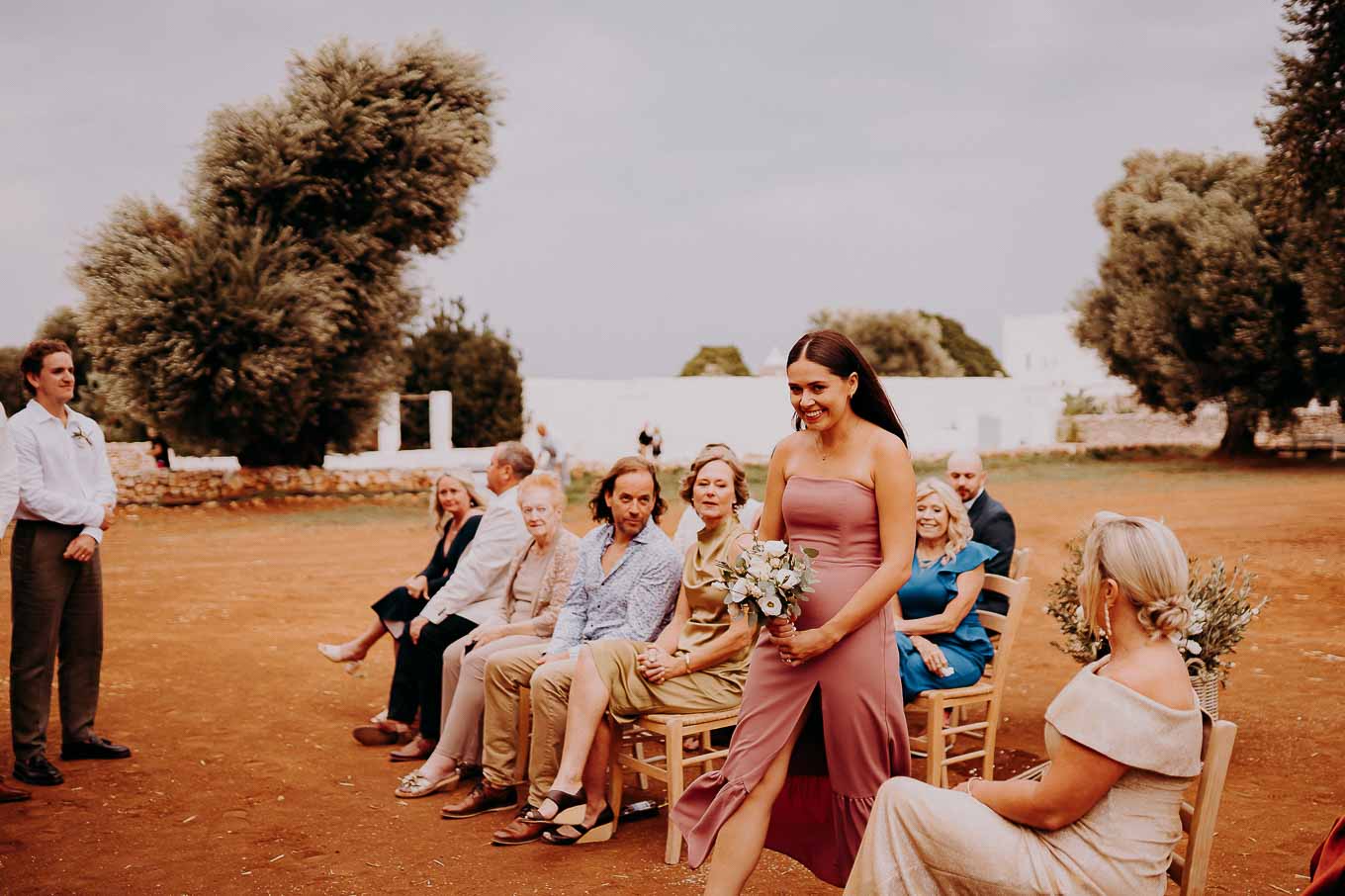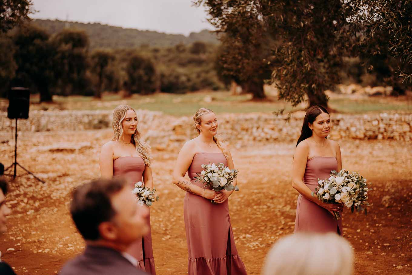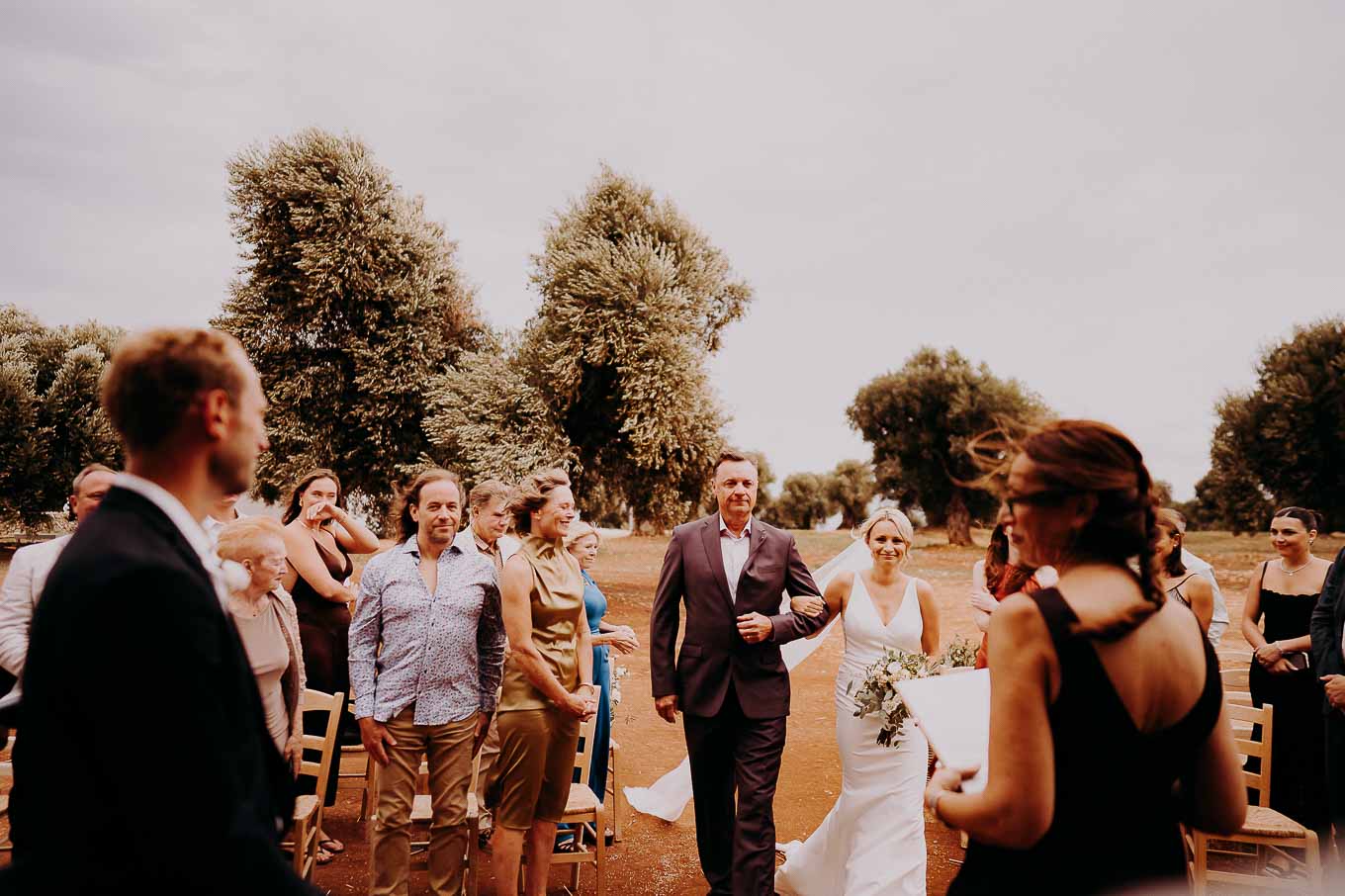 Il rito simbolico si è svolto all'esterno, tra gli ulivi secolari, con una luce calda che avvolgeva gli sposi e gli invitati. Taylor, accompagnata dal padre e preceduta dalle damigelle, ha percorso la navata tra gli alberi d'ulivo, creando un momento di grande emozione che ha commosso tutti i presenti.