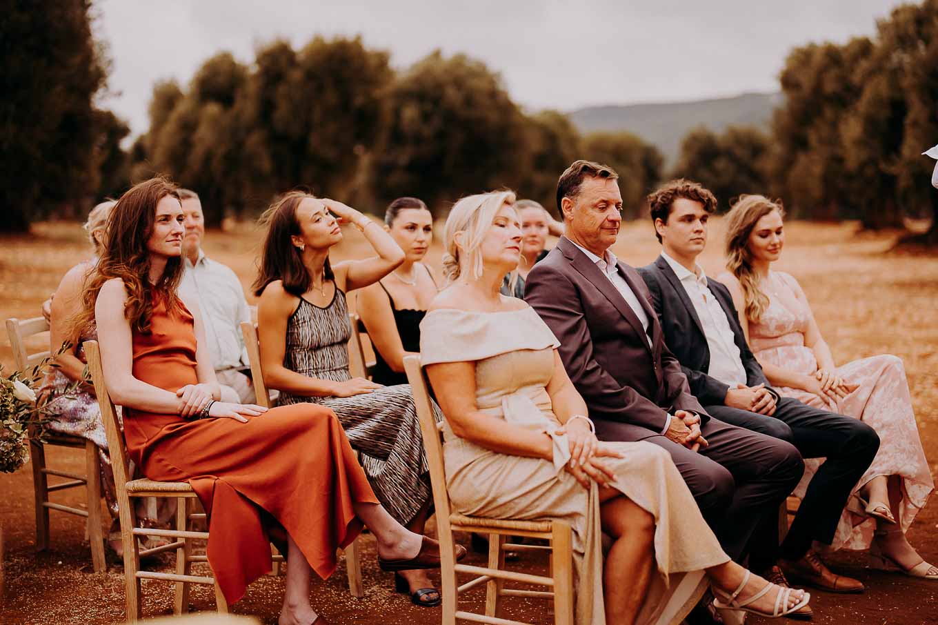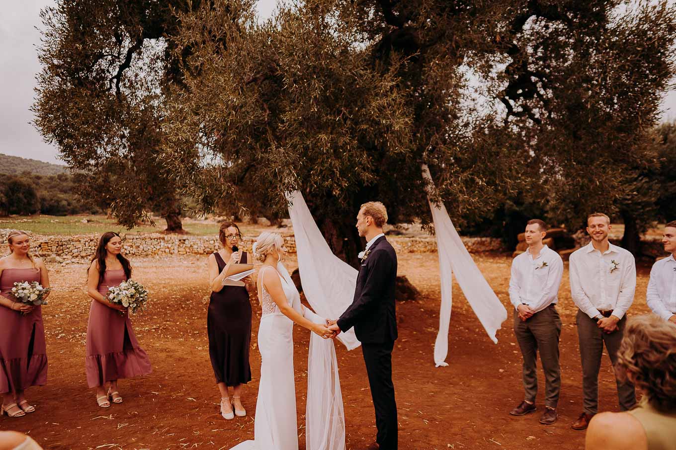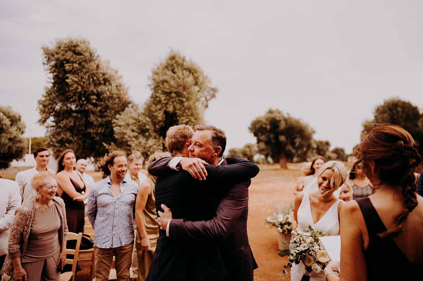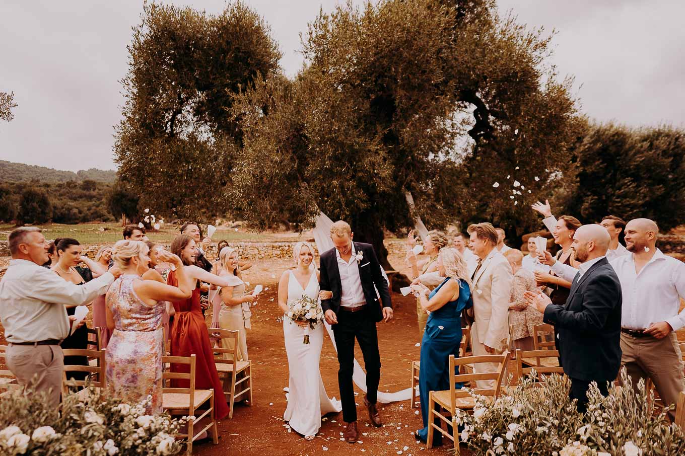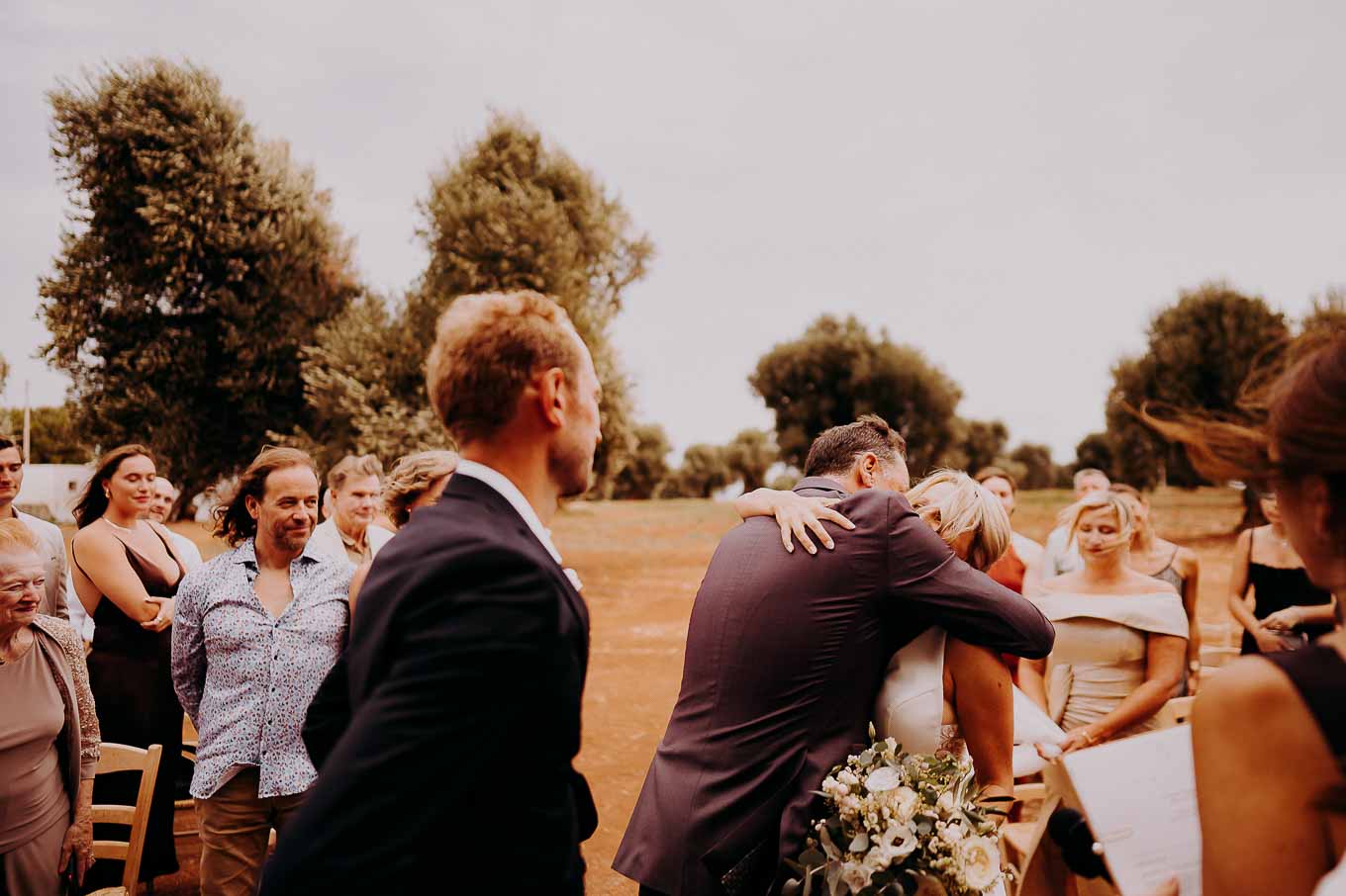 Il rito simbolico si è svolto all'esterno, tra gli ulivi secolari, con una luce calda che avvolgeva gli sposi e gli invitati. Taylor, accompagnata dal padre e preceduta dalle damigelle, ha percorso la navata tra gli alberi d'ulivo, creando un momento di grande emozione che ha commosso tutti i presenti.