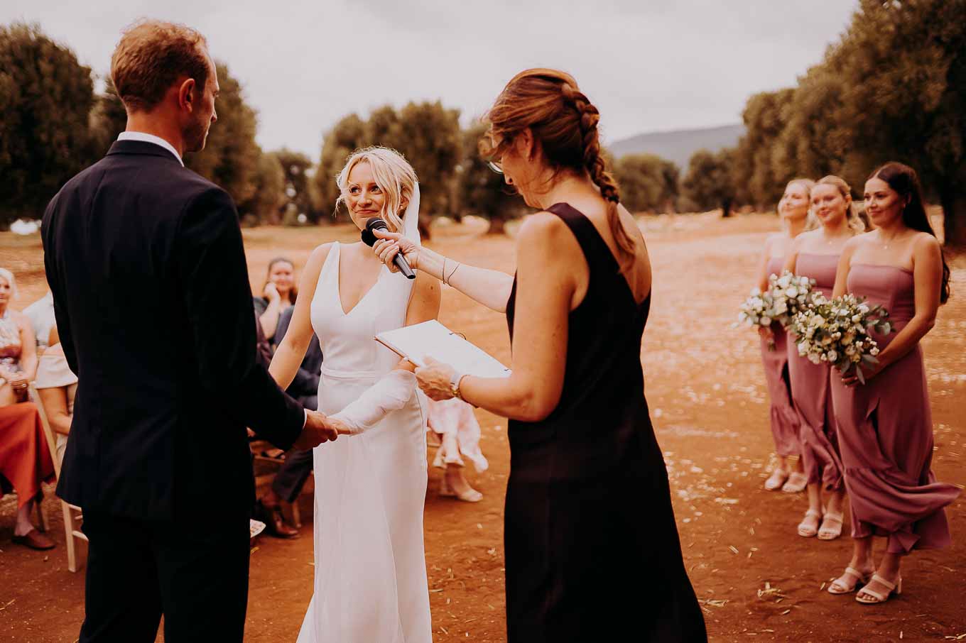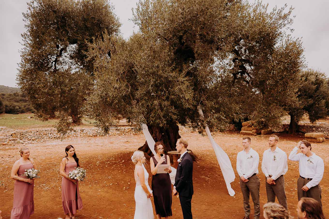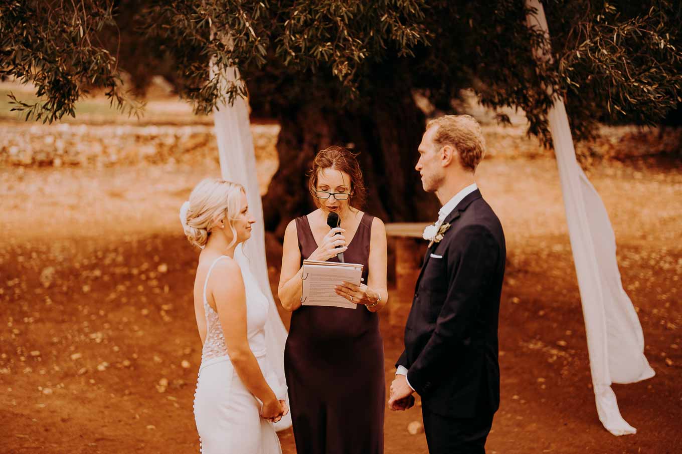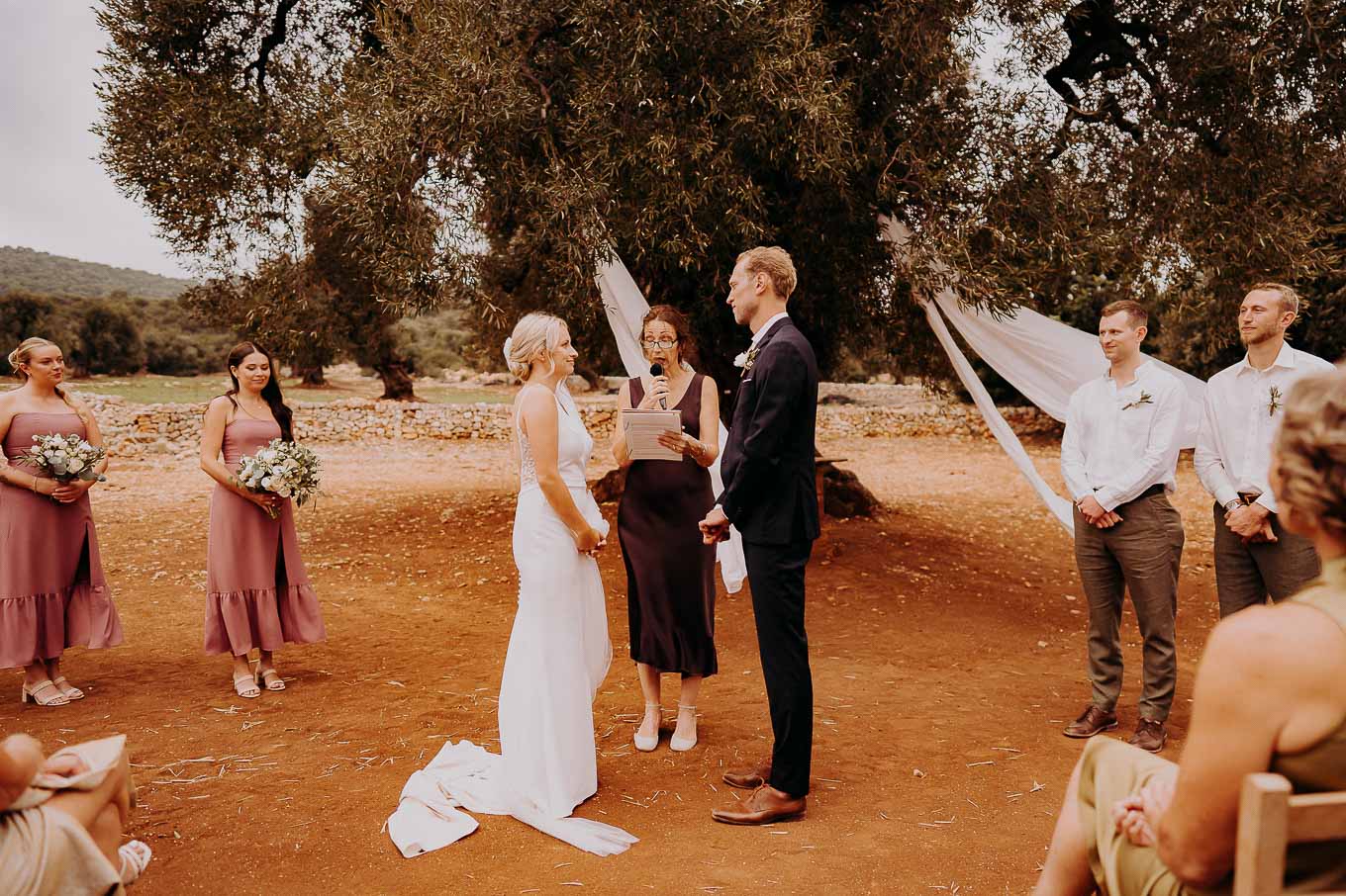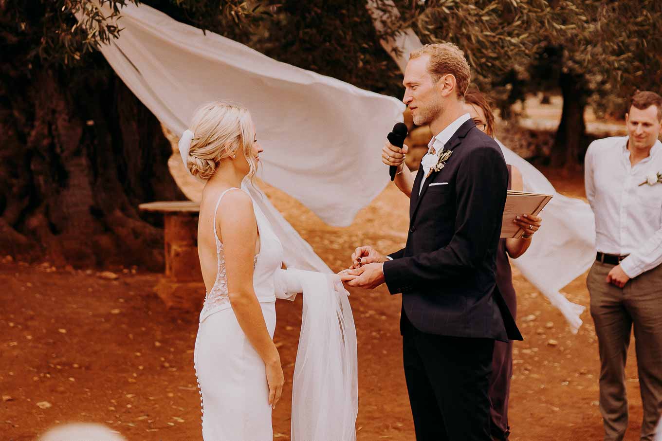 Il rito simbolico si è svolto all'esterno, tra gli ulivi secolari, con una luce calda che avvolgeva gli sposi e gli invitati. Taylor, accompagnata dal padre e preceduta dalle damigelle, ha percorso la navata tra gli alberi d'ulivo, creando un momento di grande emozione che ha commosso tutti i presenti.