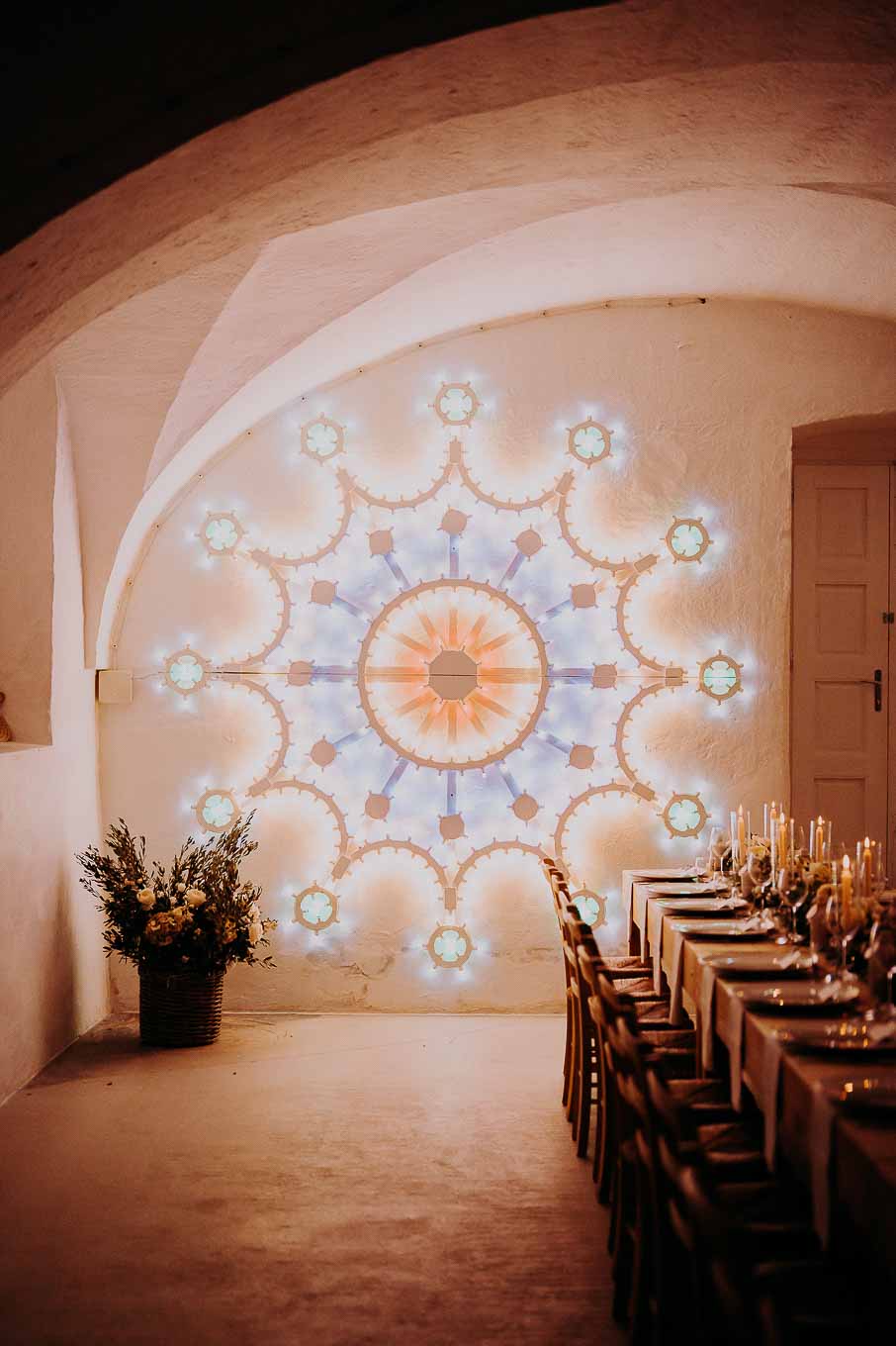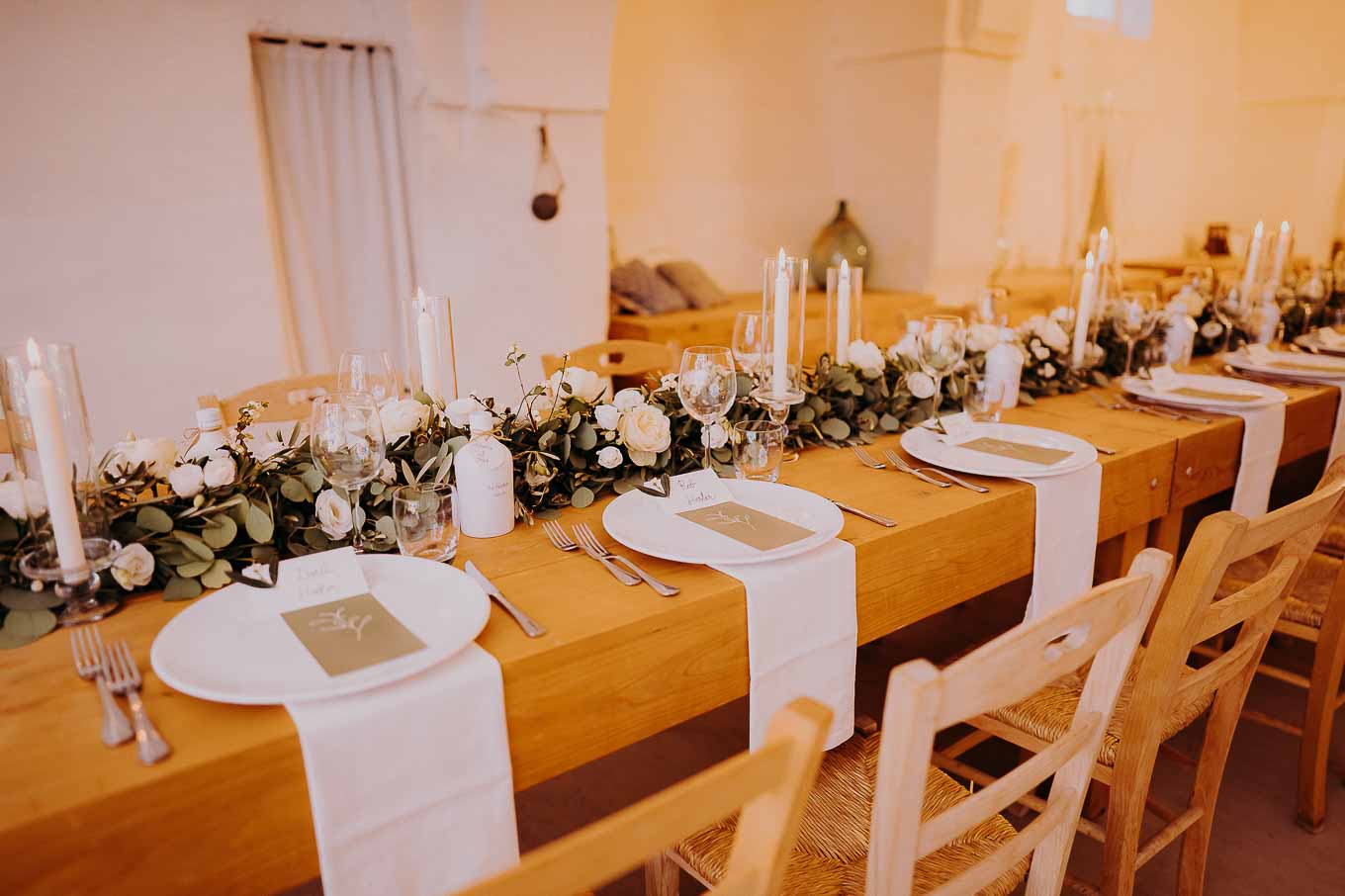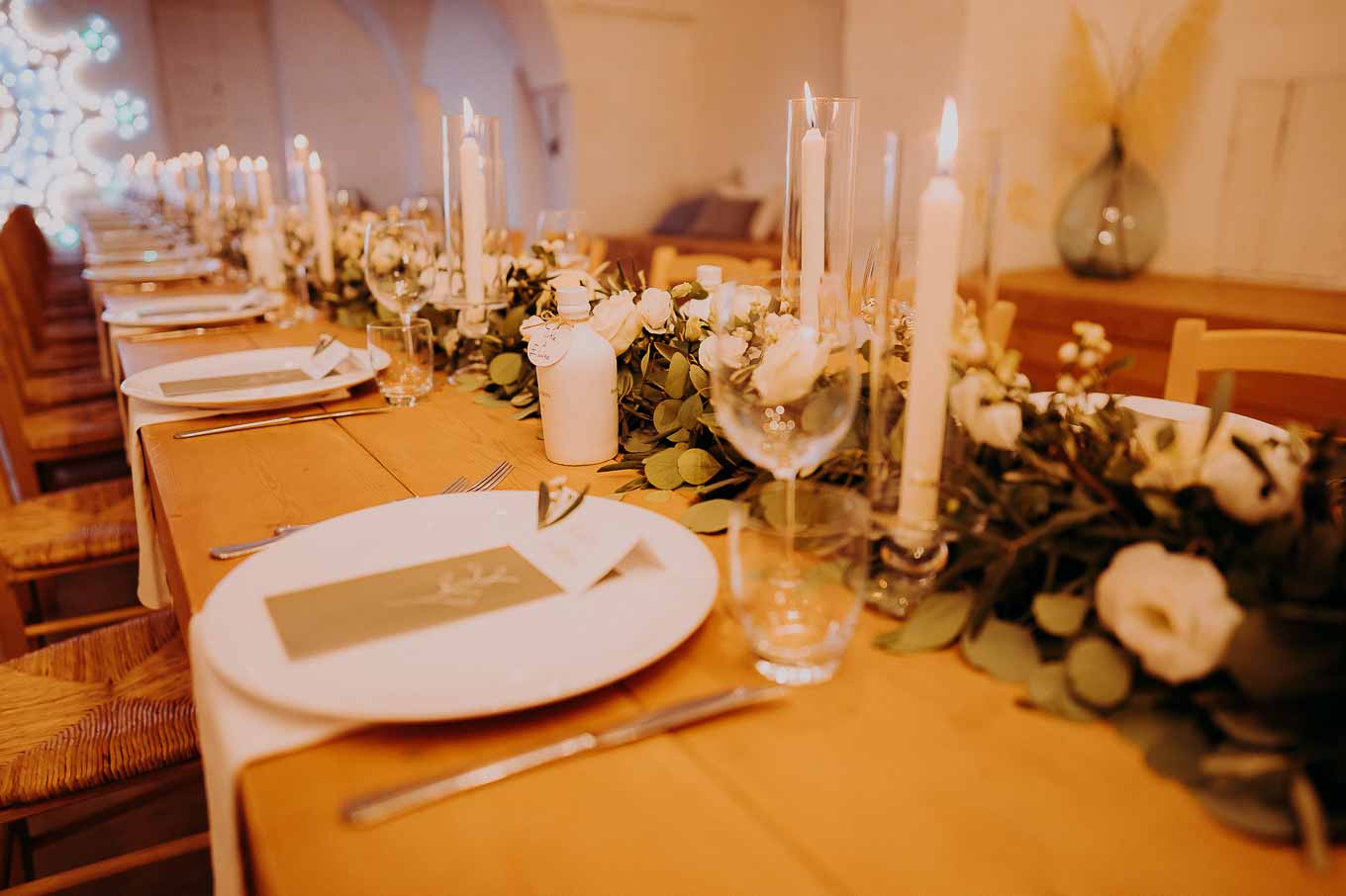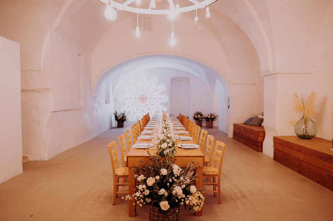 La cena si è svolta all'interno della masseria, in un ambiente avvolto da lucine e candele, creando un'atmosfera magica e romantica. I piatti tipici della cucina pugliese hanno deliziato gli ospiti, che hanno potuto gustare le specialità preparate con ingredienti freschi e locali.