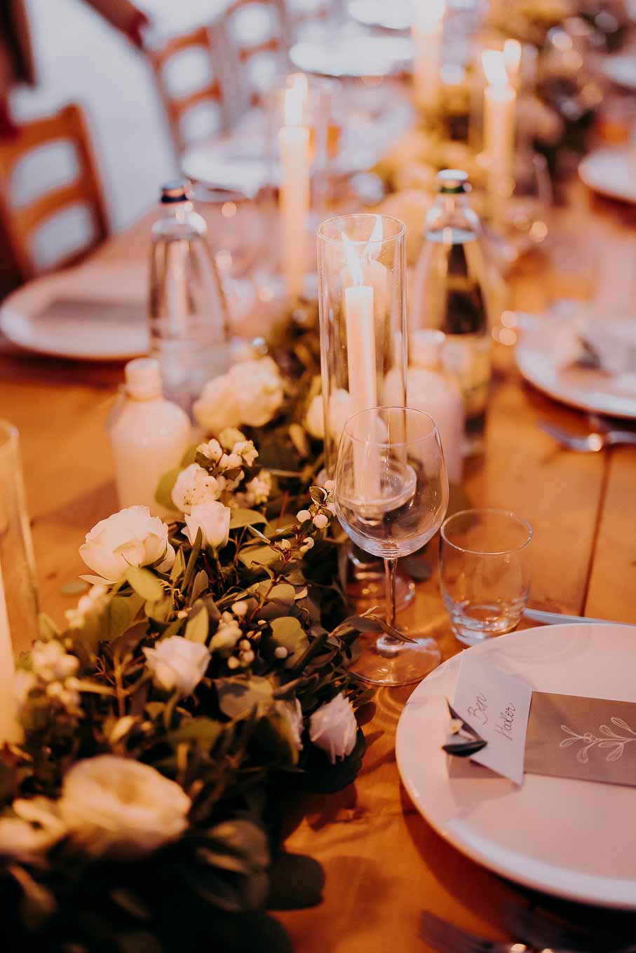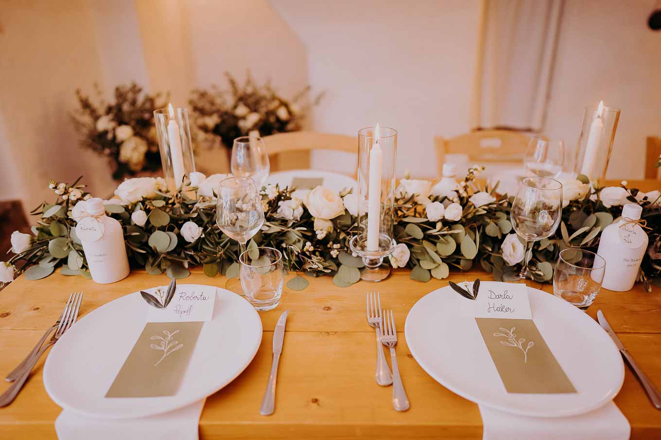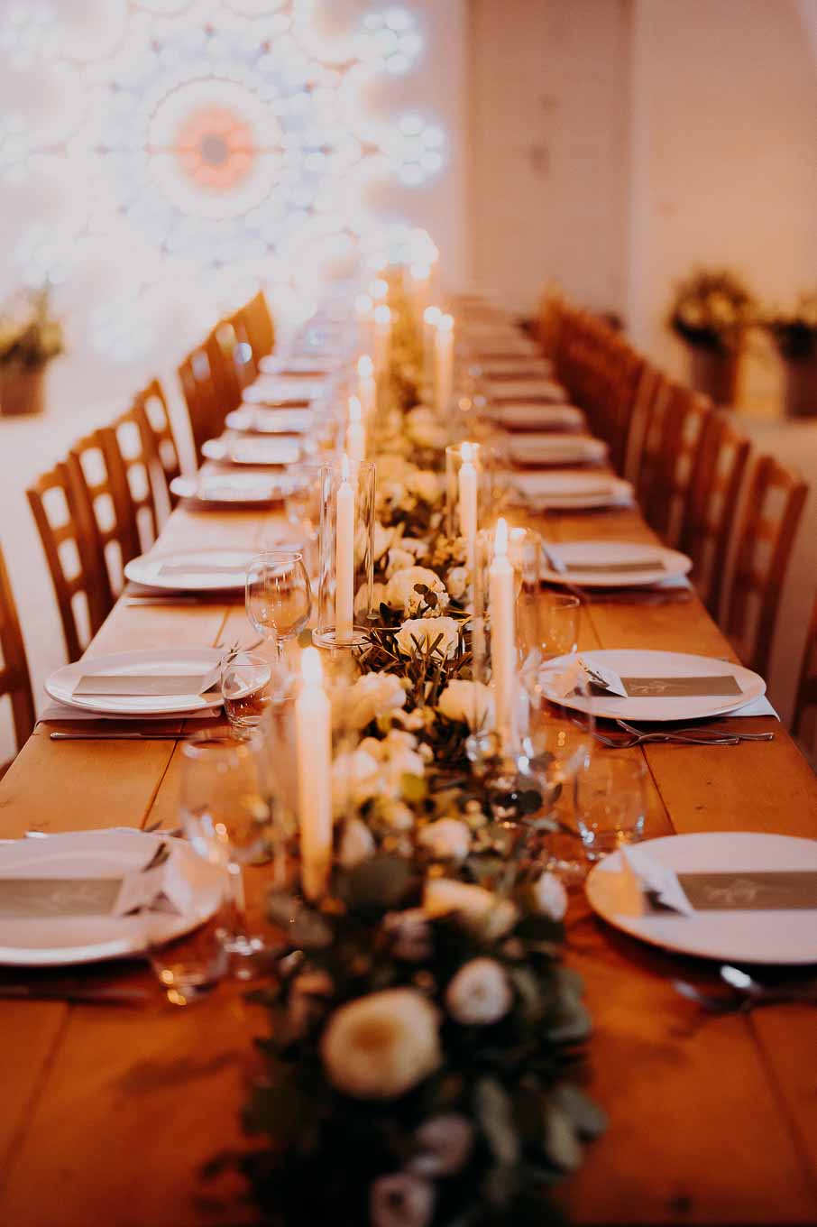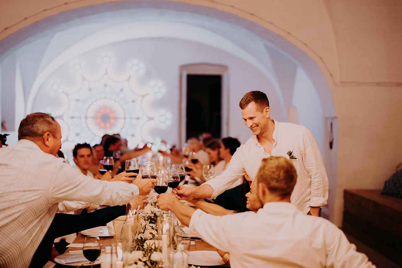 La cena si è svolta all'interno della masseria, in un ambiente avvolto da lucine e candele, creando un'atmosfera magica e romantica. I piatti tipici della cucina pugliese hanno deliziato gli ospiti, che hanno potuto gustare le specialità preparate con ingredienti freschi e locali.