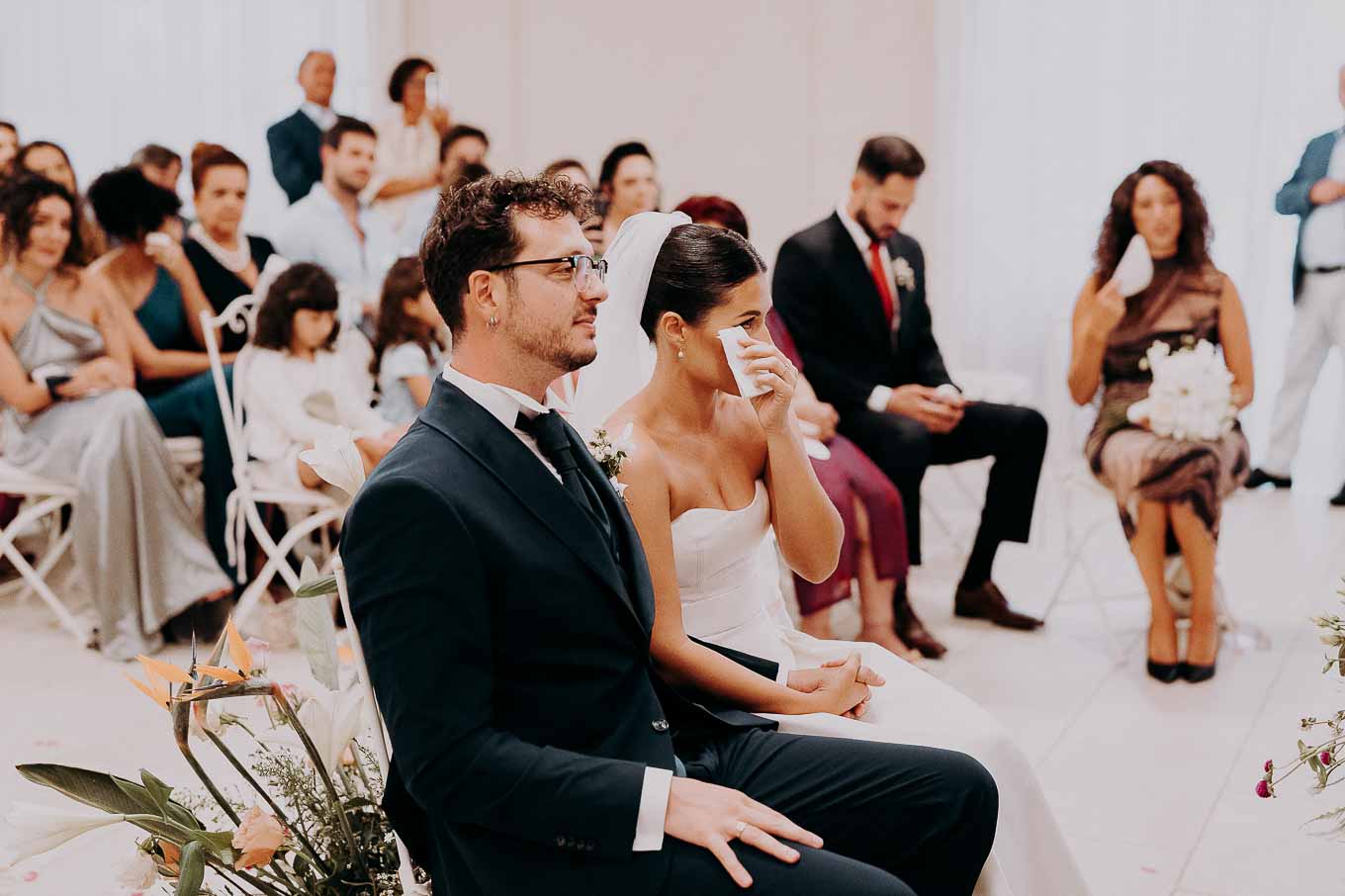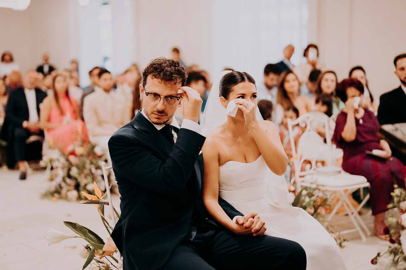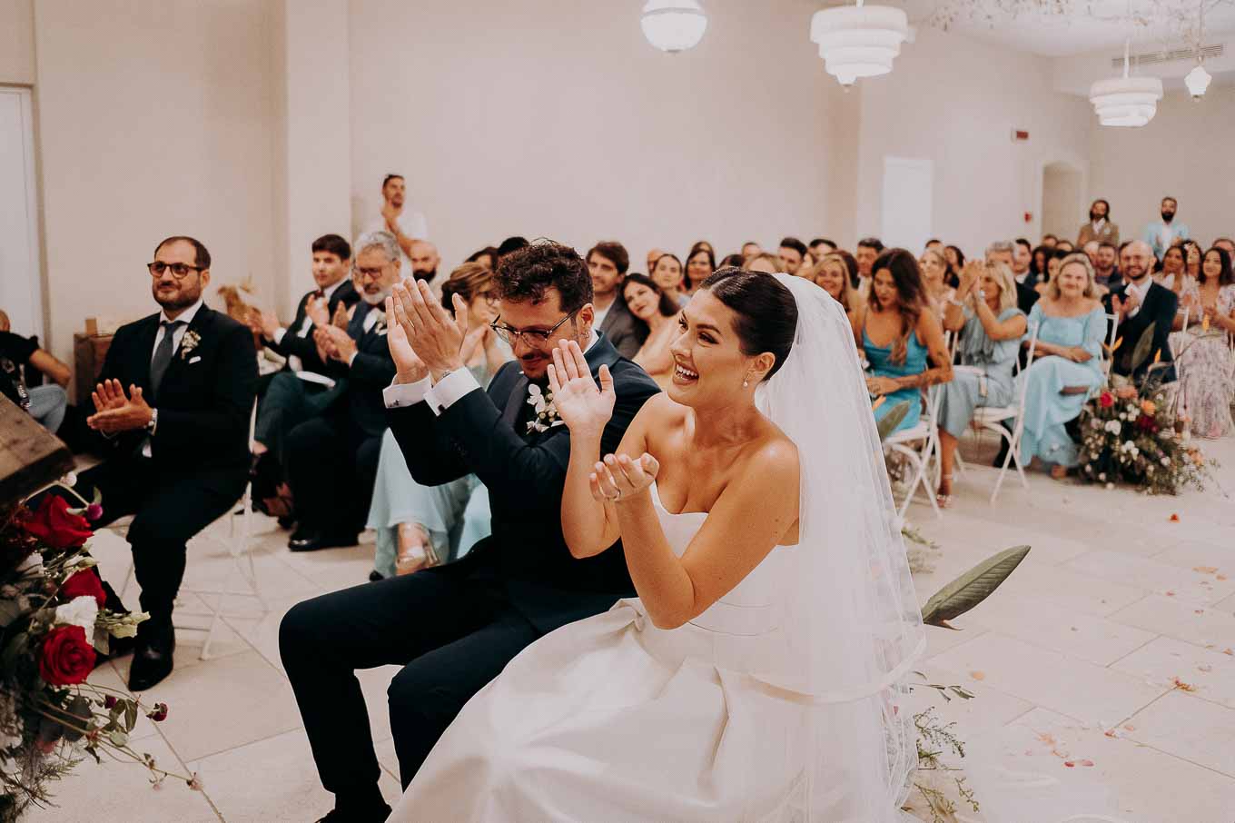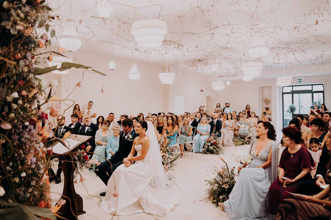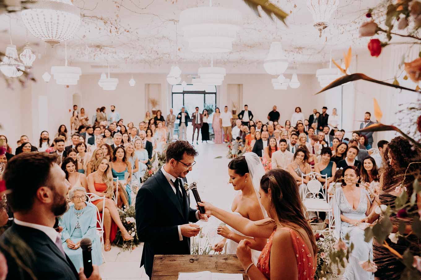 A causa del rischio di pioggia, il rito civile si è svolto all’interno della tenuta. Un dettaglio che, lontano dal rovinare l’atmosfera, ha contribuito a creare un ambiente raccolto, intimo e carico di emozione. Ogni sguardo, ogni parola, ogni gesto è stato amplificato dalla bellezza semplice e sincera di quel momento.