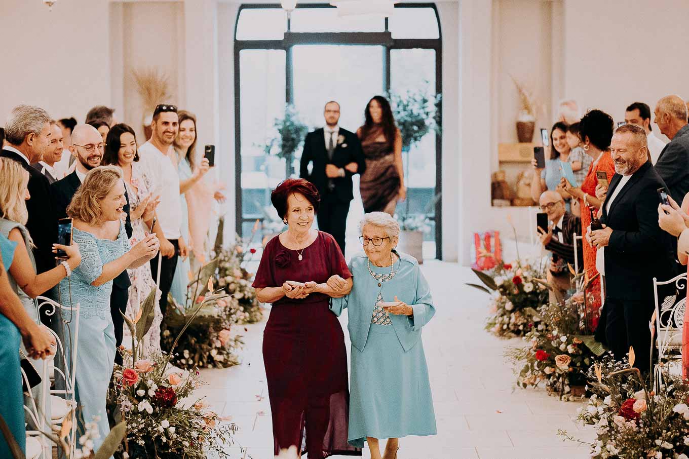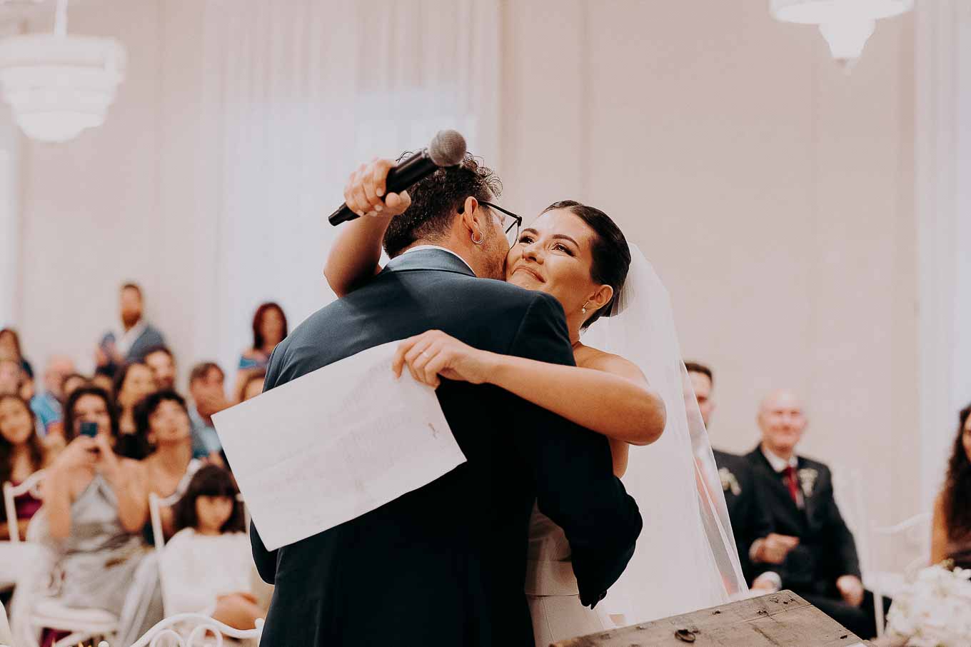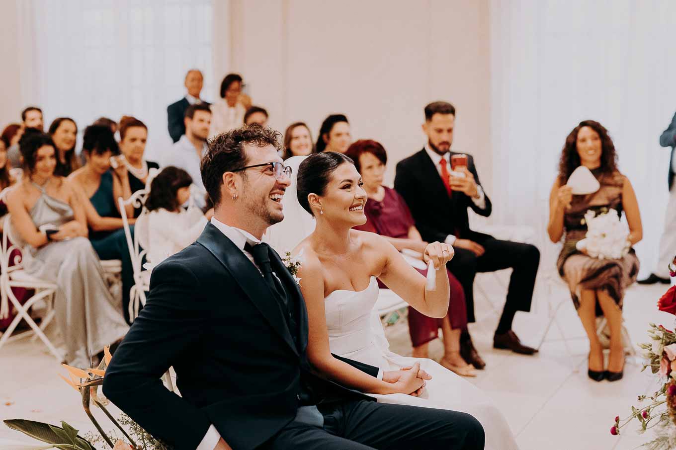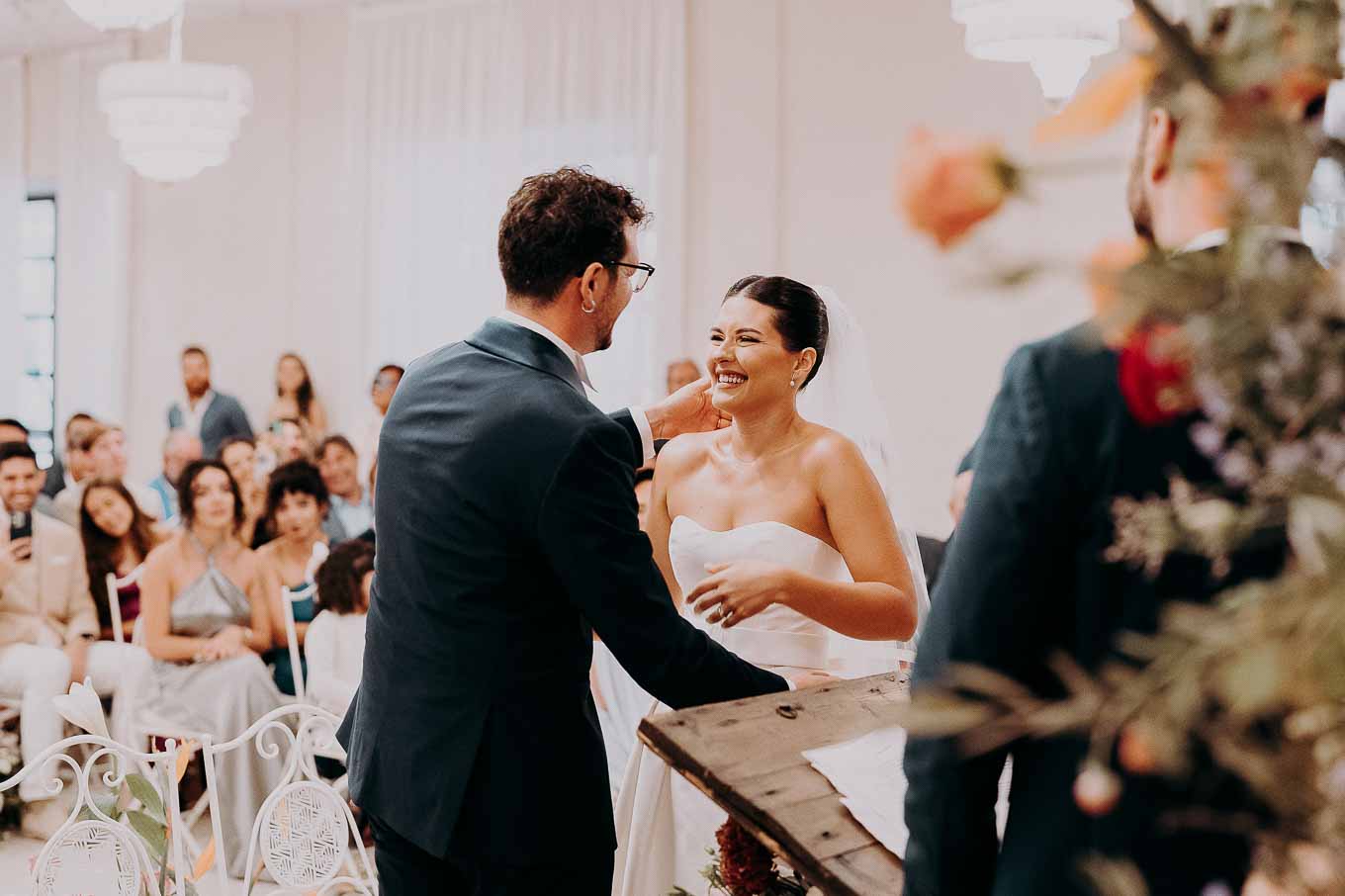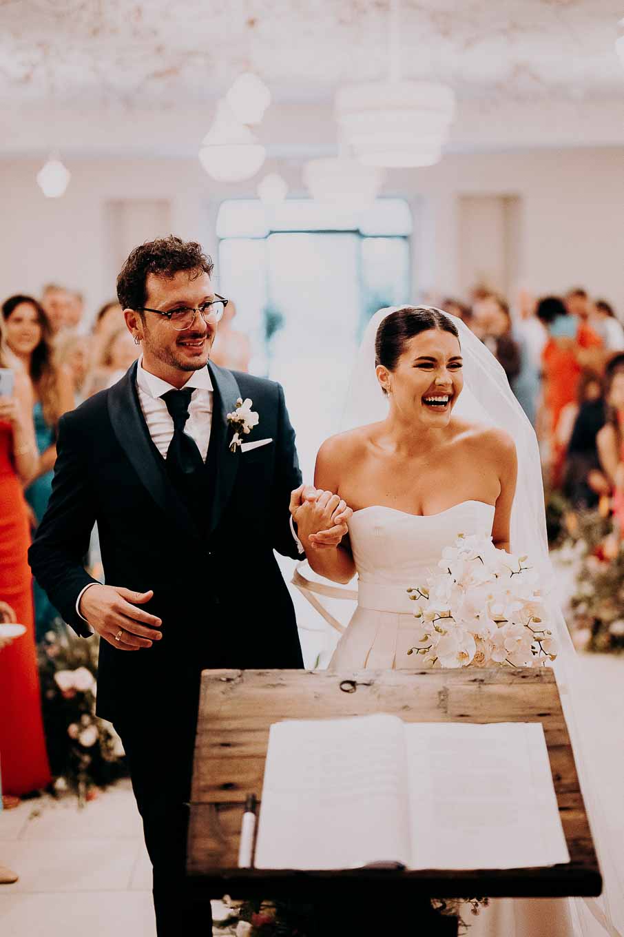 A causa del rischio di pioggia, il rito civile si è svolto all’interno della tenuta. Un dettaglio che, lontano dal rovinare l’atmosfera, ha contribuito a creare un ambiente raccolto, intimo e carico di emozione. Ogni sguardo, ogni parola, ogni gesto è stato amplificato dalla bellezza semplice e sincera di quel momento.