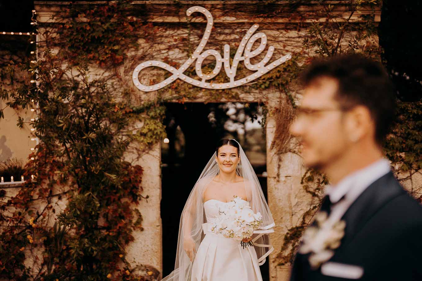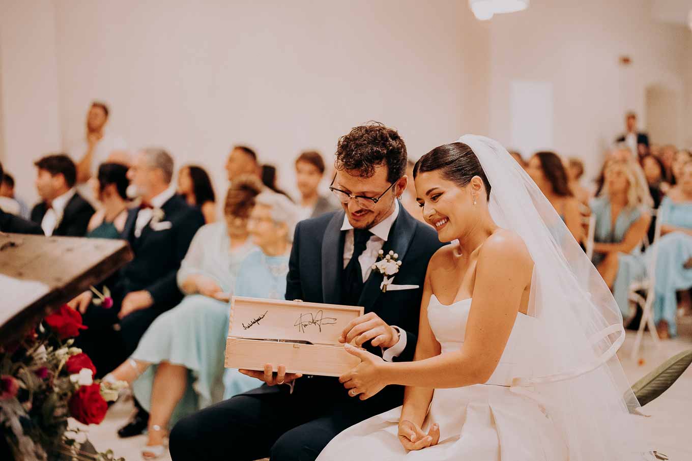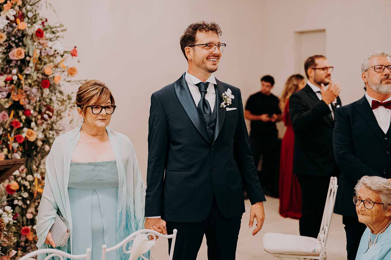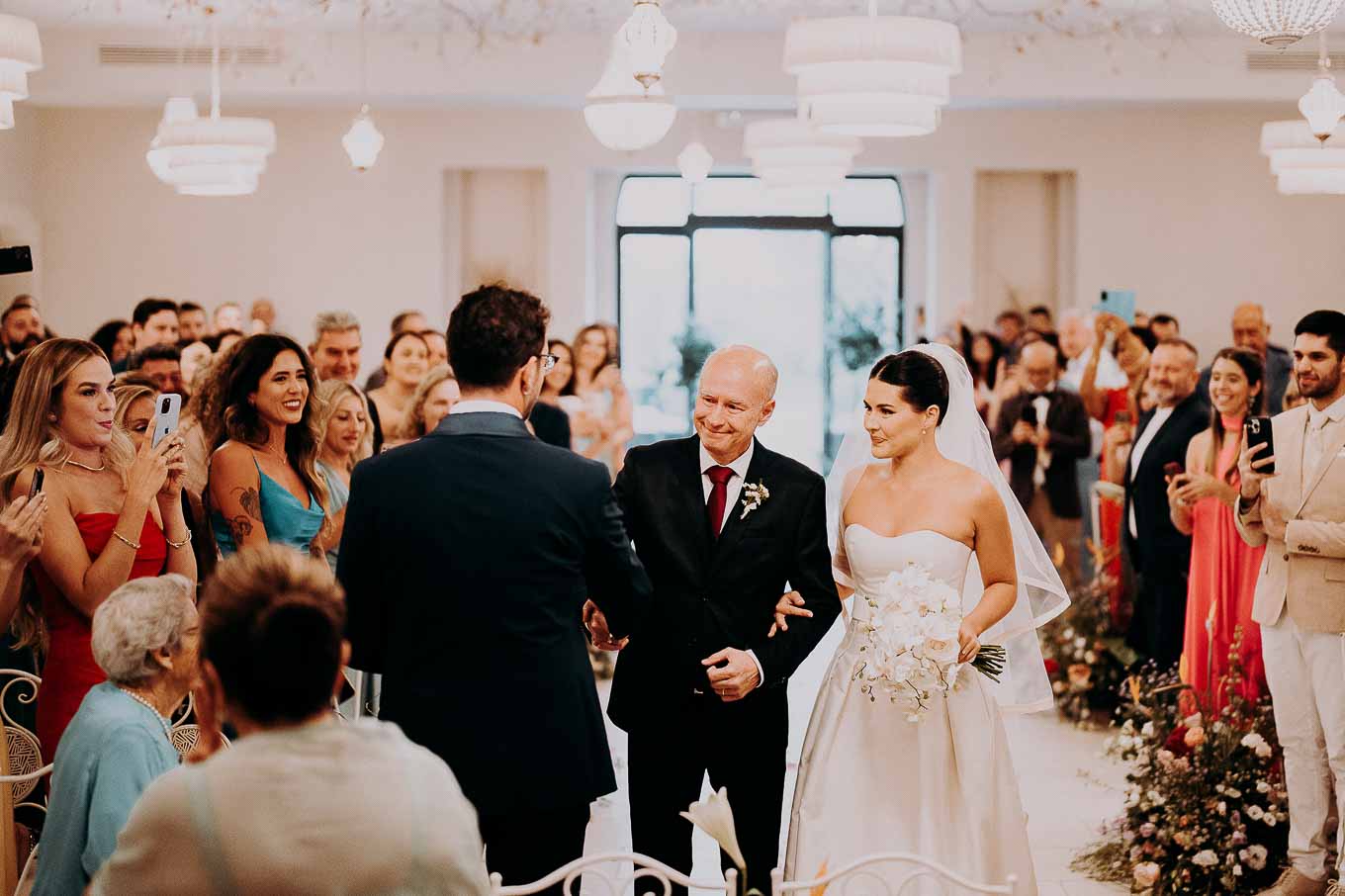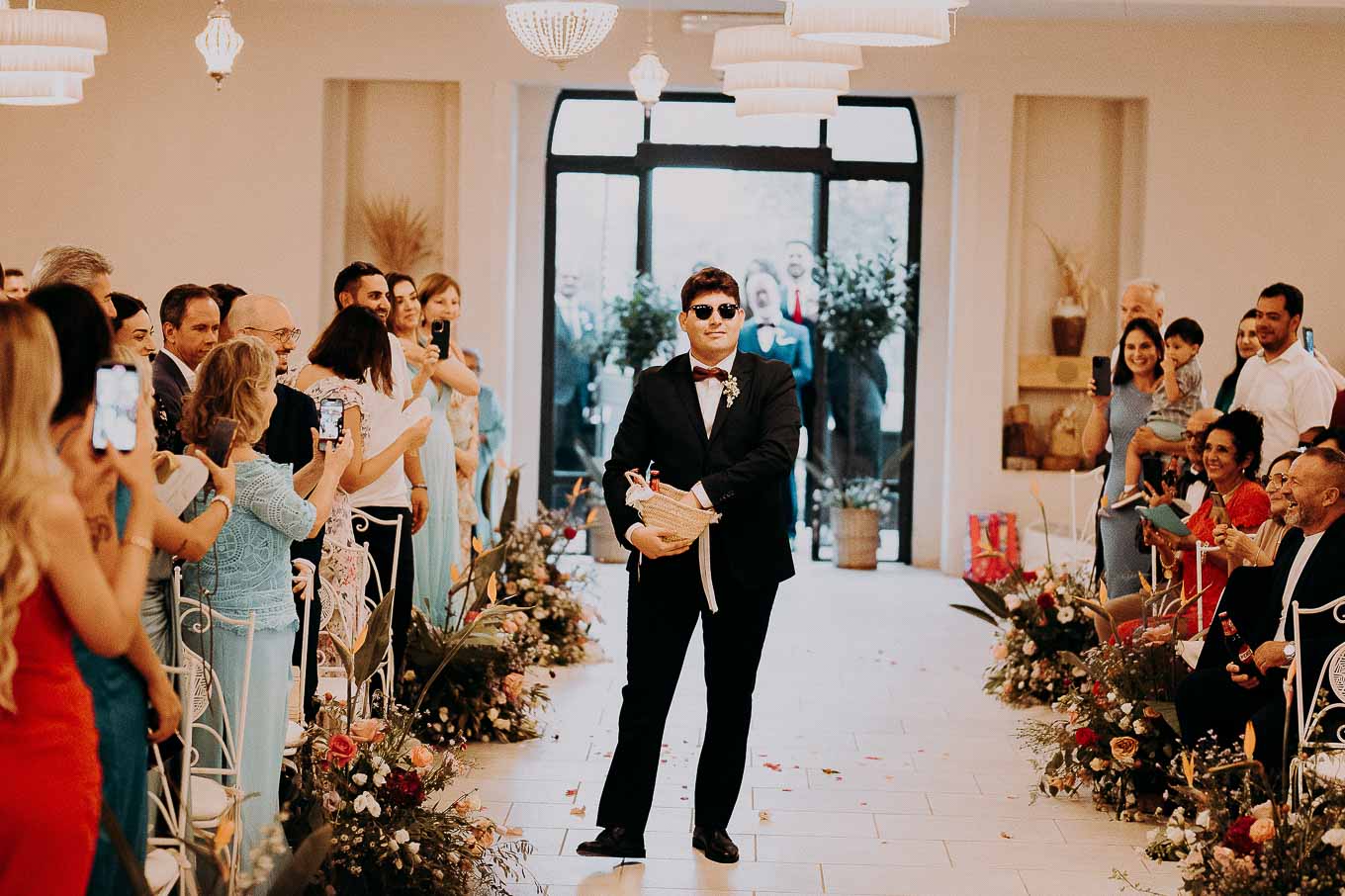A causa del rischio di pioggia, il rito civile si è svolto all’interno della tenuta. Un dettaglio che, lontano dal rovinare l’atmosfera, ha contribuito a creare un ambiente raccolto, intimo e carico di emozione. Ogni sguardo, ogni parola, ogni gesto è stato amplificato dalla bellezza semplice e sincera di quel momento.