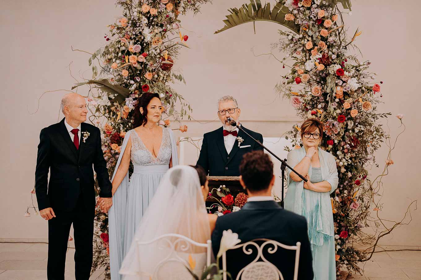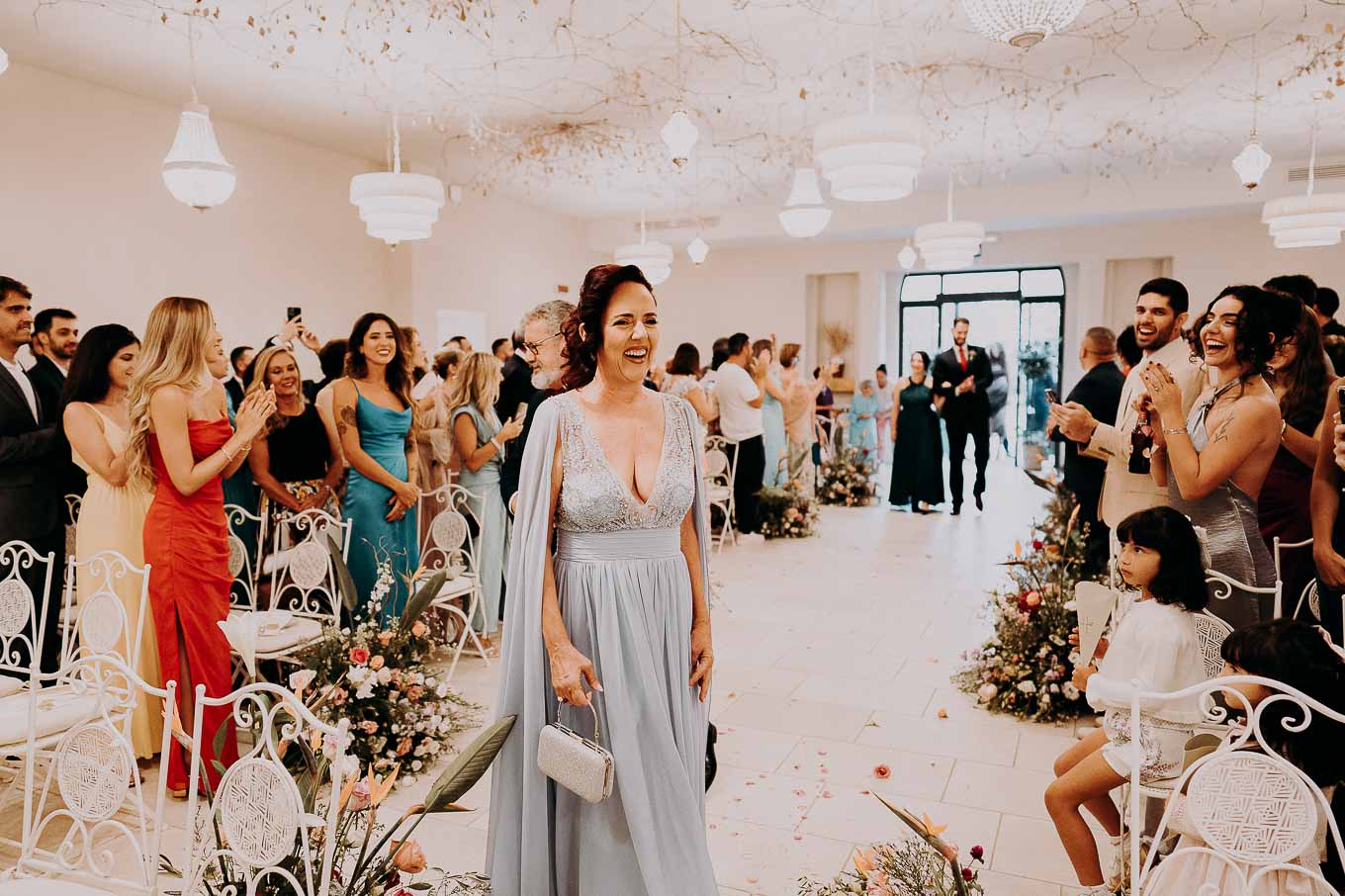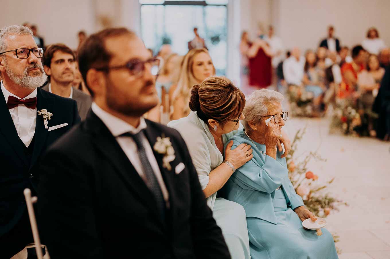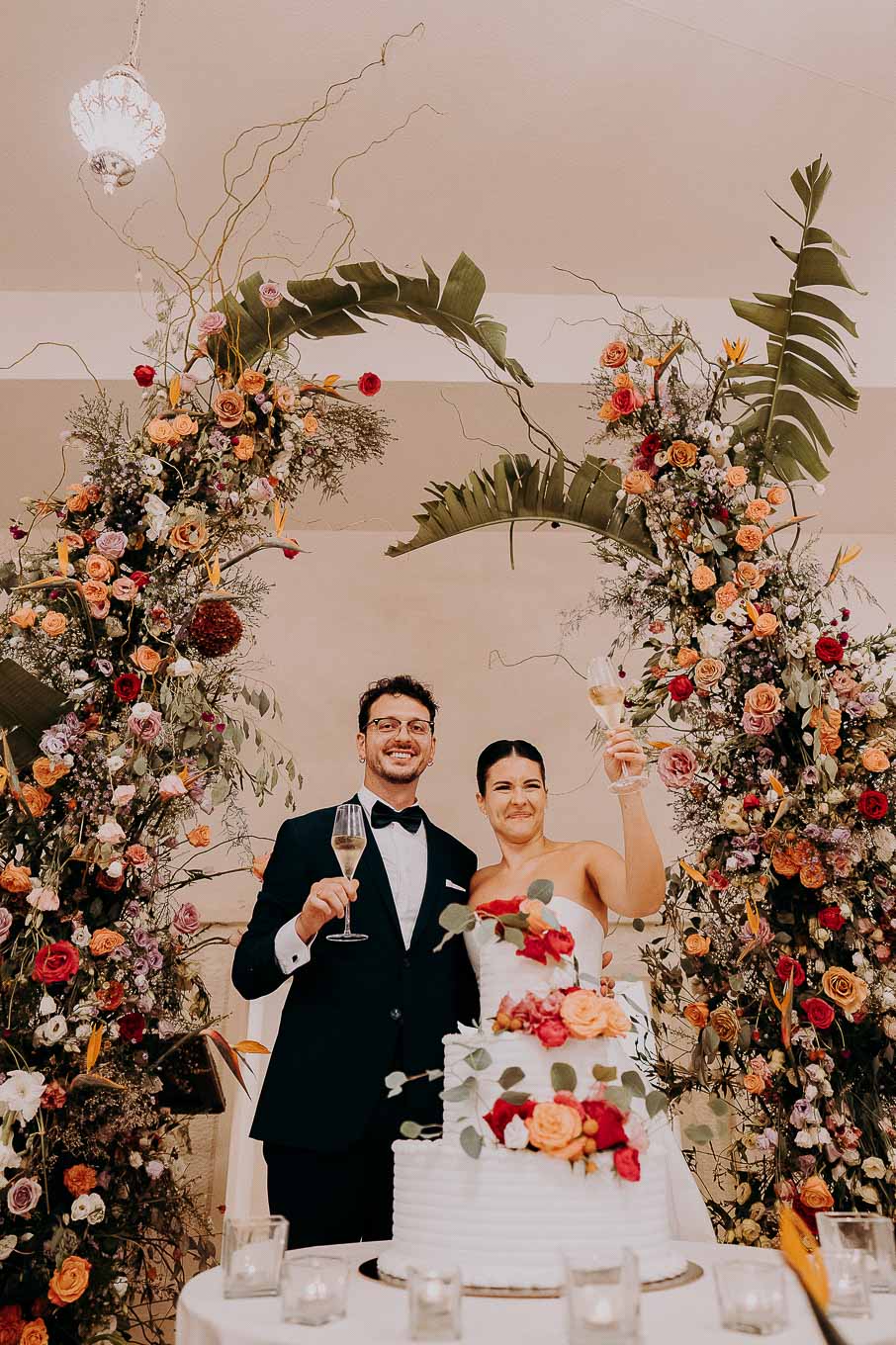 A causa del rischio di pioggia, il rito civile si è svolto all’interno della tenuta. Un dettaglio che, lontano dal rovinare l’atmosfera, ha contribuito a creare un ambiente raccolto, intimo e carico di emozione. Ogni sguardo, ogni parola, ogni gesto è stato amplificato dalla bellezza semplice e sincera di quel momento.