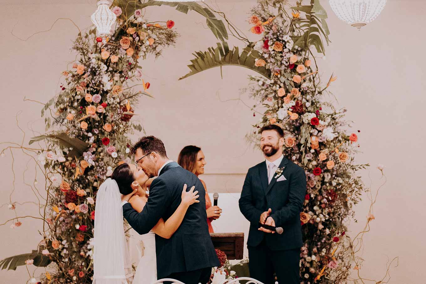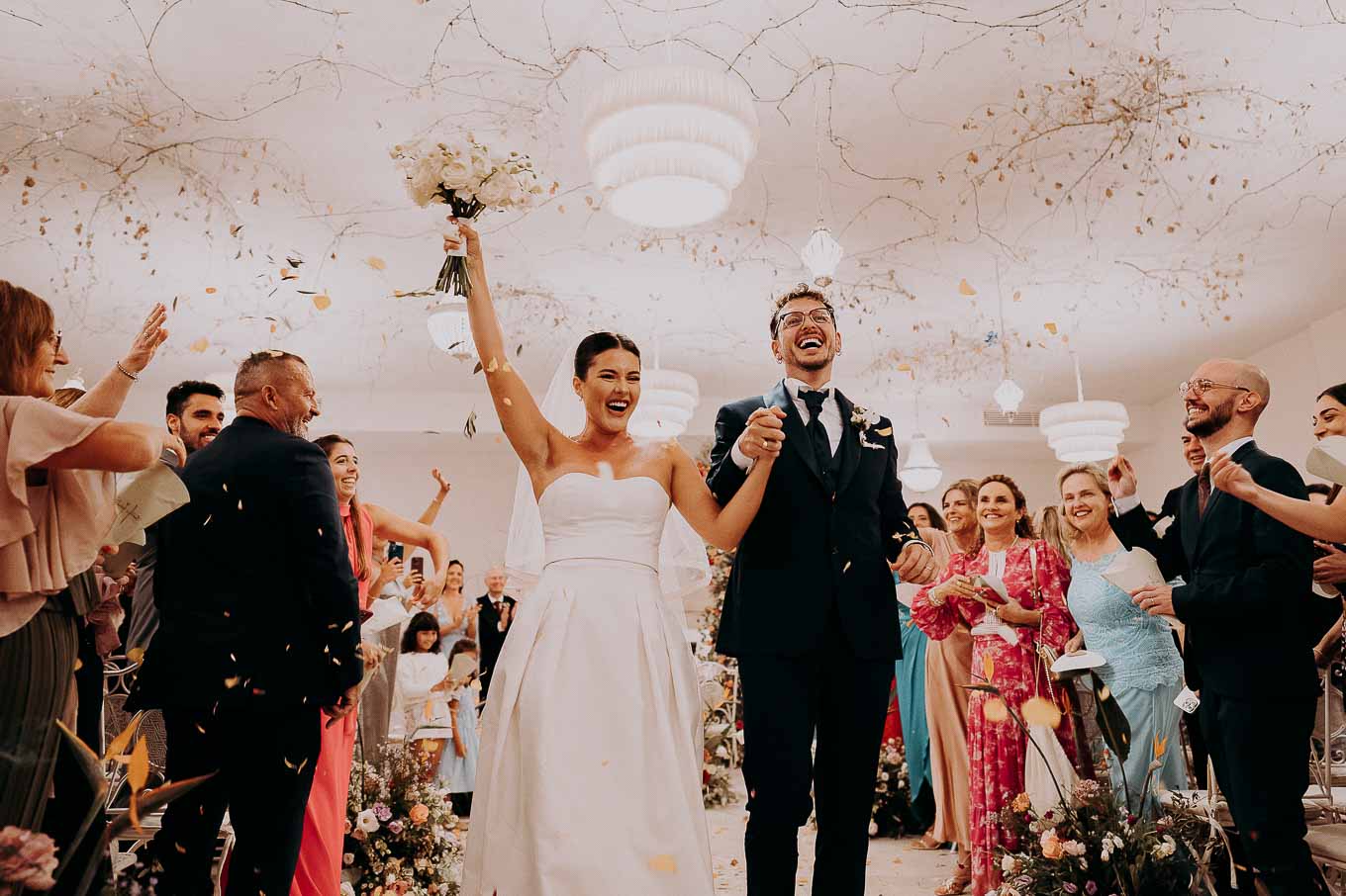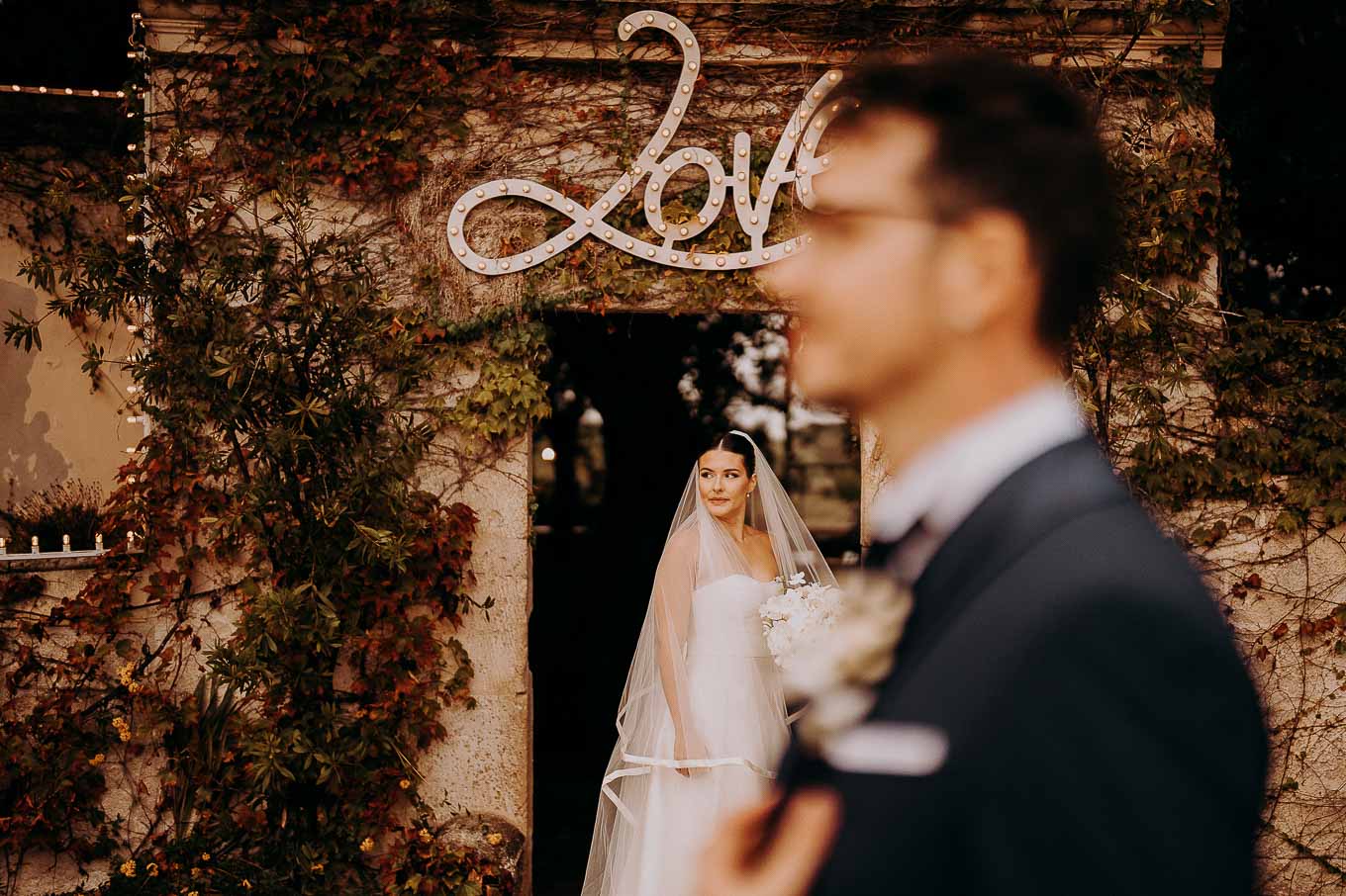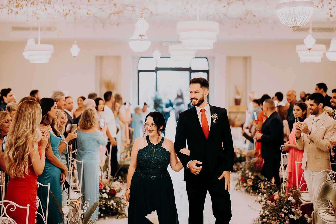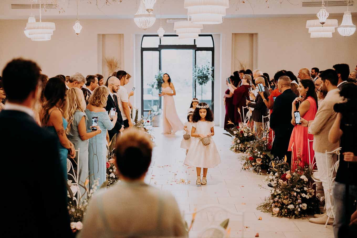 A causa del rischio di pioggia, il rito civile si è svolto all’interno della tenuta. Un dettaglio che, lontano dal rovinare l’atmosfera, ha contribuito a creare un ambiente raccolto, intimo e carico di emozione. Ogni sguardo, ogni parola, ogni gesto è stato amplificato dalla bellezza semplice e sincera di quel momento.
