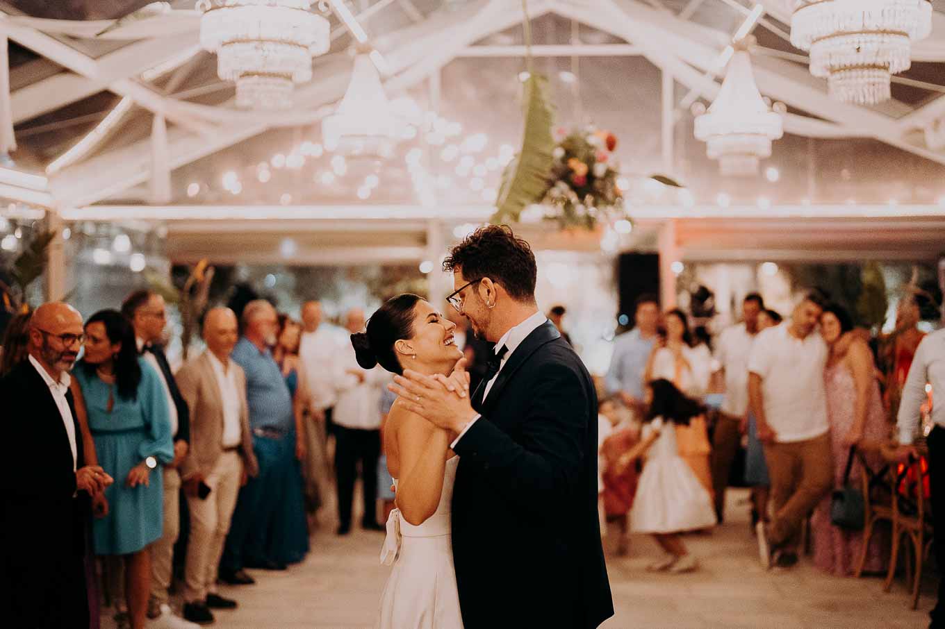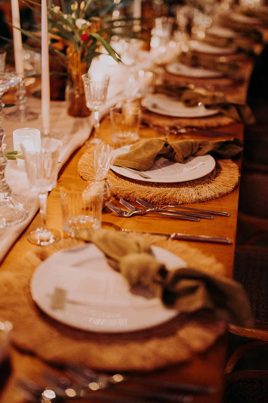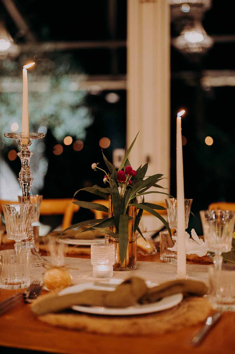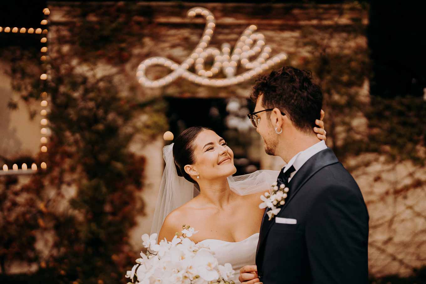 La cena si è tenuta anch’essa all’interno, in uno spazio sapientemente trasformato in un ambiente raffinato e intimo grazie al lavoro impeccabile della loro wedding planner. Candele accese ovunque, fili di lucine sospese e dettagli curati con amore hanno reso l’atmosfera magica. Durante la cena, amici e parenti hanno condiviso discorsi carichi di emozione e ricordi, rendendo ogni brindisi ancora più sentito.