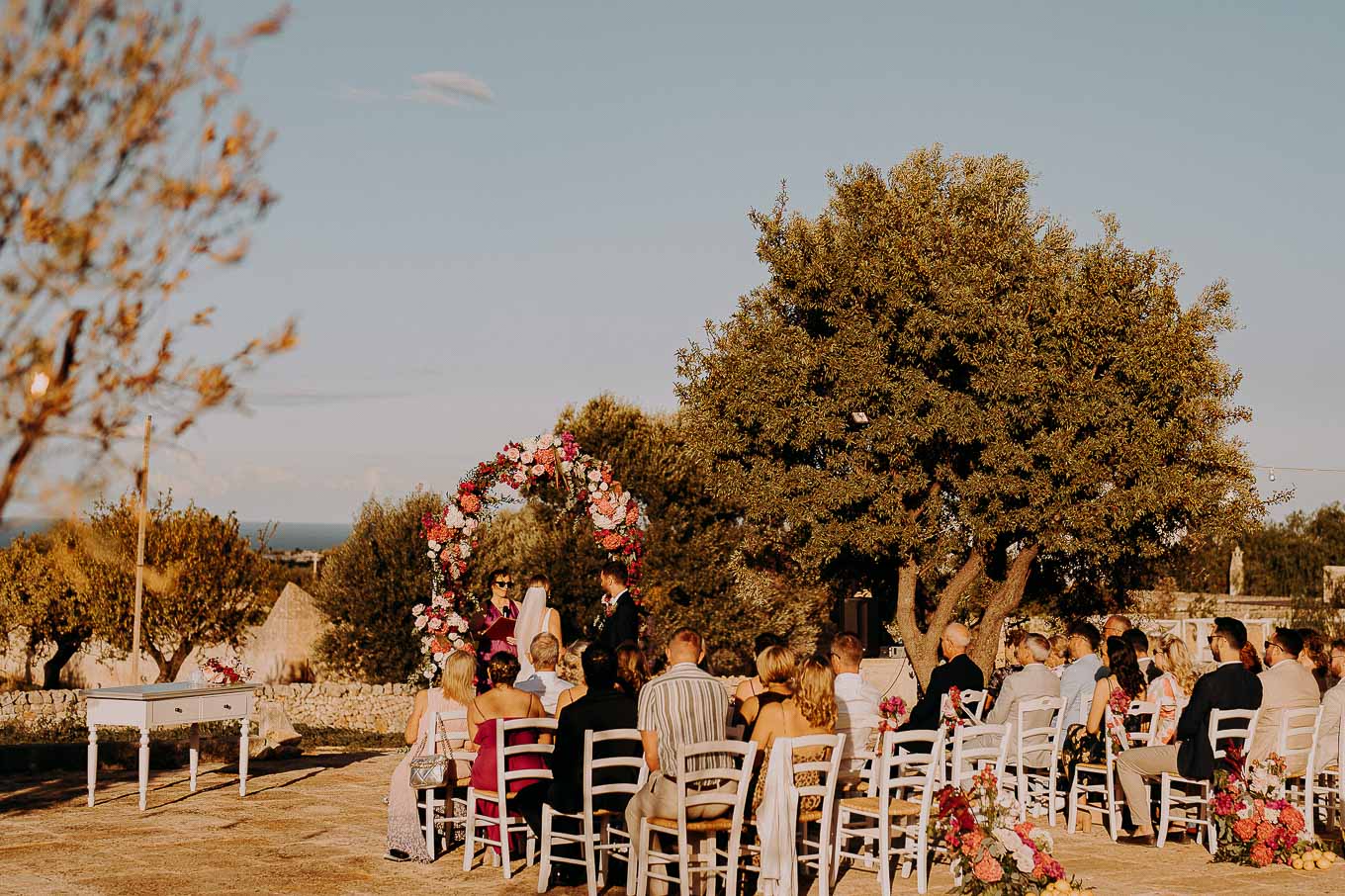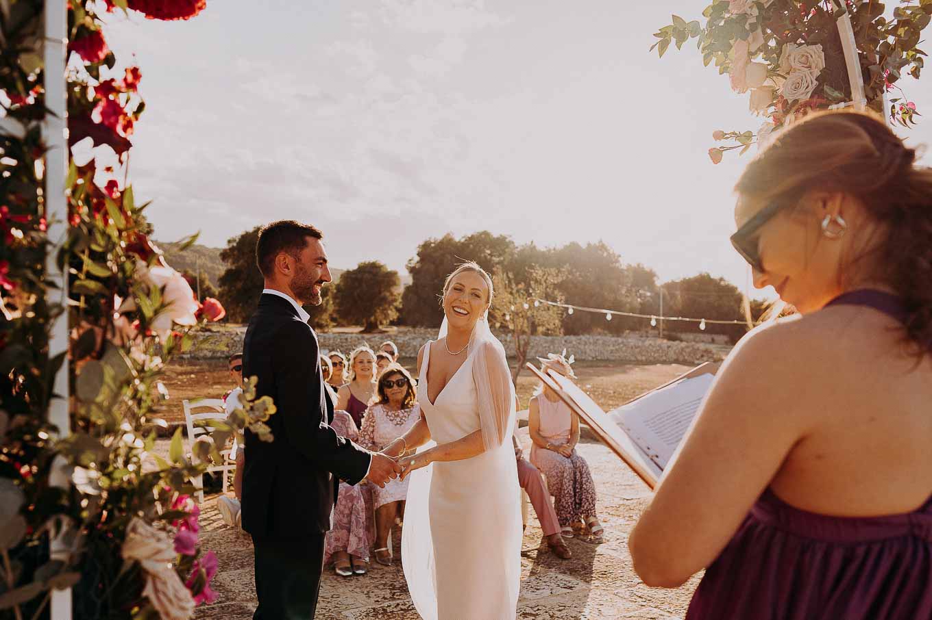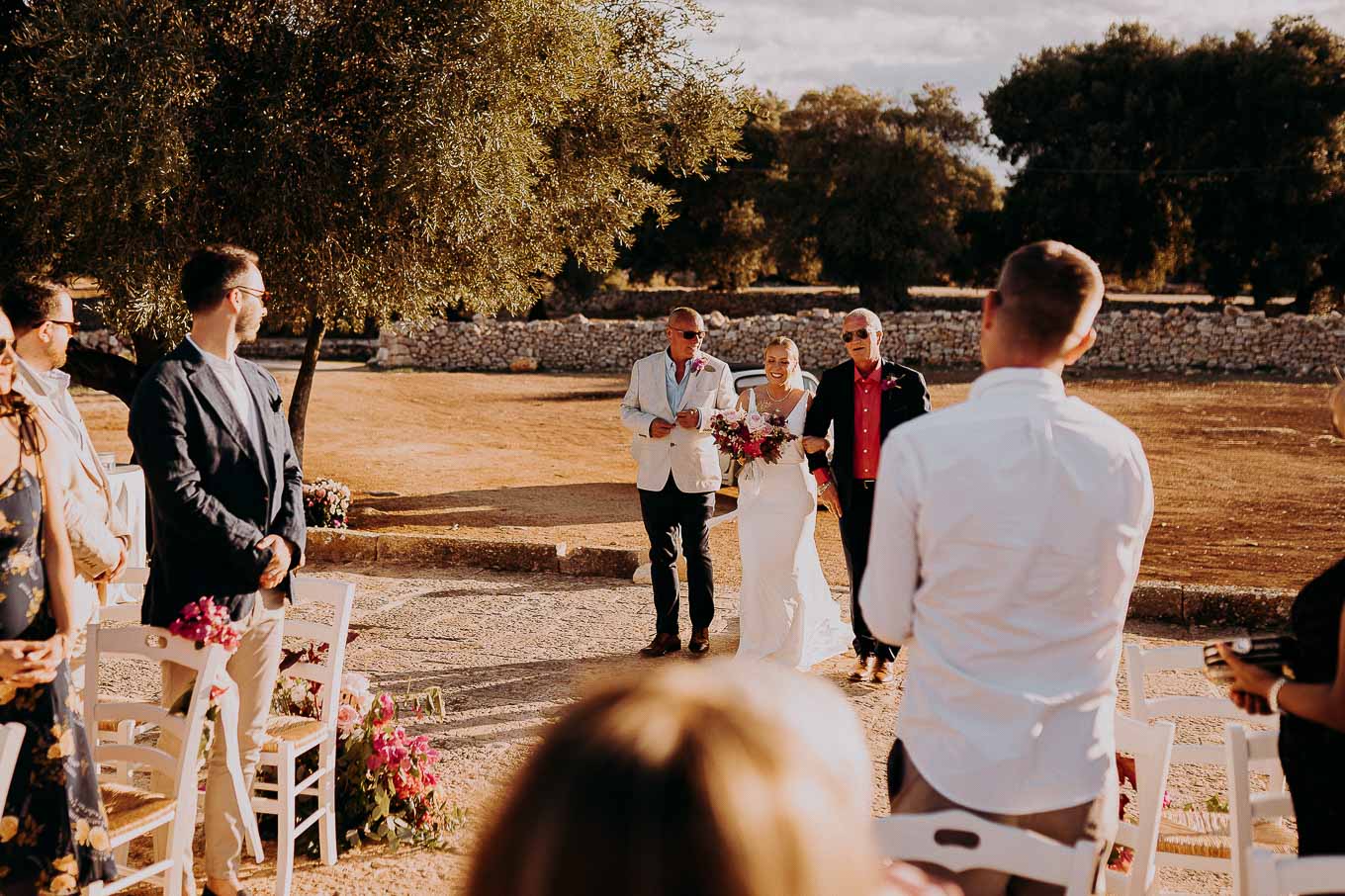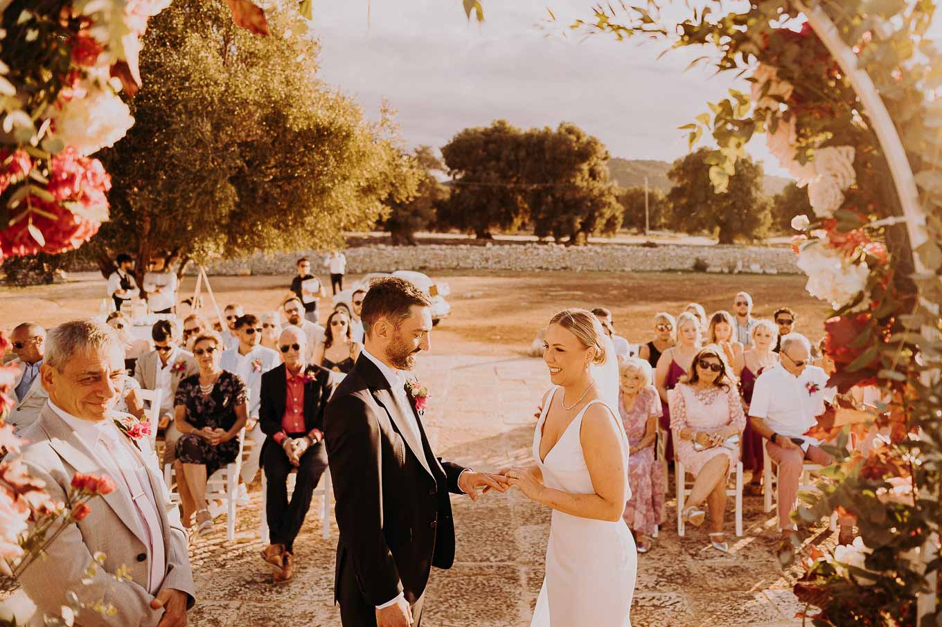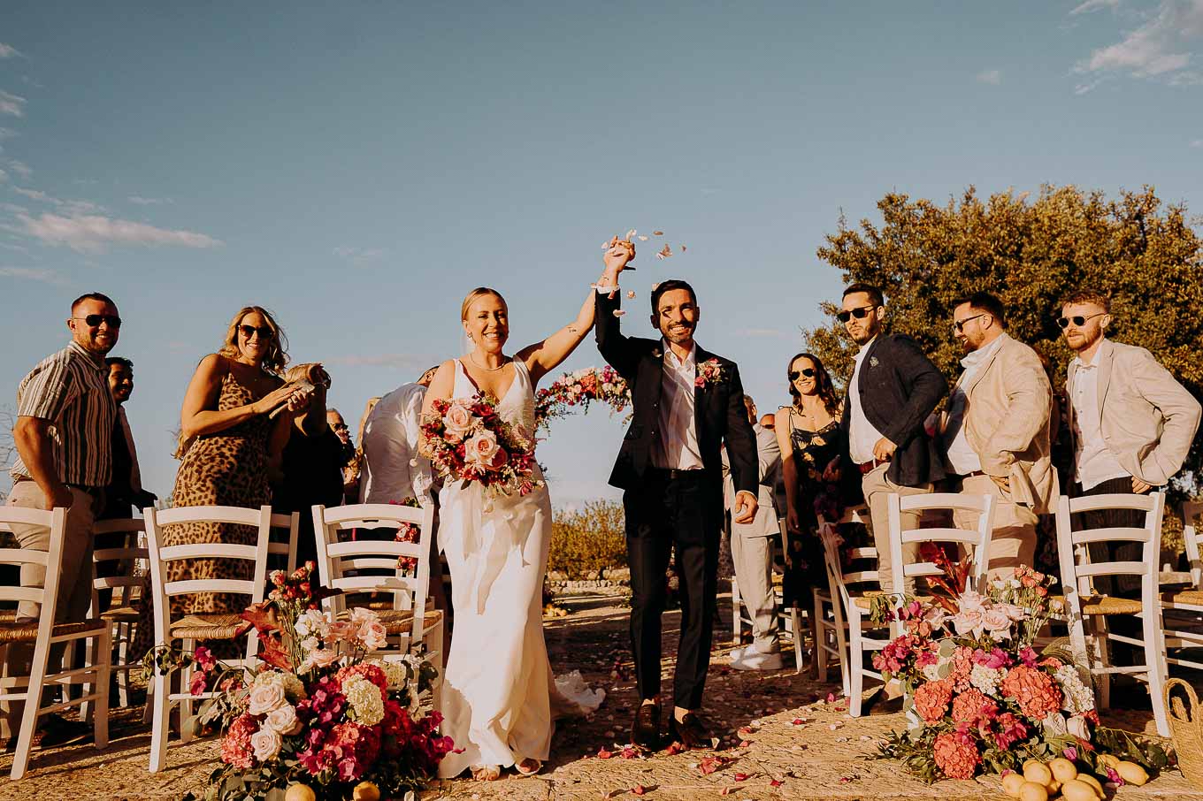 Il rito civile si è svolto all’esterno, a ridosso del tramonto, in uno dei punti più suggestivi della Masseria. Circondati da ulivi monumentali e da una luce dorata che solo la Puglia sa regalare, Aston e Lucy si sono promessi amore eterno in un’atmosfera intima, avvolgente e profondamente autentica. L’emozione era palpabile: la natura, il silenzio rotto solo dalle parole pronunciate e il calore degli affetti più cari hanno creato un momento di rara bellezza.