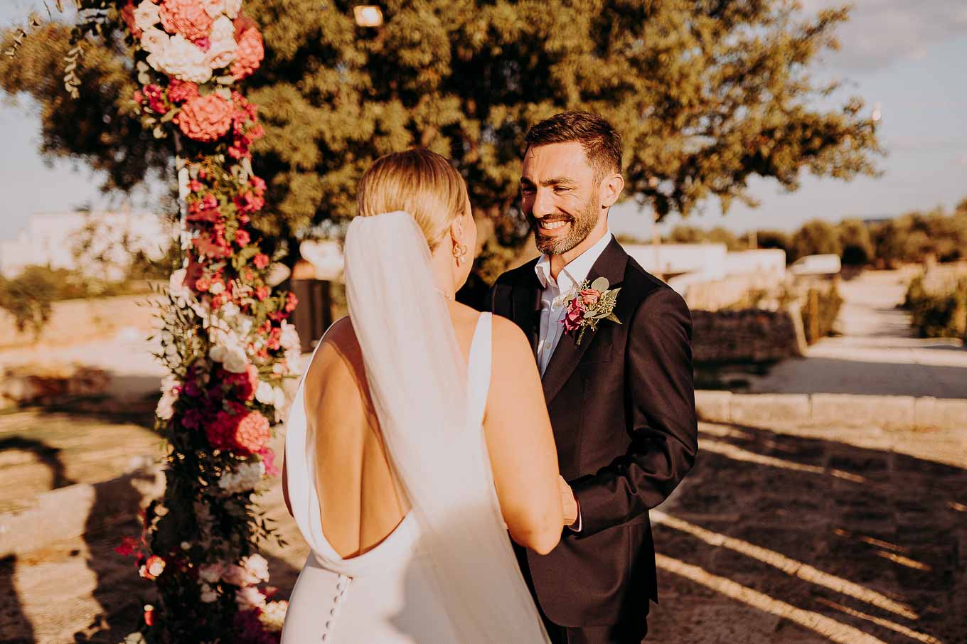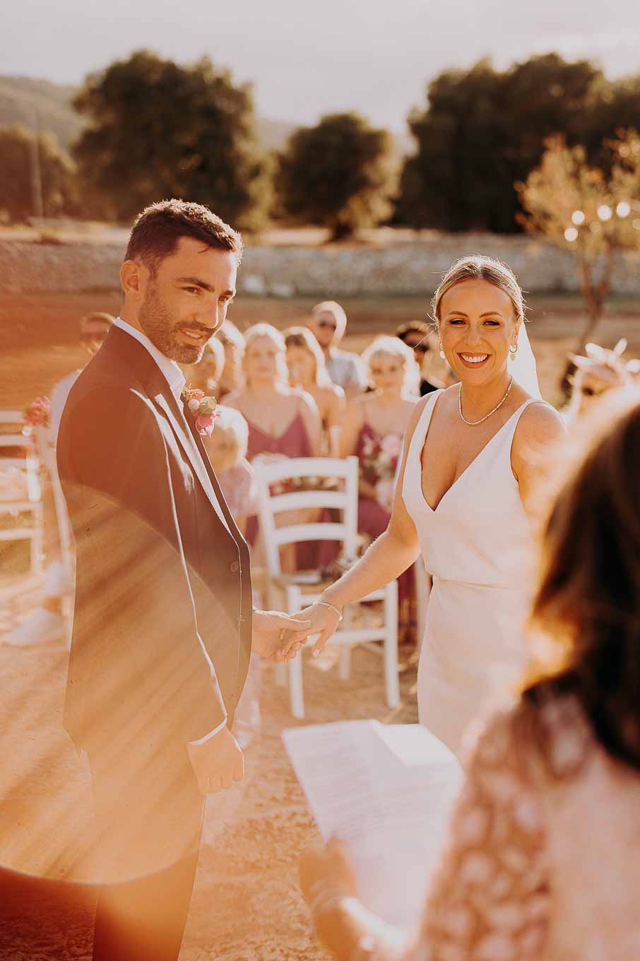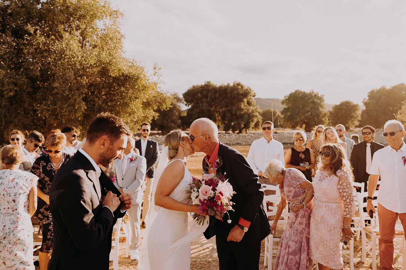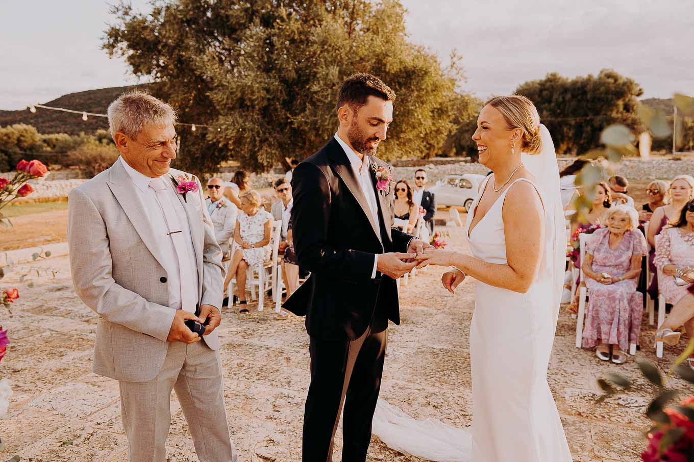 Il rito civile si è svolto all’esterno, a ridosso del tramonto, in uno dei punti più suggestivi della Masseria. Circondati da ulivi monumentali e da una luce dorata che solo la Puglia sa regalare, Aston e Lucy si sono promessi amore eterno in un’atmosfera intima, avvolgente e profondamente autentica. L’emozione era palpabile: la natura, il silenzio rotto solo dalle parole pronunciate e il calore degli affetti più cari hanno creato un momento di rara bellezza.