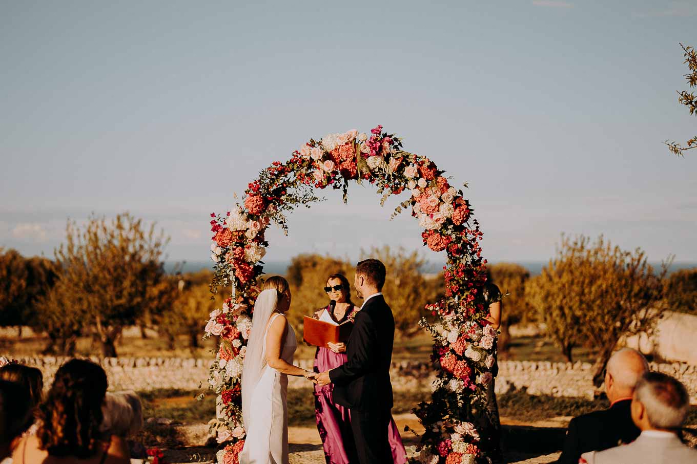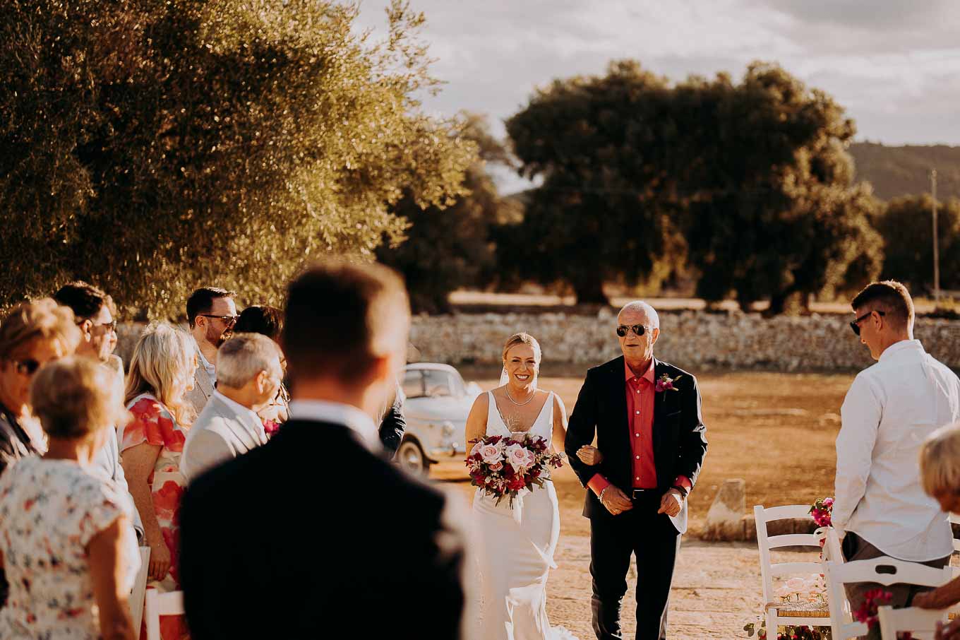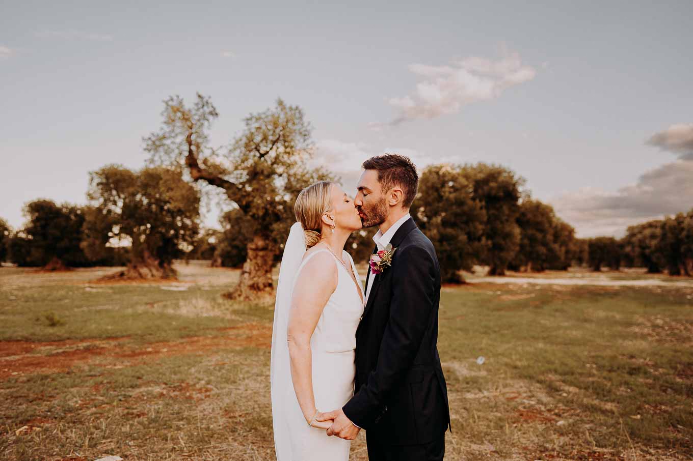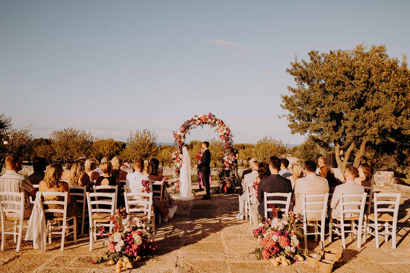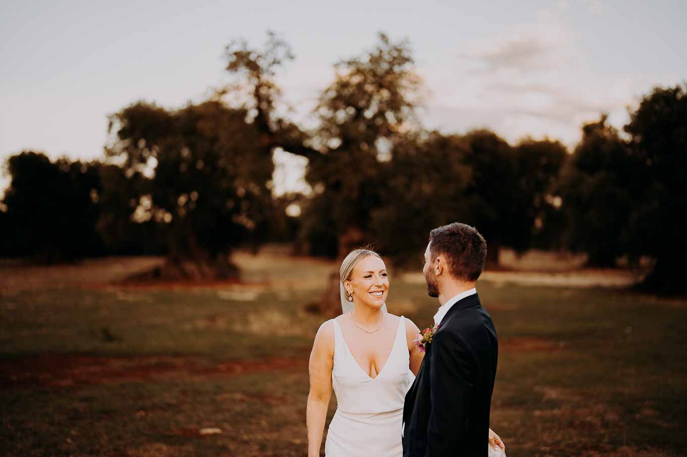 Il rito civile si è svolto all’esterno, a ridosso del tramonto, in uno dei punti più suggestivi della Masseria. Circondati da ulivi monumentali e da una luce dorata che solo la Puglia sa regalare, Aston e Lucy si sono promessi amore eterno in un’atmosfera intima, avvolgente e profondamente autentica. L’emozione era palpabile: la natura, il silenzio rotto solo dalle parole pronunciate e il calore degli affetti più cari hanno creato un momento di rara bellezza.