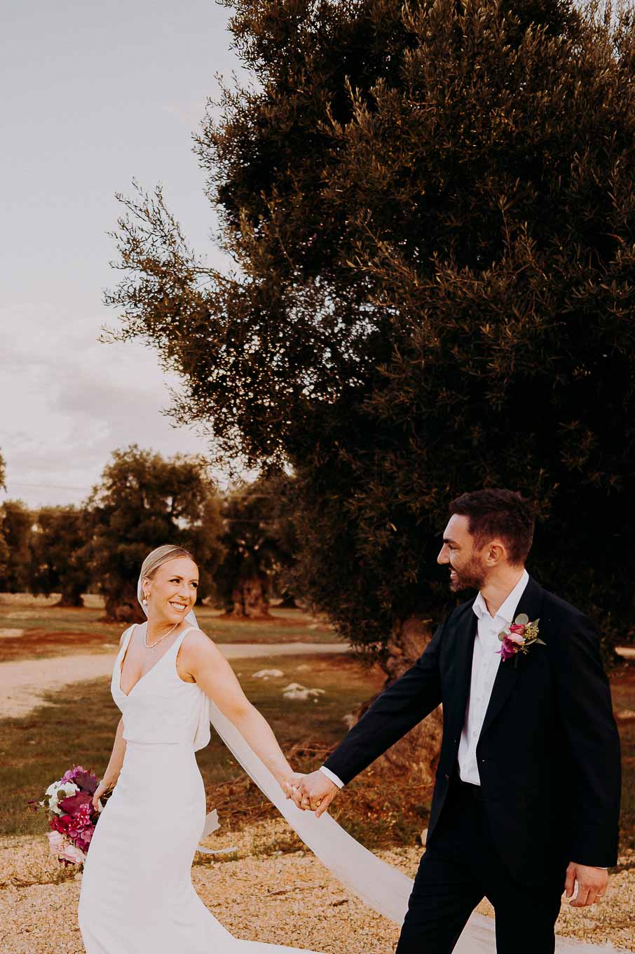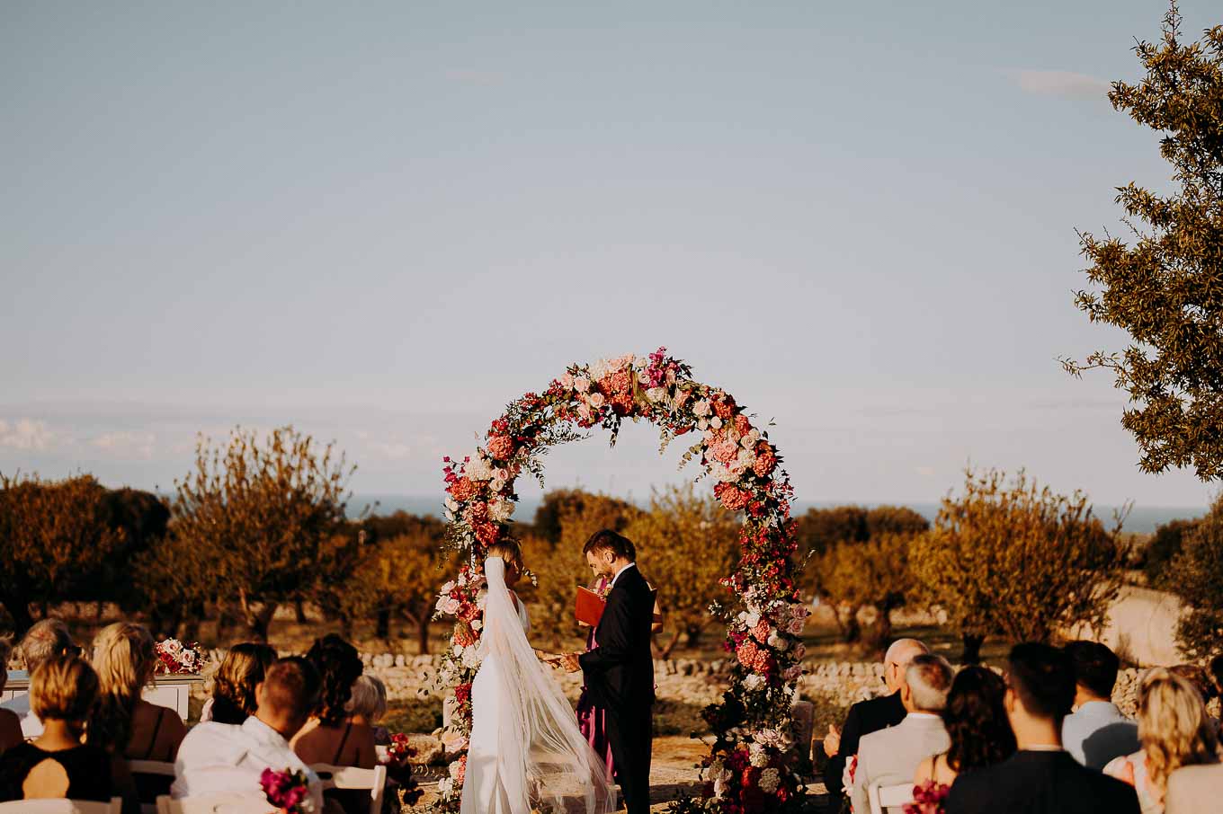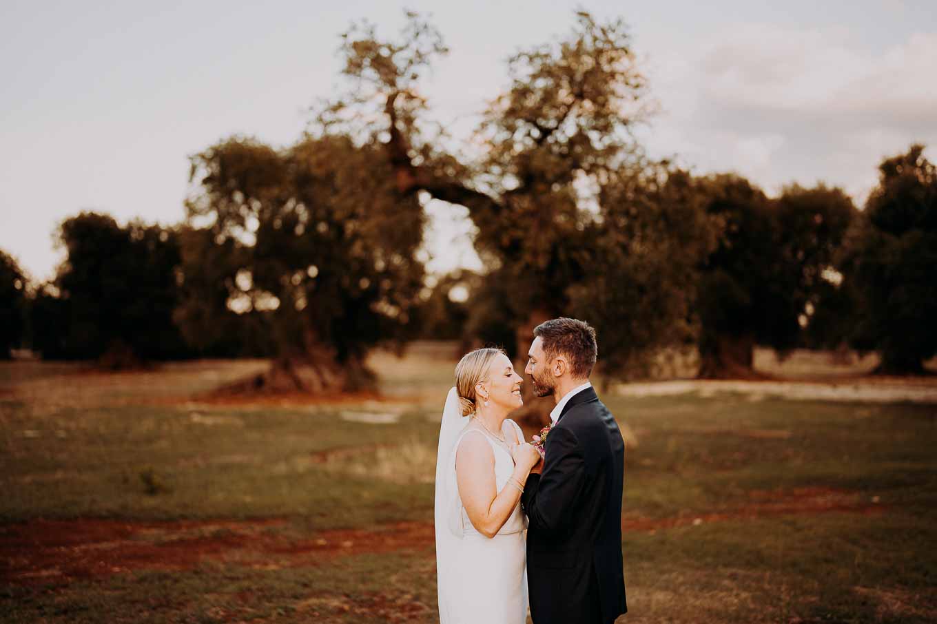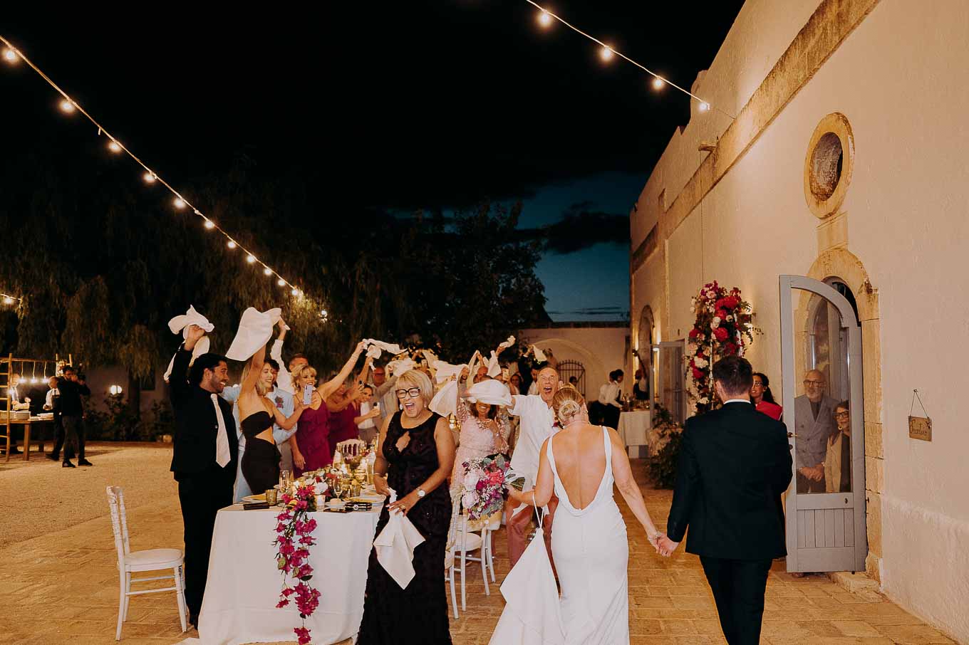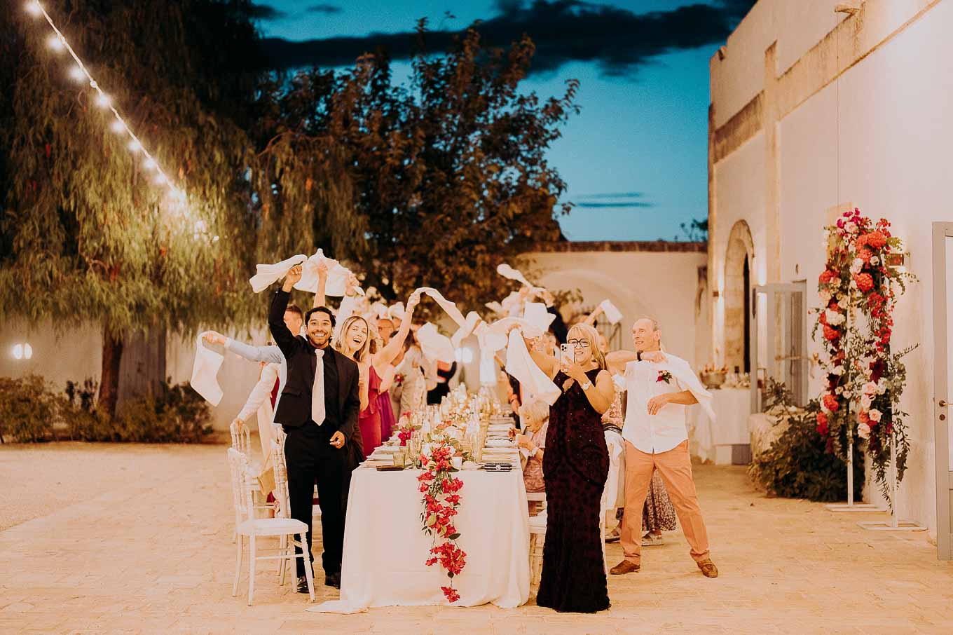 Il rito civile si è svolto all’esterno, a ridosso del tramonto, in uno dei punti più suggestivi della Masseria. Circondati da ulivi monumentali e da una luce dorata che solo la Puglia sa regalare, Aston e Lucy si sono promessi amore eterno in un’atmosfera intima, avvolgente e profondamente autentica. L’emozione era palpabile: la natura, il silenzio rotto solo dalle parole pronunciate e il calore degli affetti più cari hanno creato un momento di rara bellezza.