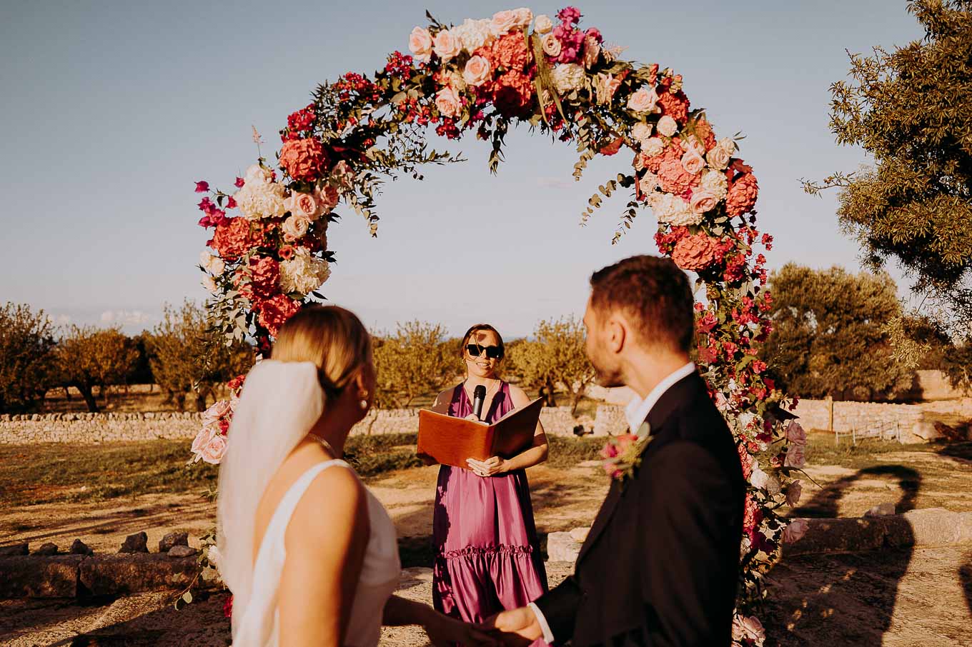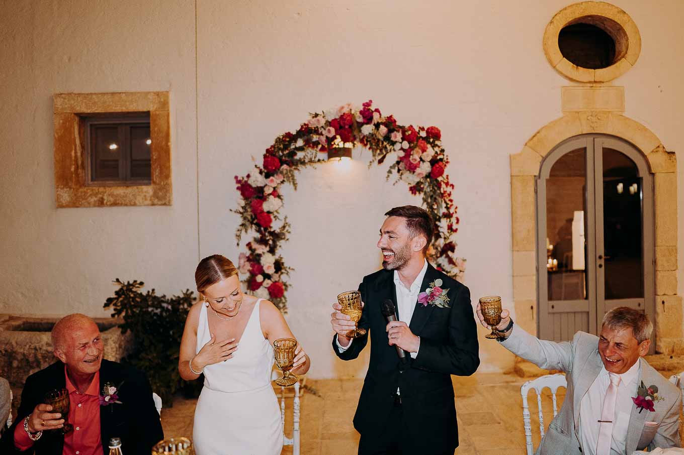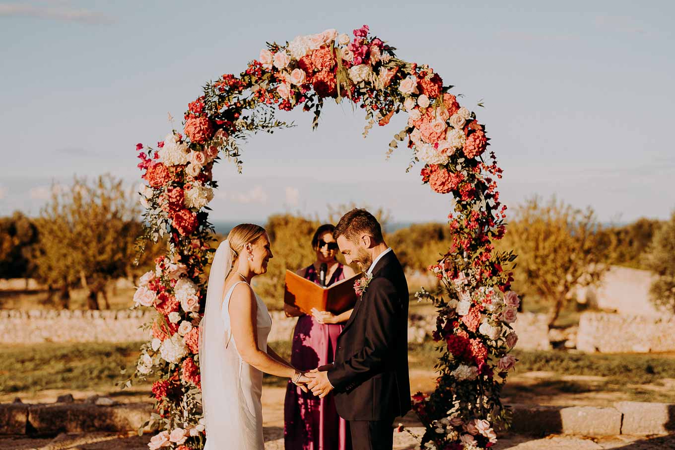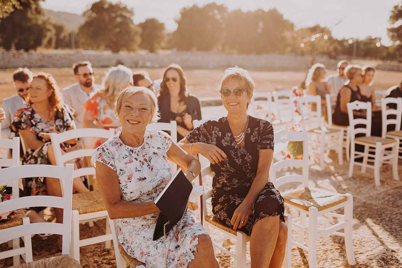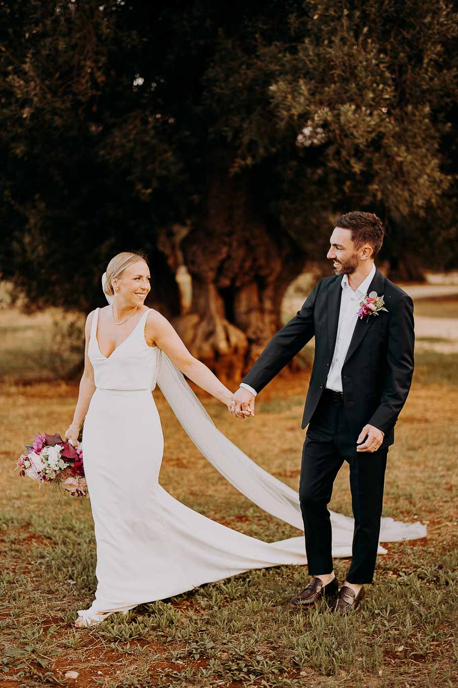 Il rito civile si è svolto all’esterno, a ridosso del tramonto, in uno dei punti più suggestivi della Masseria. Circondati da ulivi monumentali e da una luce dorata che solo la Puglia sa regalare, Aston e Lucy si sono promessi amore eterno in un’atmosfera intima, avvolgente e profondamente autentica. L’emozione era palpabile: la natura, il silenzio rotto solo dalle parole pronunciate e il calore degli affetti più cari hanno creato un momento di rara bellezza.