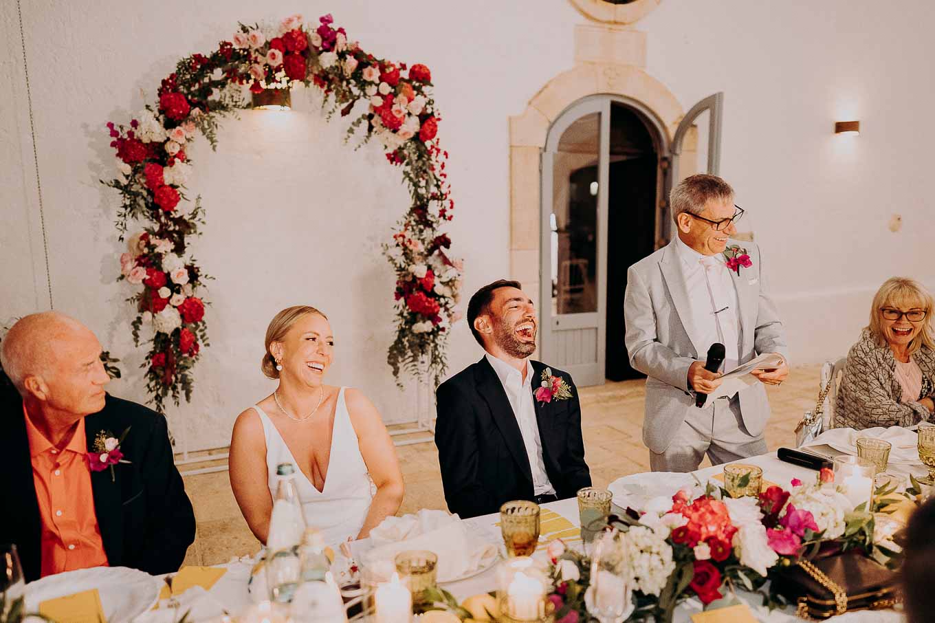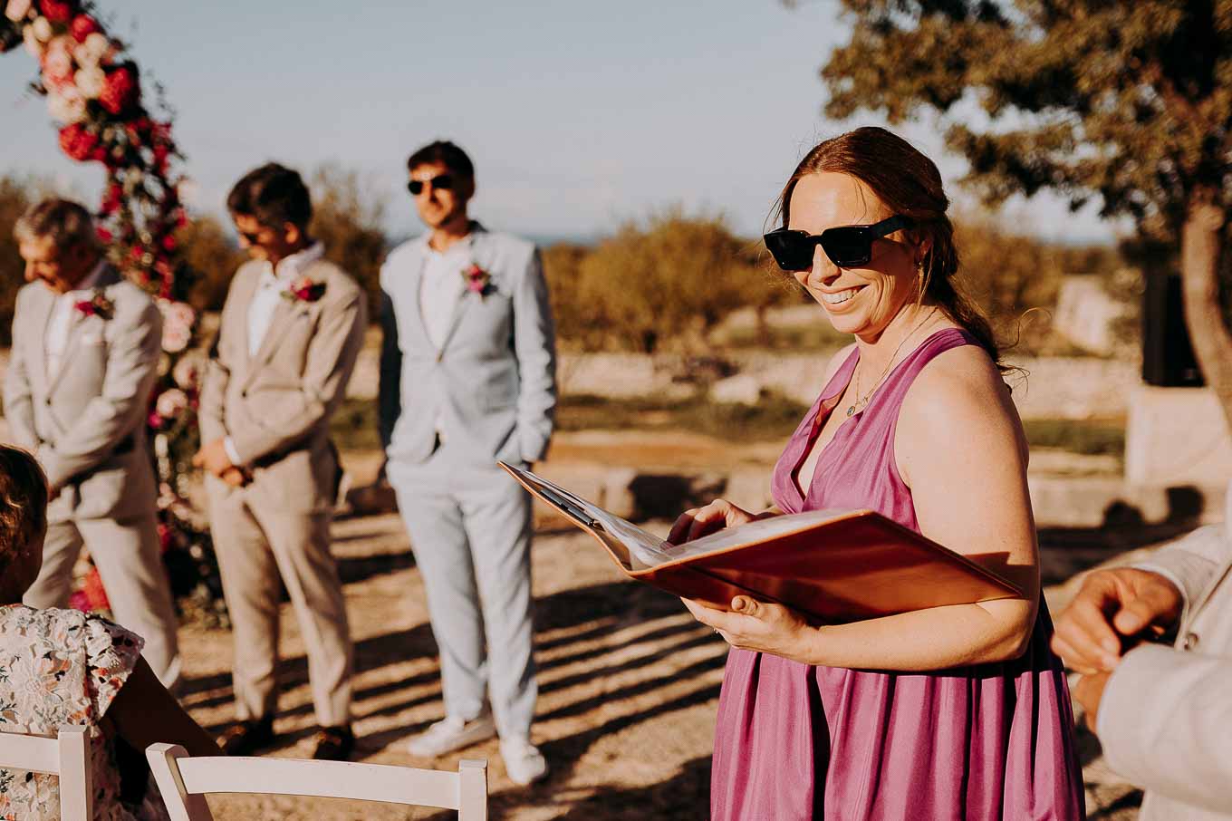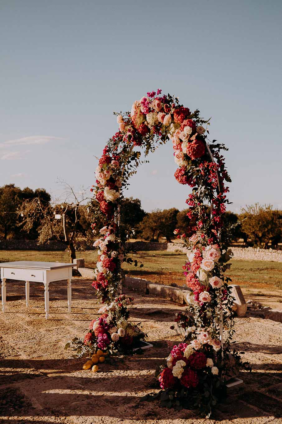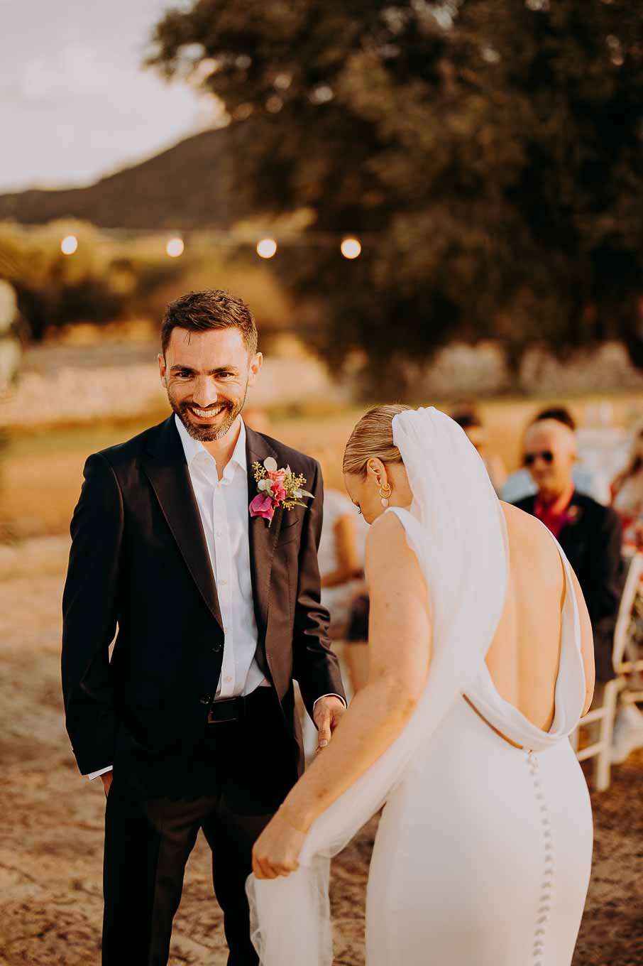 Il rito civile si è svolto all’esterno, a ridosso del tramonto, in uno dei punti più suggestivi della Masseria. Circondati da ulivi monumentali e da una luce dorata che solo la Puglia sa regalare, Aston e Lucy si sono promessi amore eterno in un’atmosfera intima, avvolgente e profondamente autentica. L’emozione era palpabile: la natura, il silenzio rotto solo dalle parole pronunciate e il calore degli affetti più cari hanno creato un momento di rara bellezza.