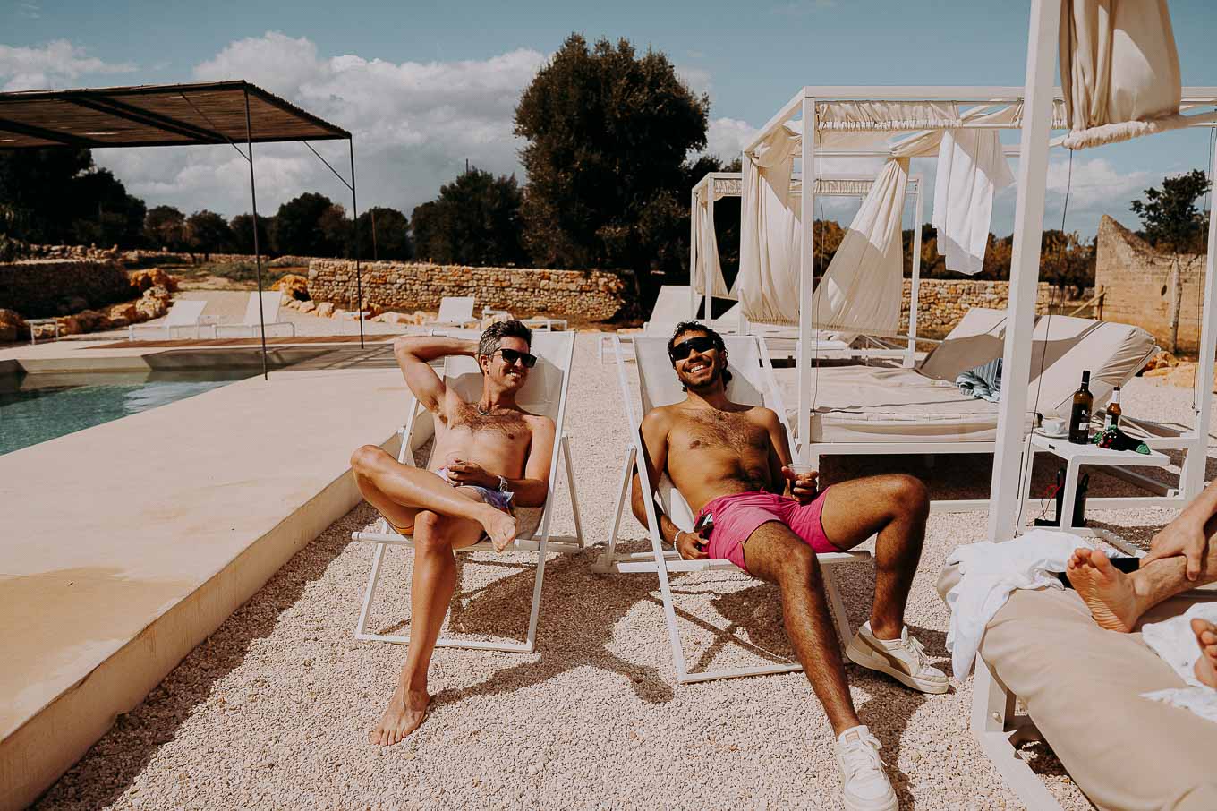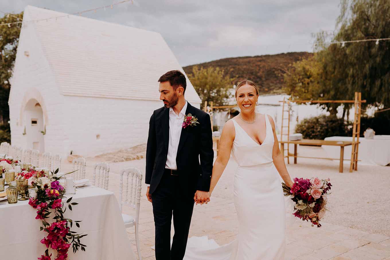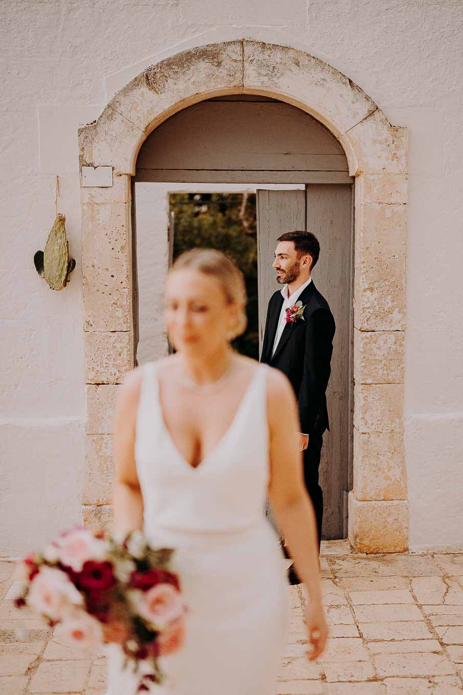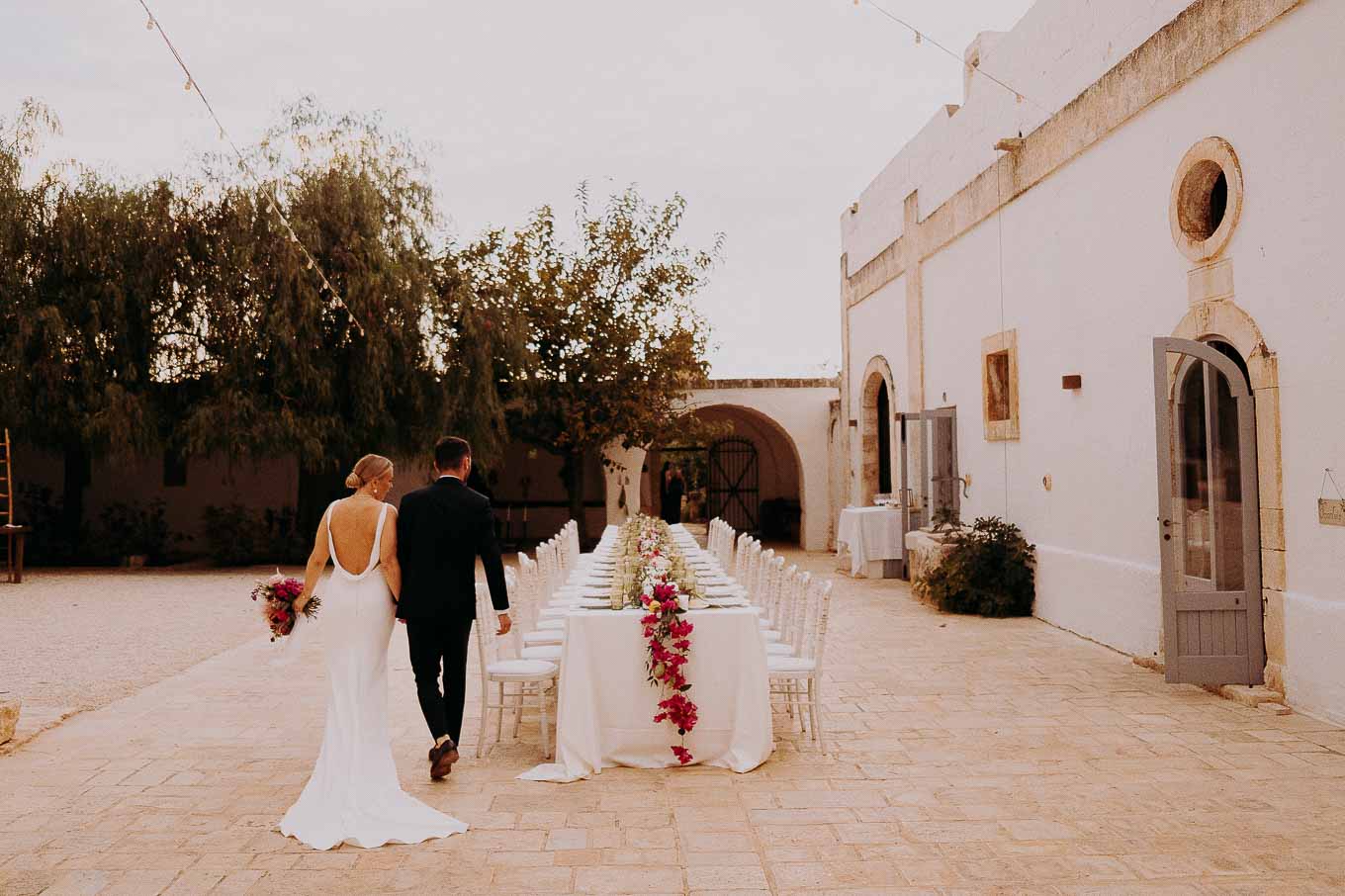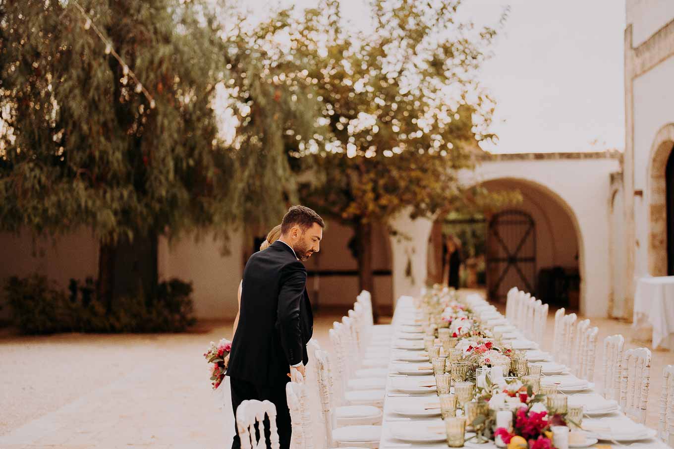 Dopo il rito, gli ospiti sono stati accolti con un elegante rinfresco, servito negli spazi esterni della masseria. Prodotti locali, bollicine e piccoli assaggi gourmet hanno accompagnato la socializzazione in un contesto rilassato e curato. Nel frattempo, Aston e Lucy si sono concessi qualche scatto di coppia tra i tanti scorci offerti dalla Masseria: dal frantoio in pietra alla piscina, dai viali alberati alle terrazze panoramiche, ogni angolo raccontava una storia e diventava sfondo perfetto per le loro foto.