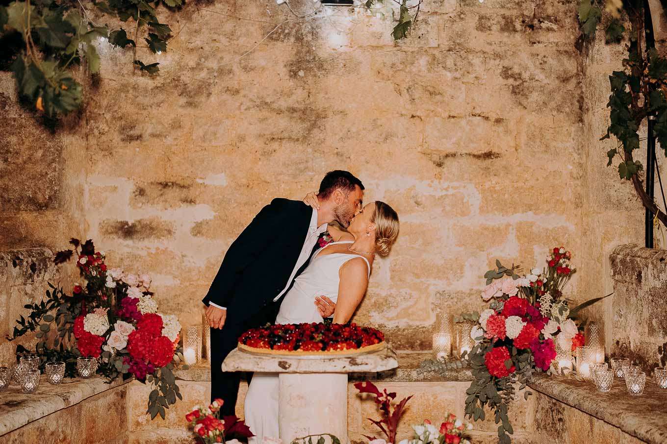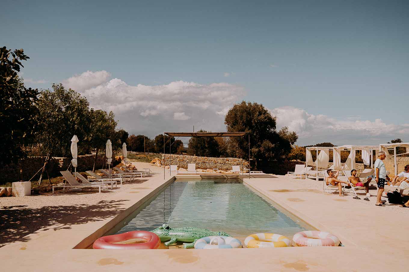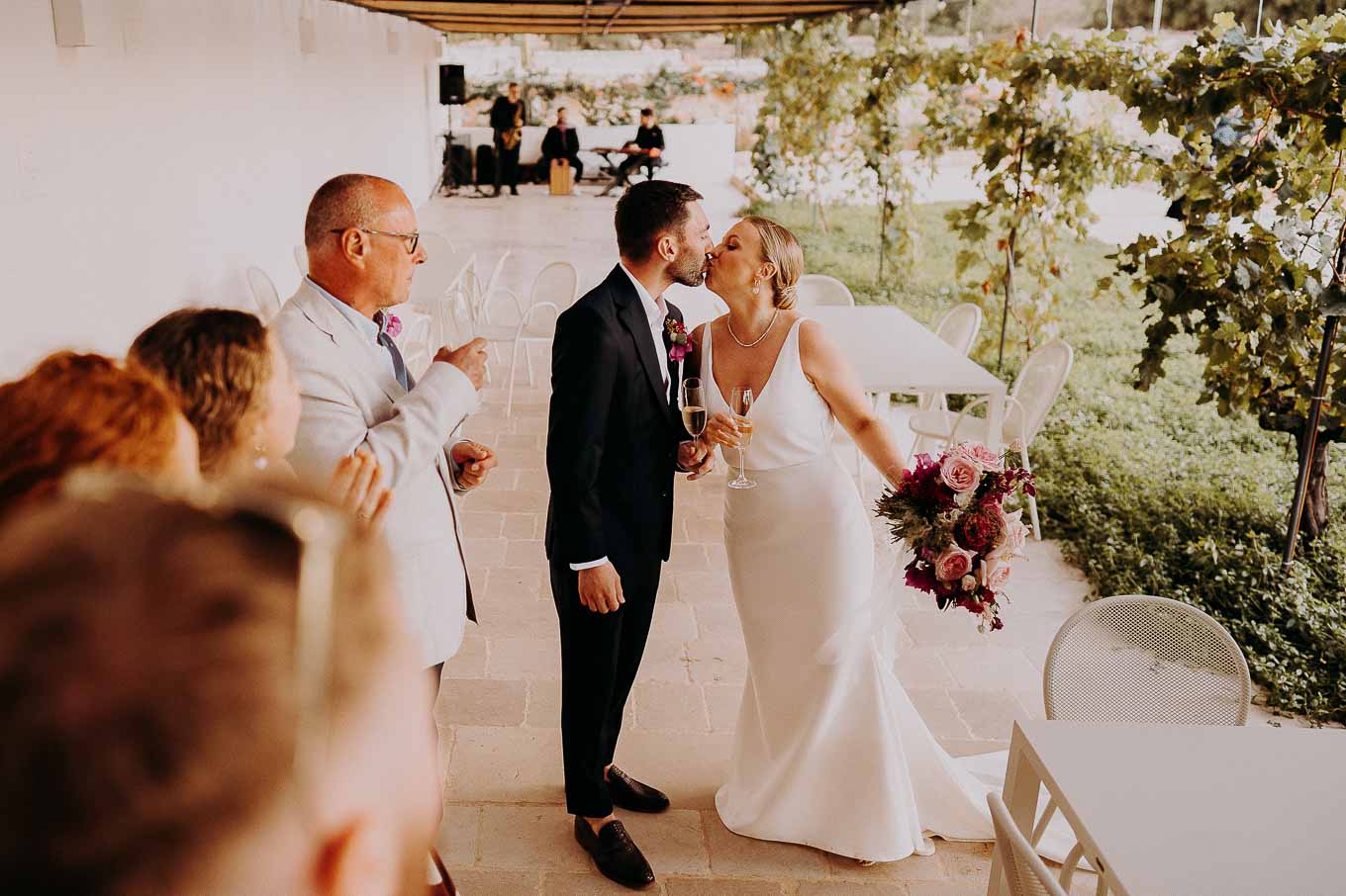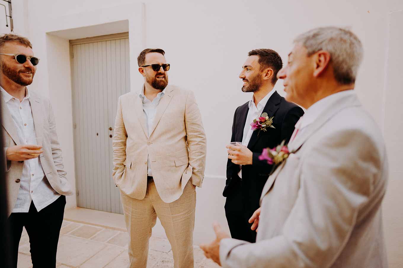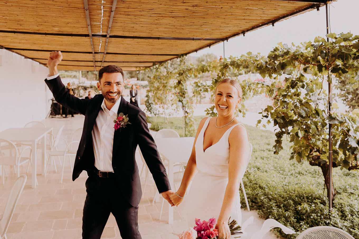 Dopo il rito, gli ospiti sono stati accolti con un elegante rinfresco, servito negli spazi esterni della masseria. Prodotti locali, bollicine e piccoli assaggi gourmet hanno accompagnato la socializzazione in un contesto rilassato e curato. Nel frattempo, Aston e Lucy si sono concessi qualche scatto di coppia tra i tanti scorci offerti dalla Masseria: dal frantoio in pietra alla piscina, dai viali alberati alle terrazze panoramiche, ogni angolo raccontava una storia e diventava sfondo perfetto per le loro foto.