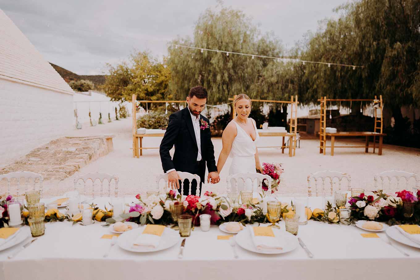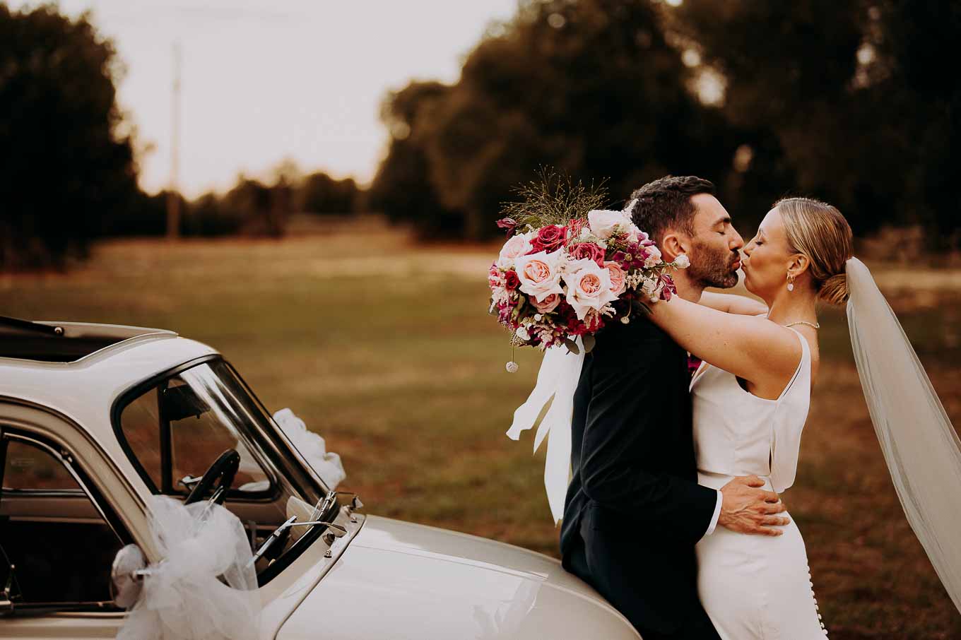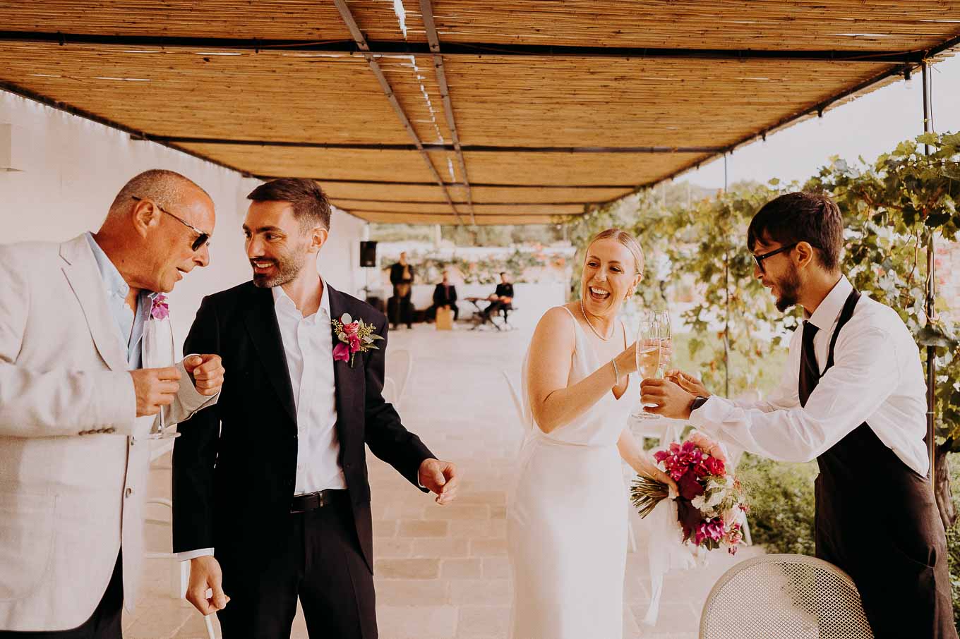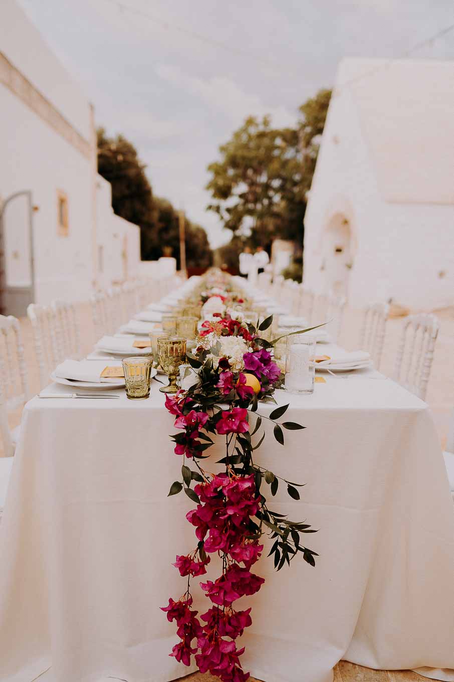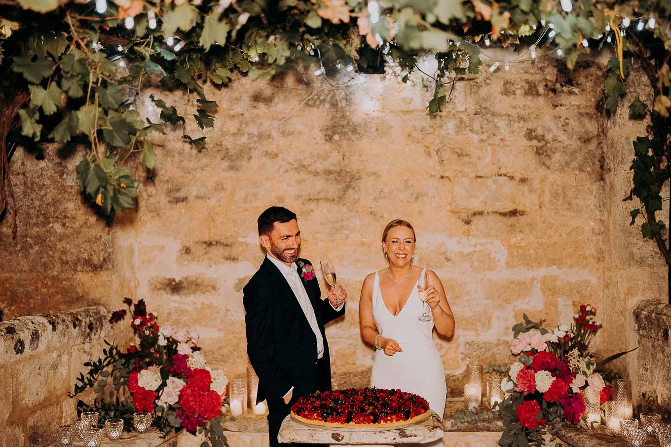 Dopo il rito, gli ospiti sono stati accolti con un elegante rinfresco, servito negli spazi esterni della masseria. Prodotti locali, bollicine e piccoli assaggi gourmet hanno accompagnato la socializzazione in un contesto rilassato e curato. Nel frattempo, Aston e Lucy si sono concessi qualche scatto di coppia tra i tanti scorci offerti dalla Masseria: dal frantoio in pietra alla piscina, dai viali alberati alle terrazze panoramiche, ogni angolo raccontava una storia e diventava sfondo perfetto per le loro foto.
